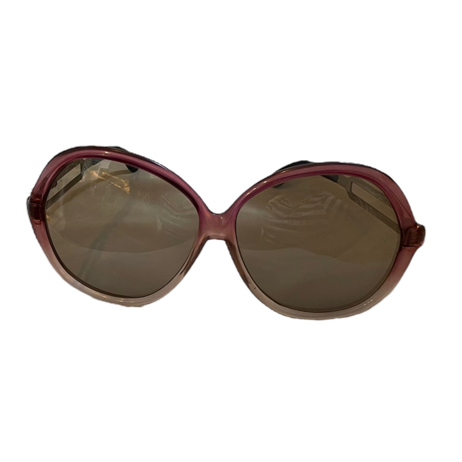 LENTES DE SOL OVERSIZED REDONDAS, MONTADURA EN TONOS CIRUELA, PATAS DE METAL CALADO EN PLATA MATE, MICAS CON TINTURA CAFE.