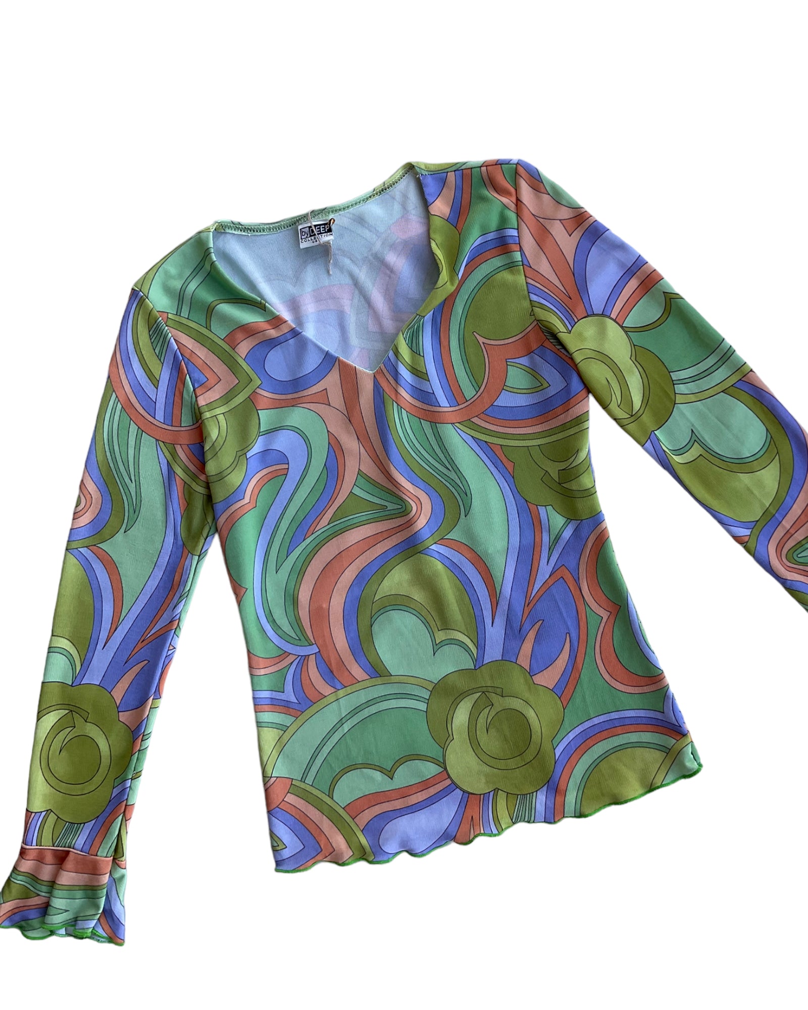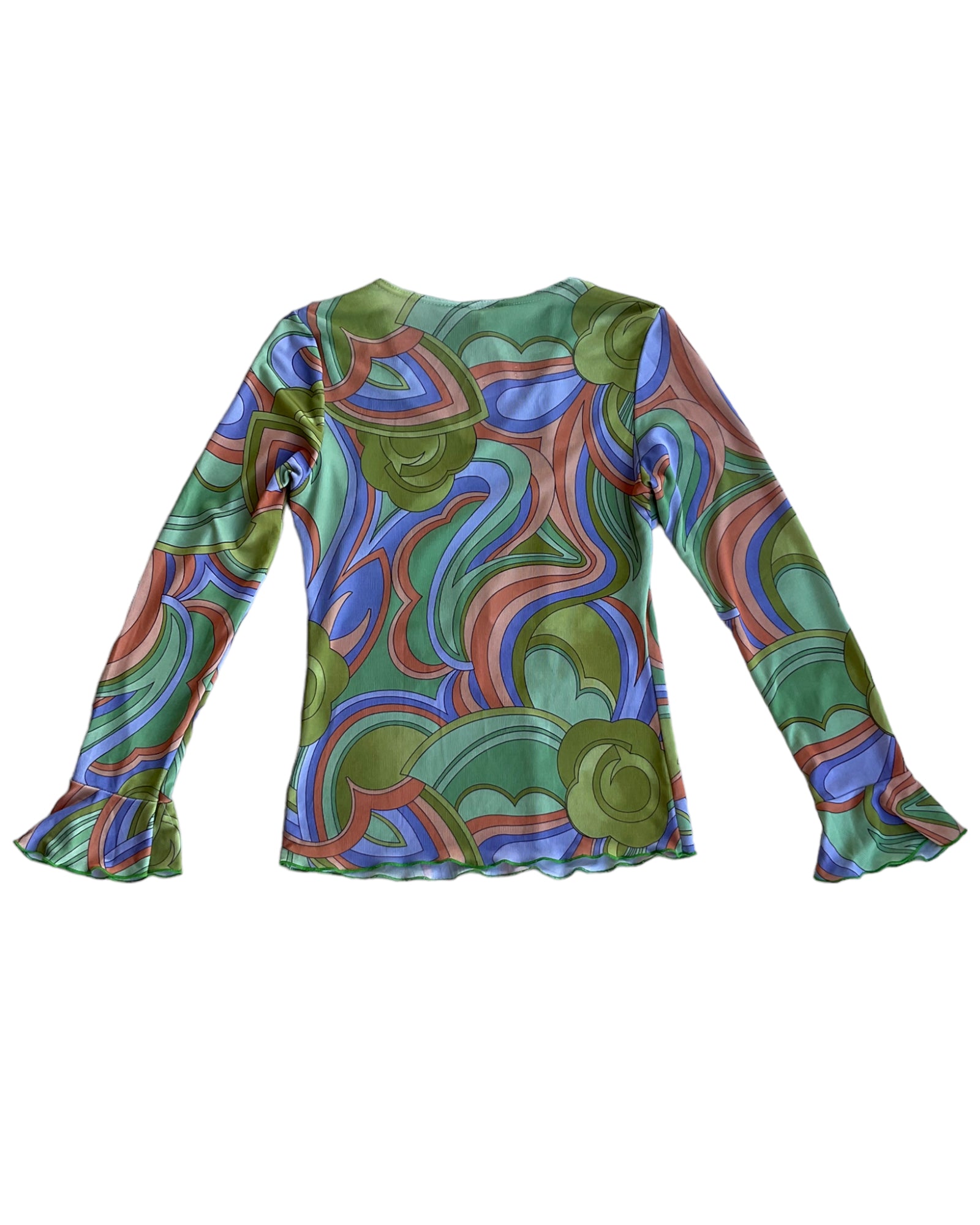 TOP MICRO MESH GROOVY PRINT. NARANJA, VERDE Y MORADO. MANGAS ACAMPANADAS. SIN DETALLES
