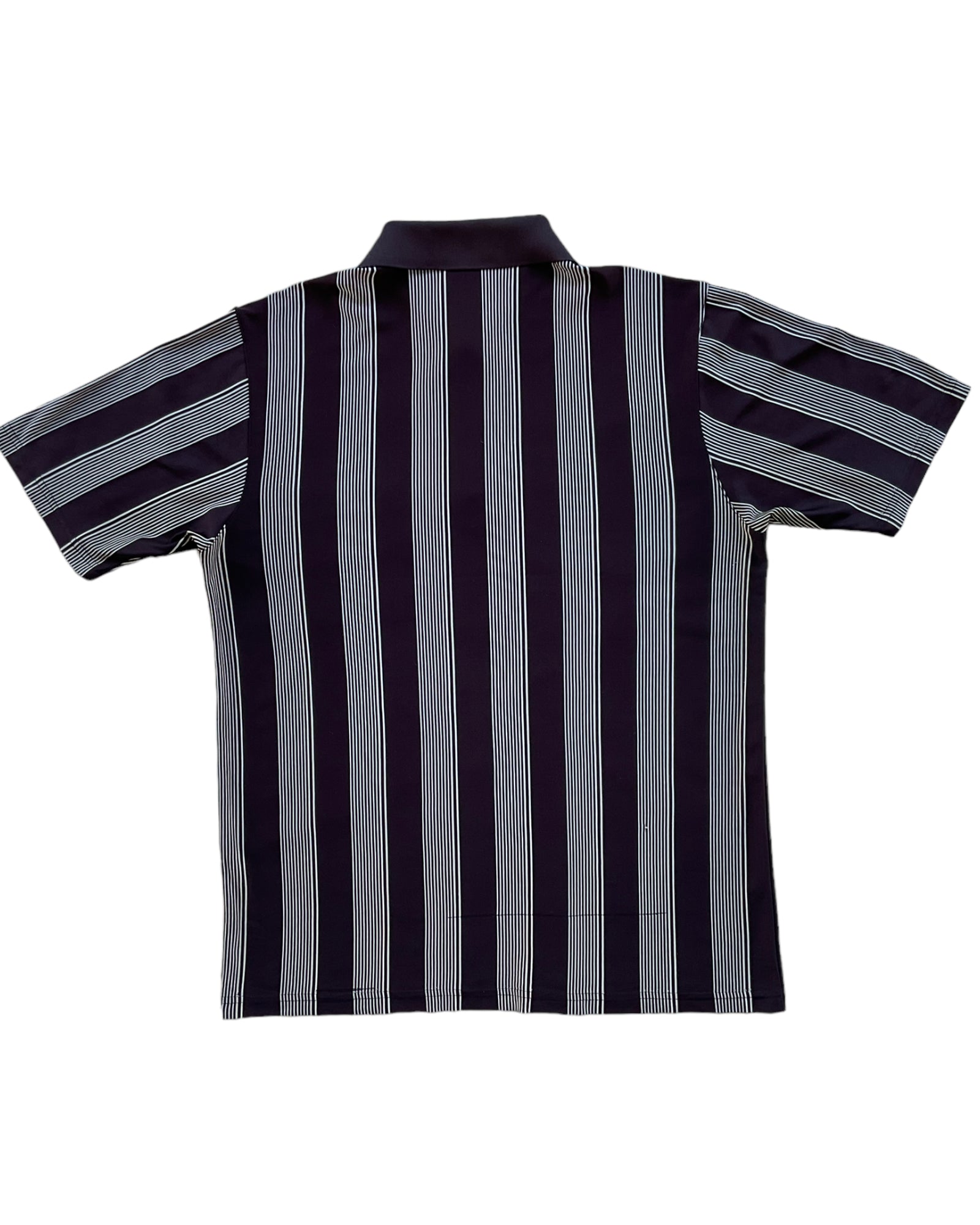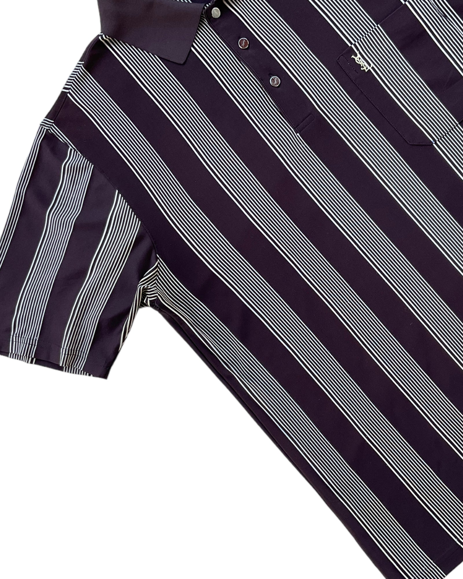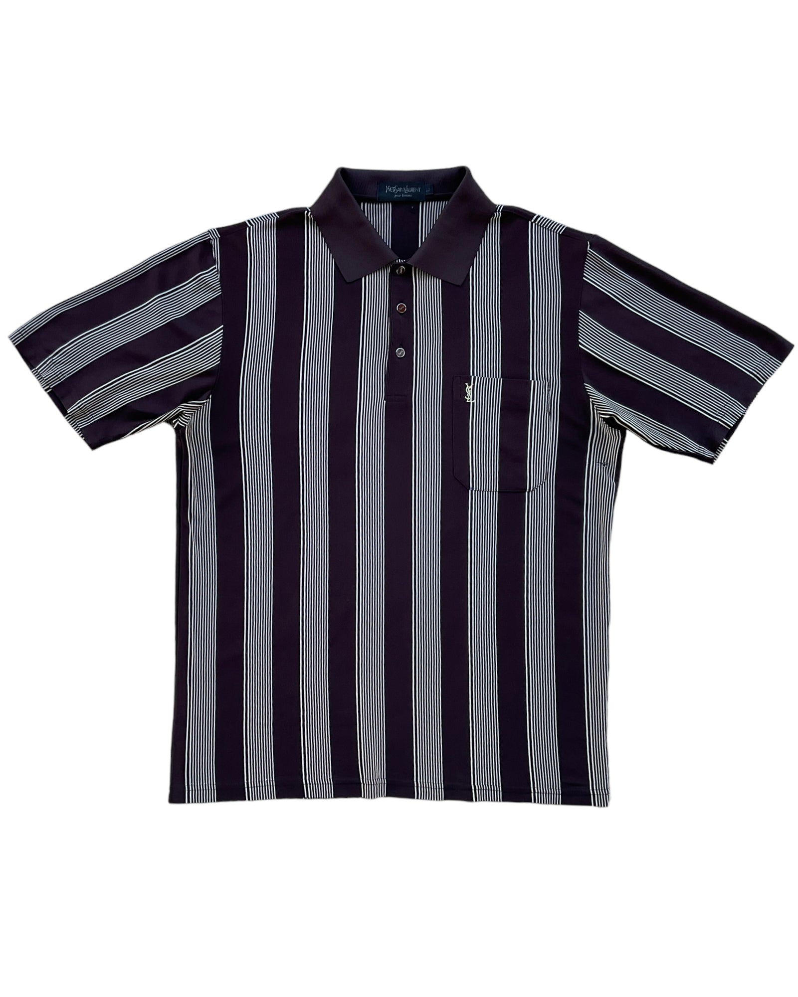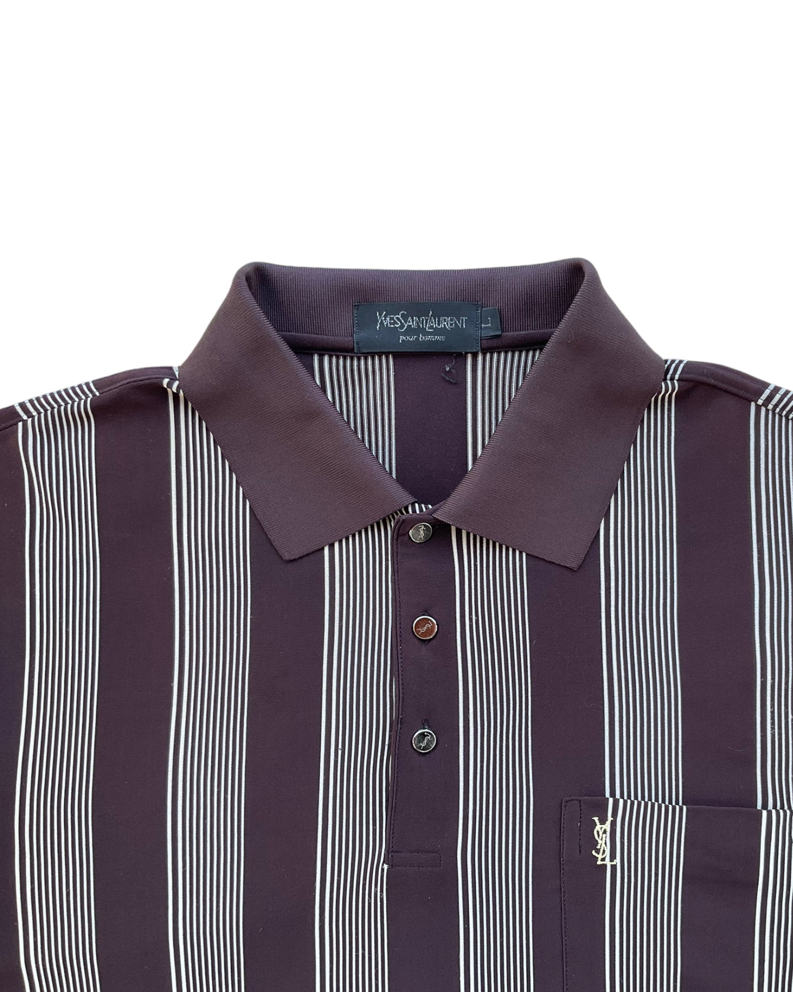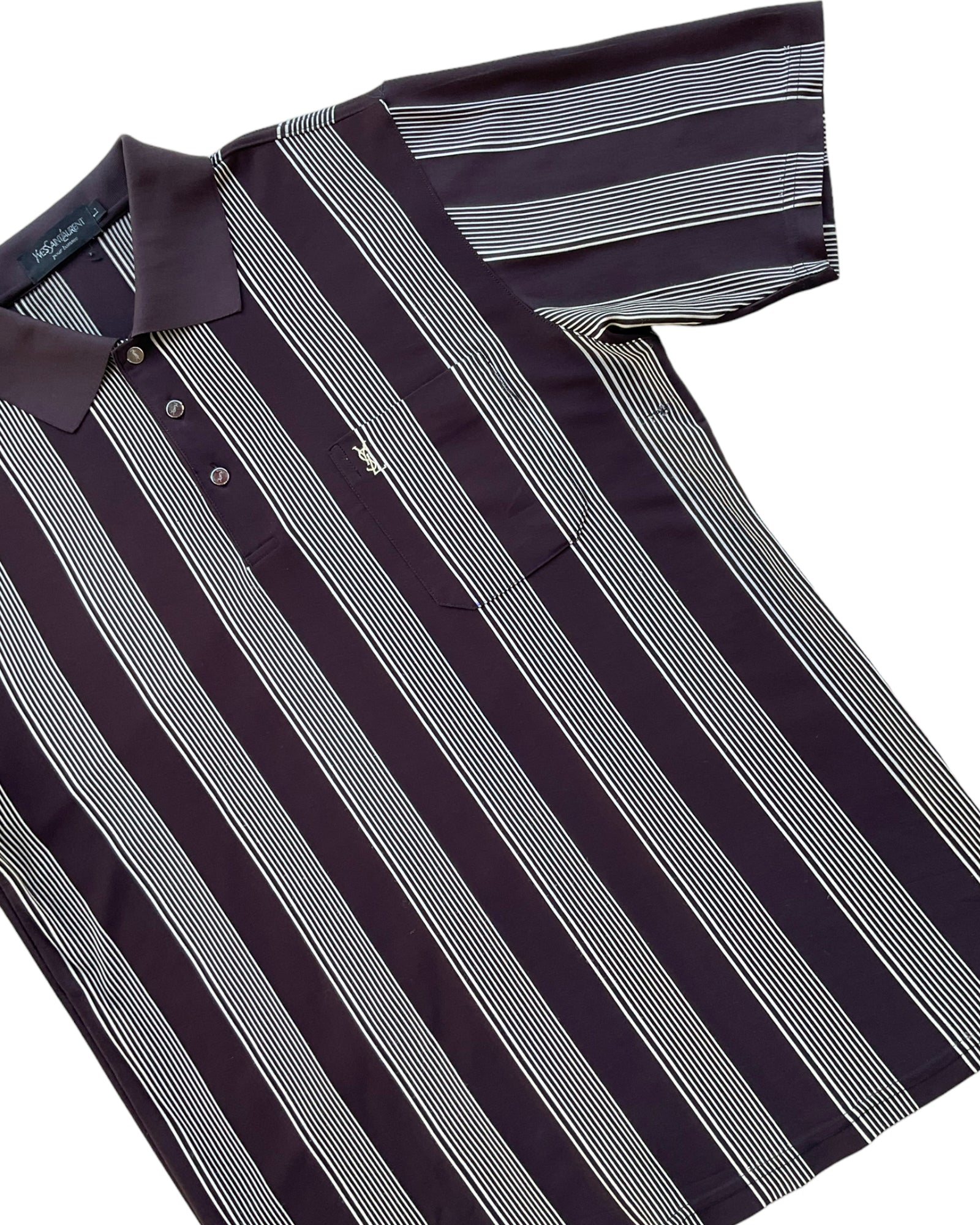PLAYERA TIPO POLO EN COLOR CAFÉ OSCURO CON RAYAS VERTICALES COLOR CREMA, BOLSILLO FORNTAL CON EL LOGO DE YSL BORDADO Y BOTONES PLATEADOS EN EL CUELLO CON YSL GRABADO. PEQUEÑO AGUJERO DEBAJO DE LA AXILA IZQUIERDA, LIGERO DESGARRE EN LA TELA POR ANTIGÜEDAD.
