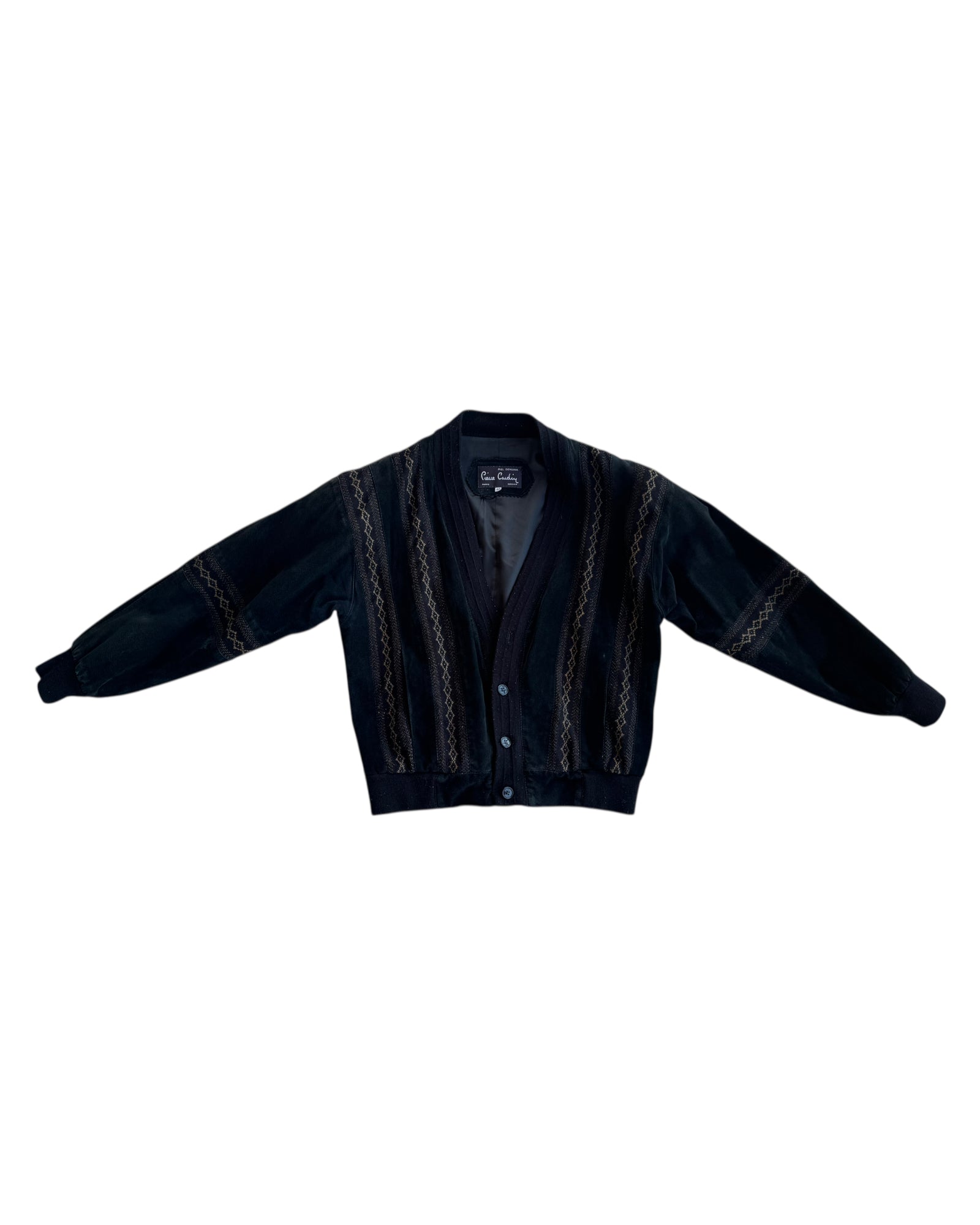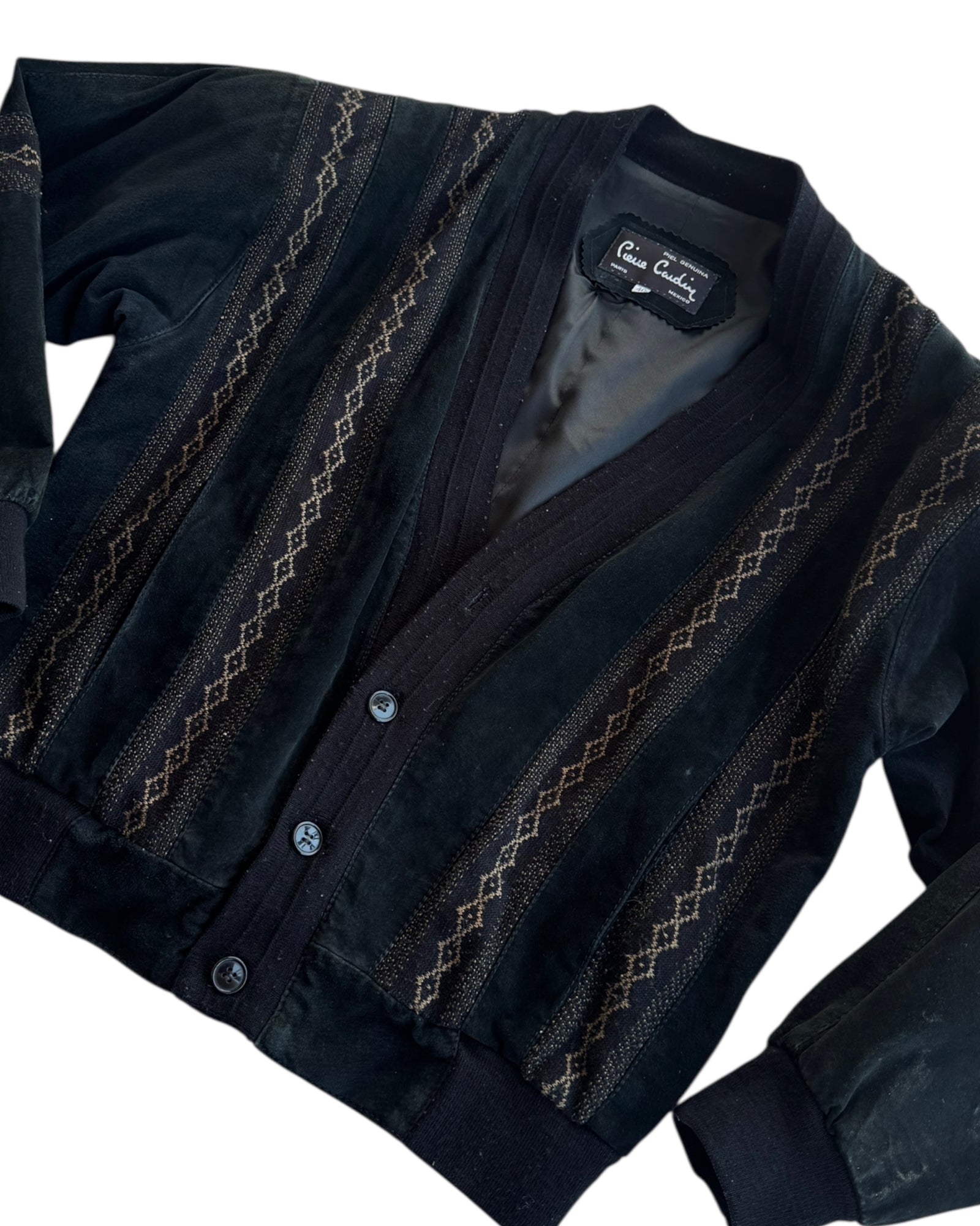 CHAMARRA DE PIEL GENUINA CON CUELLO EN V Y BOTONES GRANDES PARA AMARRAR, HOMBRERAS Y ESTILO BOMBER DE LOS 80S. PANELES TEJIDOS. NO TIENE DETALLES, EN PERFECTO ESTADO.