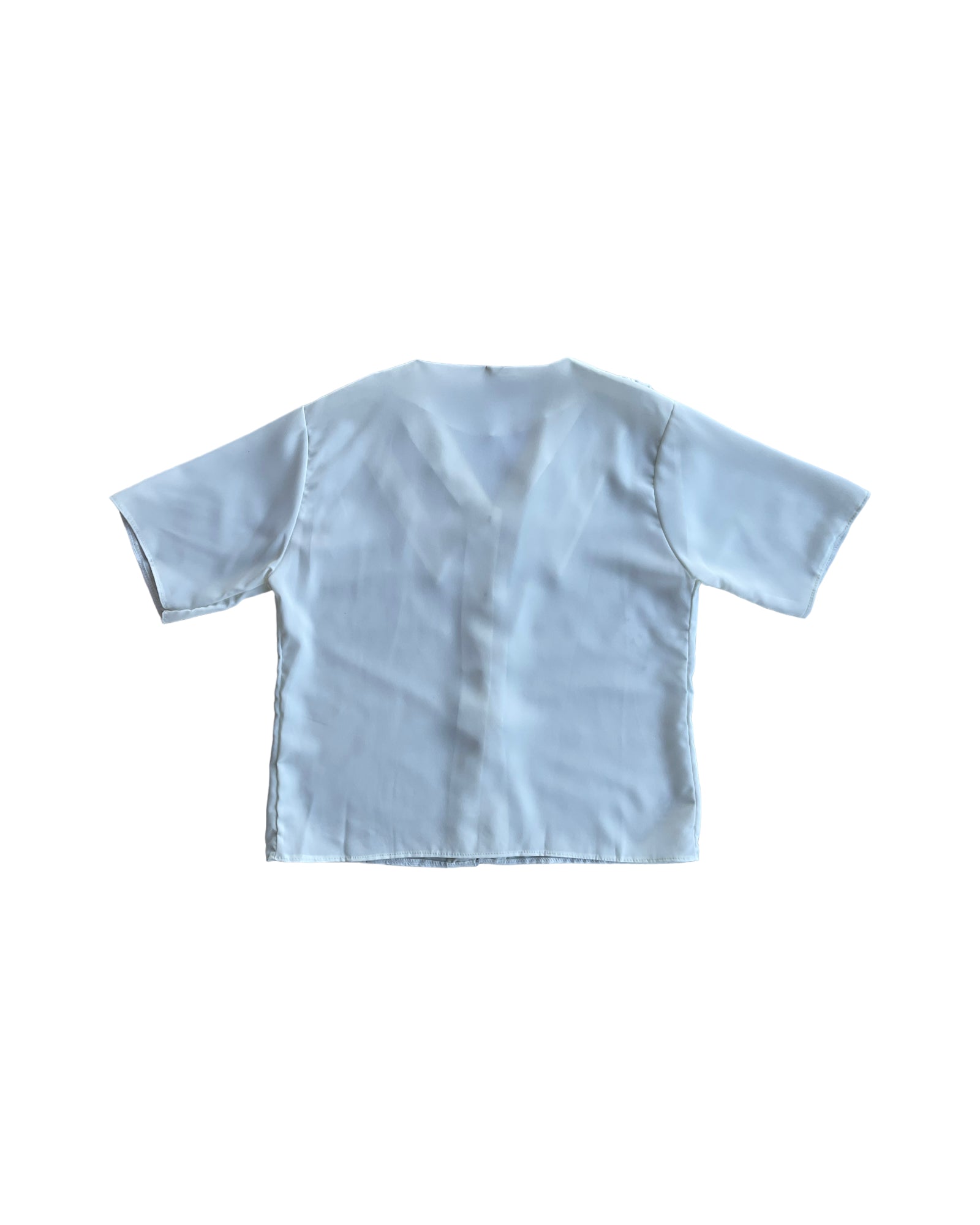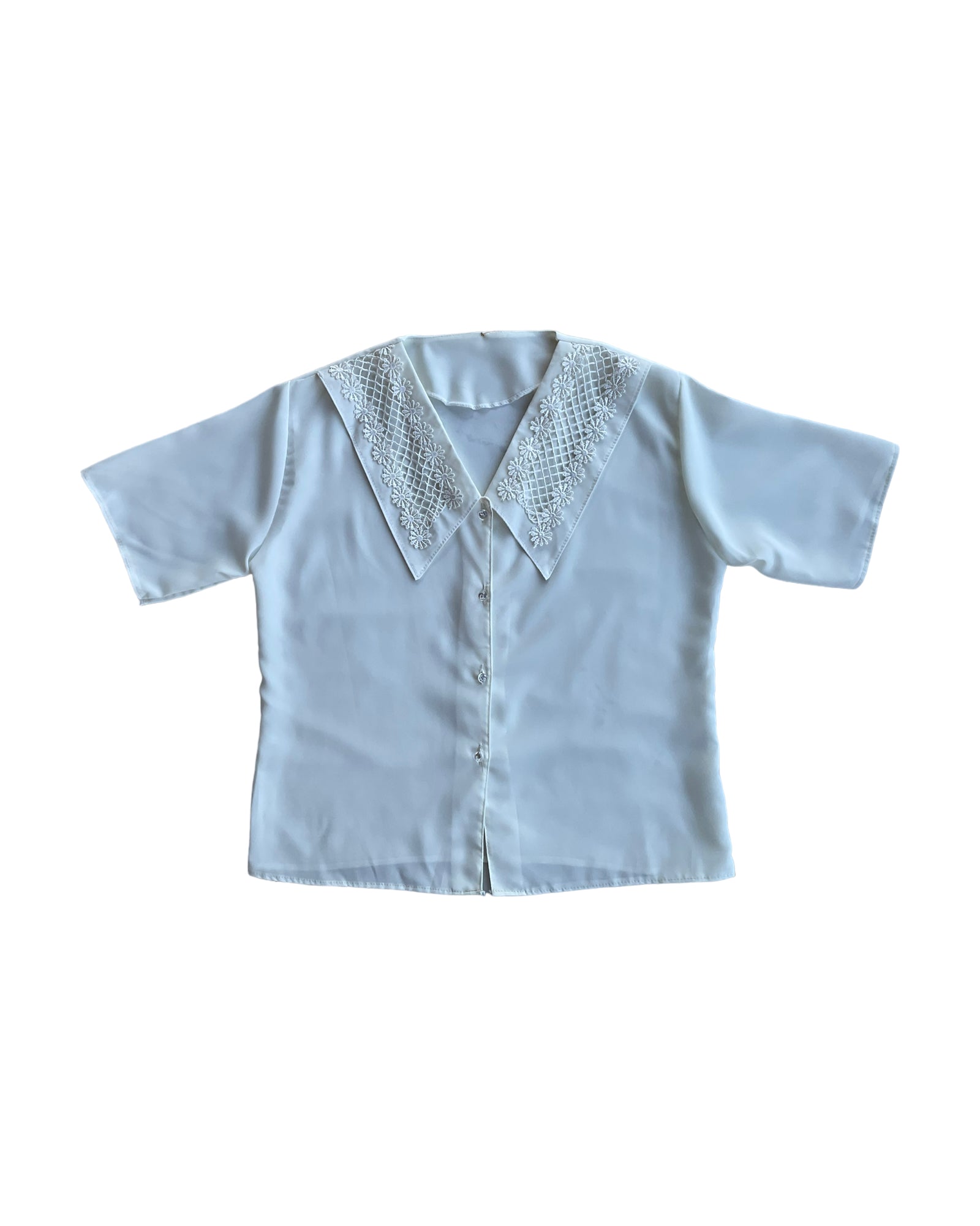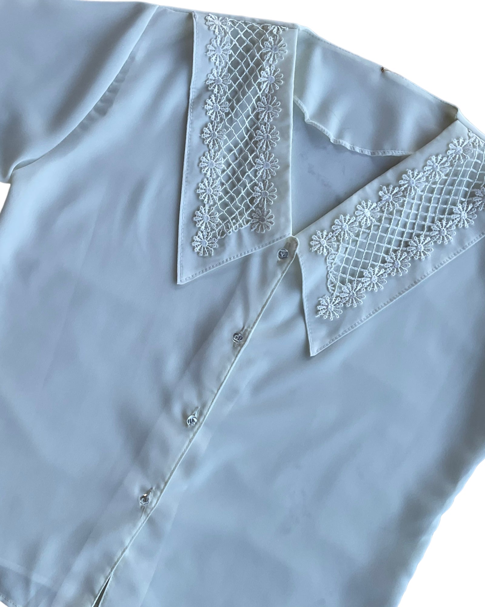 BLUSA DE BOTONES COLOR BLANCO CON DETALLE TIPO ENCAJE DE FLORES EN EL CUELLO.. BOTONES TRANSPARENTE. SIN DETALLES DE USO.