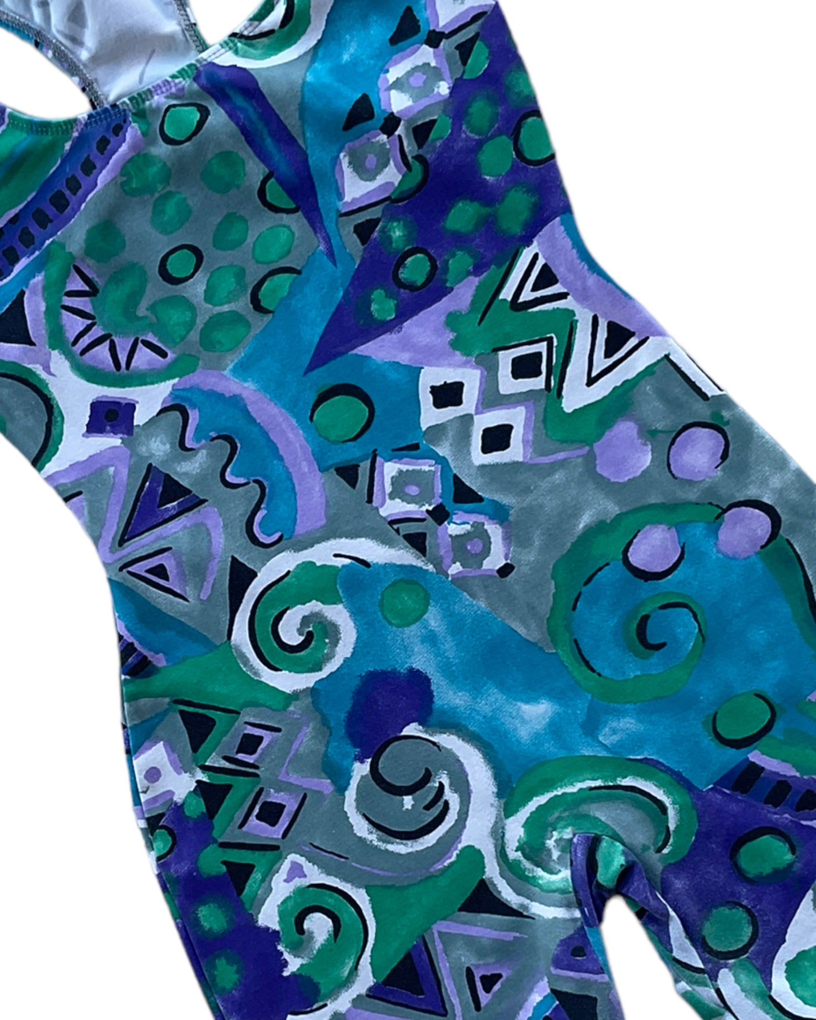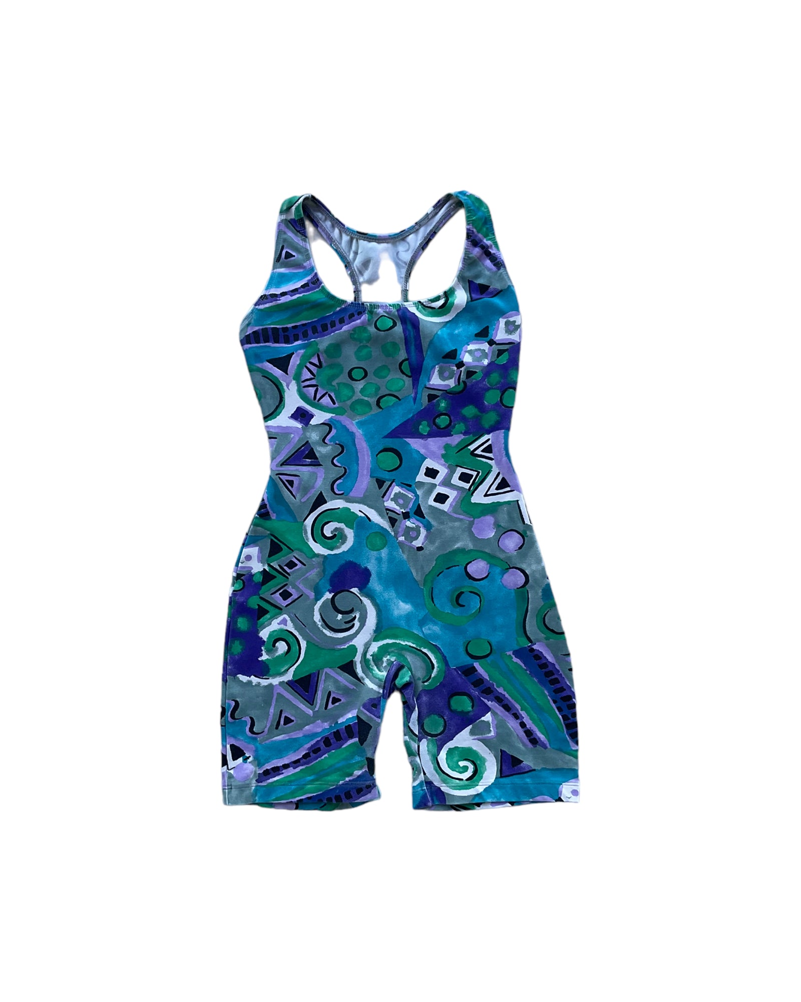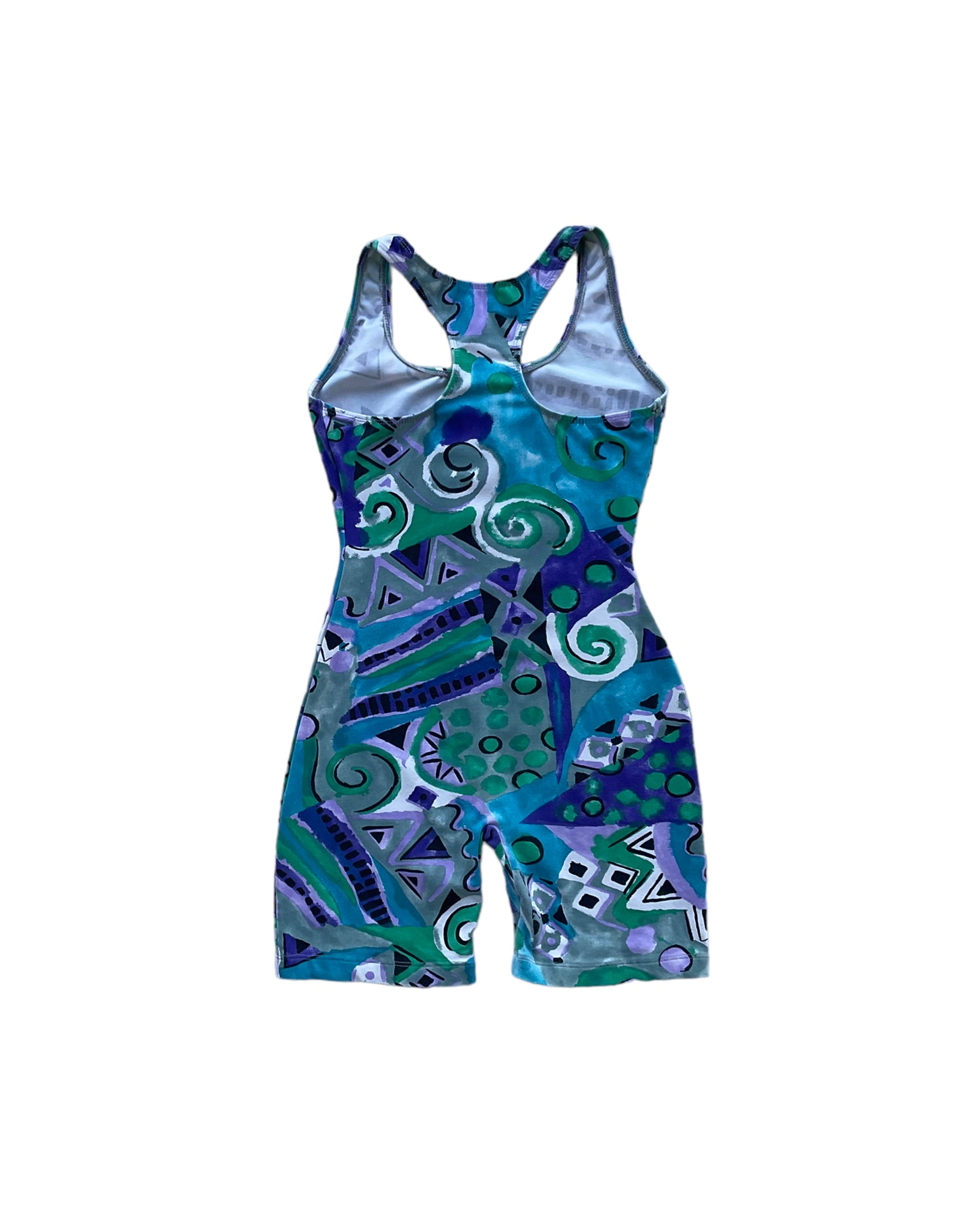 LEOTARDO TIPO SHORT SIN MANGAS 86% SUPPLEX, 14% LYCRA CON ESTAMPADO DE COLORES AZUL, MORADO, VERDE Y GRIS. SIN DETALLES DE USO.