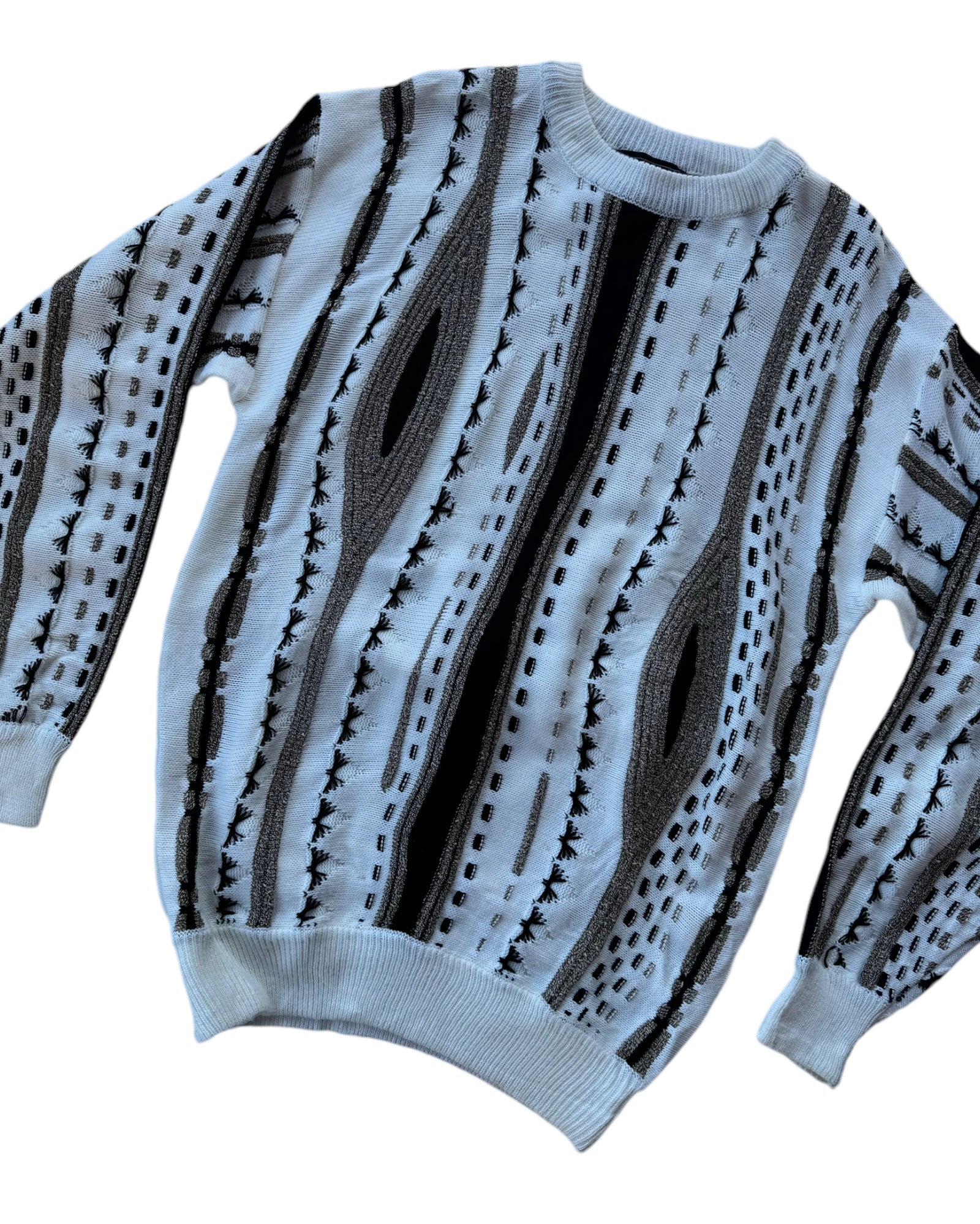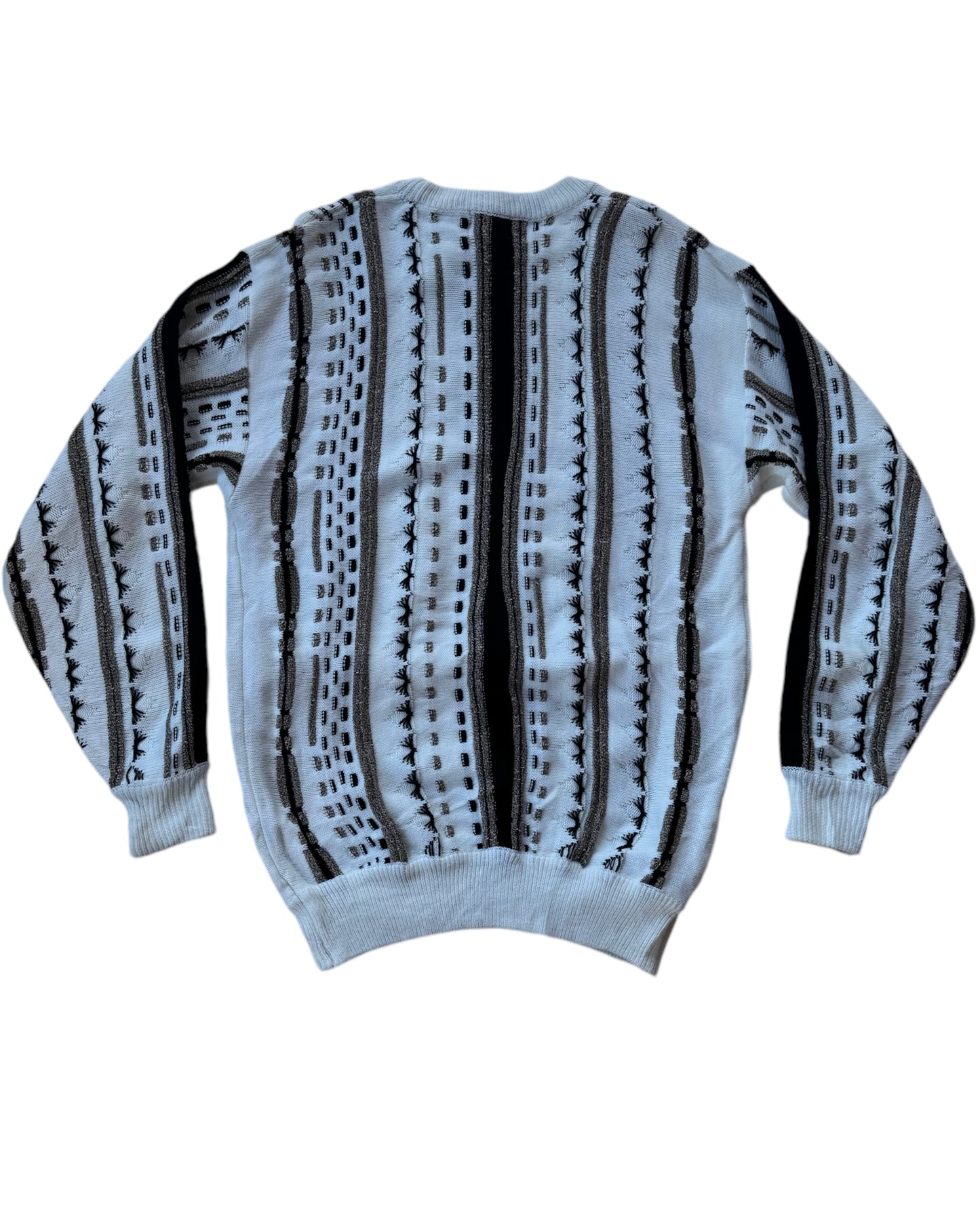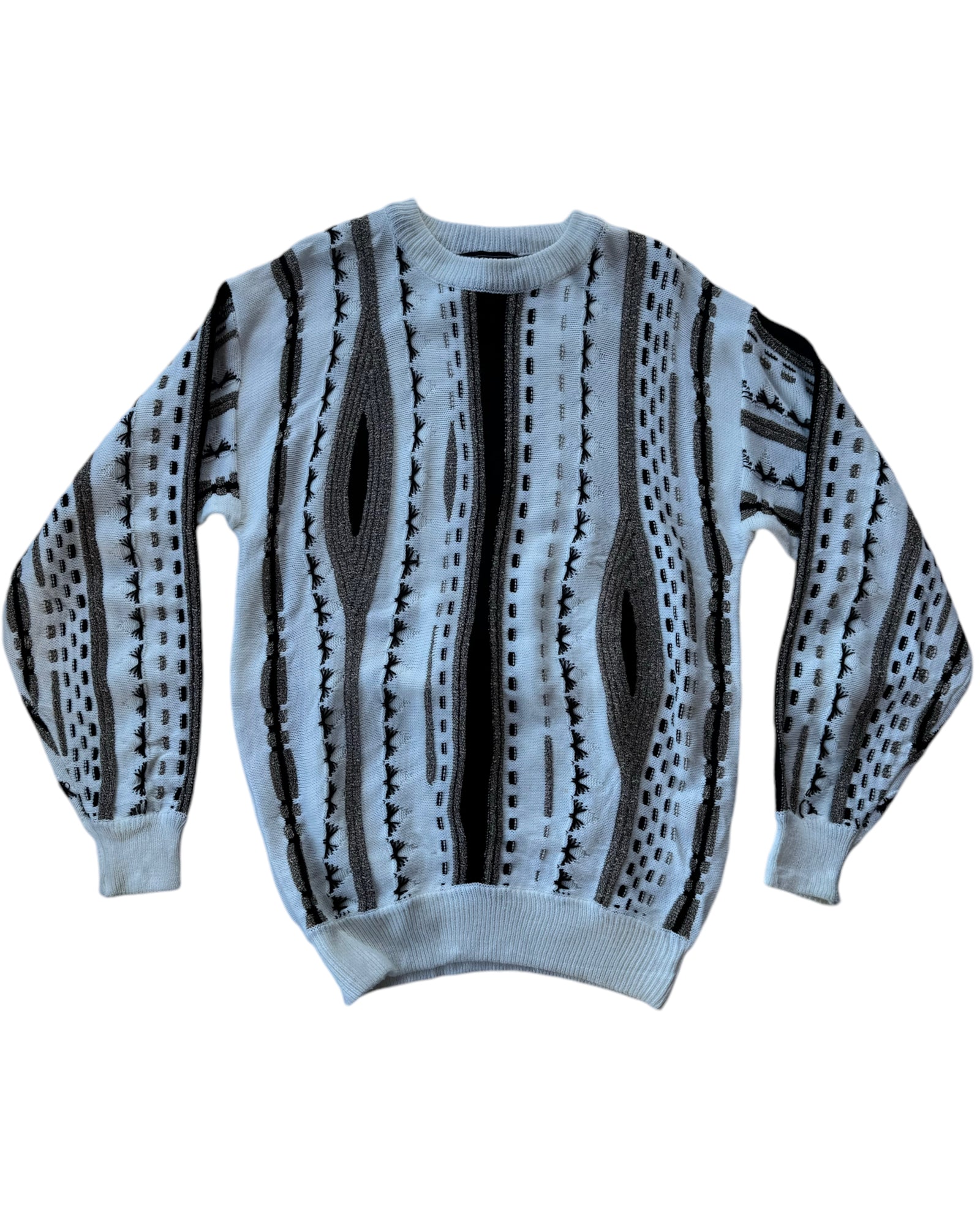 SUETER 97% ACRILICO 3% POLYESTER BLANCO CON PATRON ESTLO COOGI EN COLOR CAFE Y NEGRO. SIN DETALLES DE USO