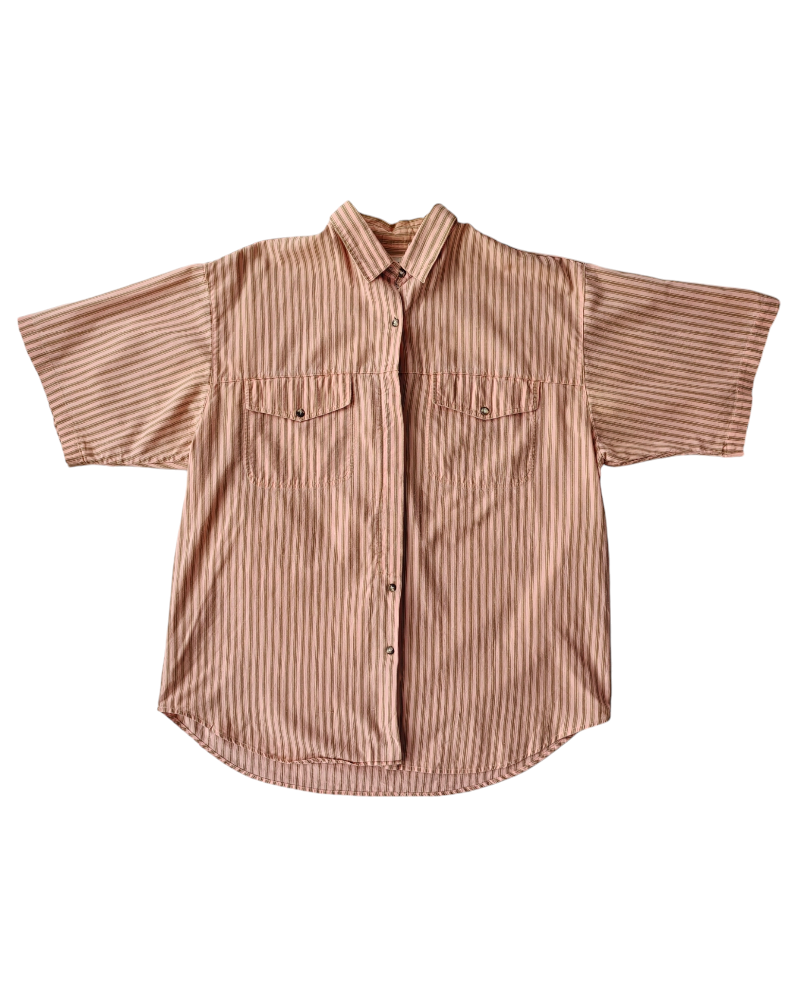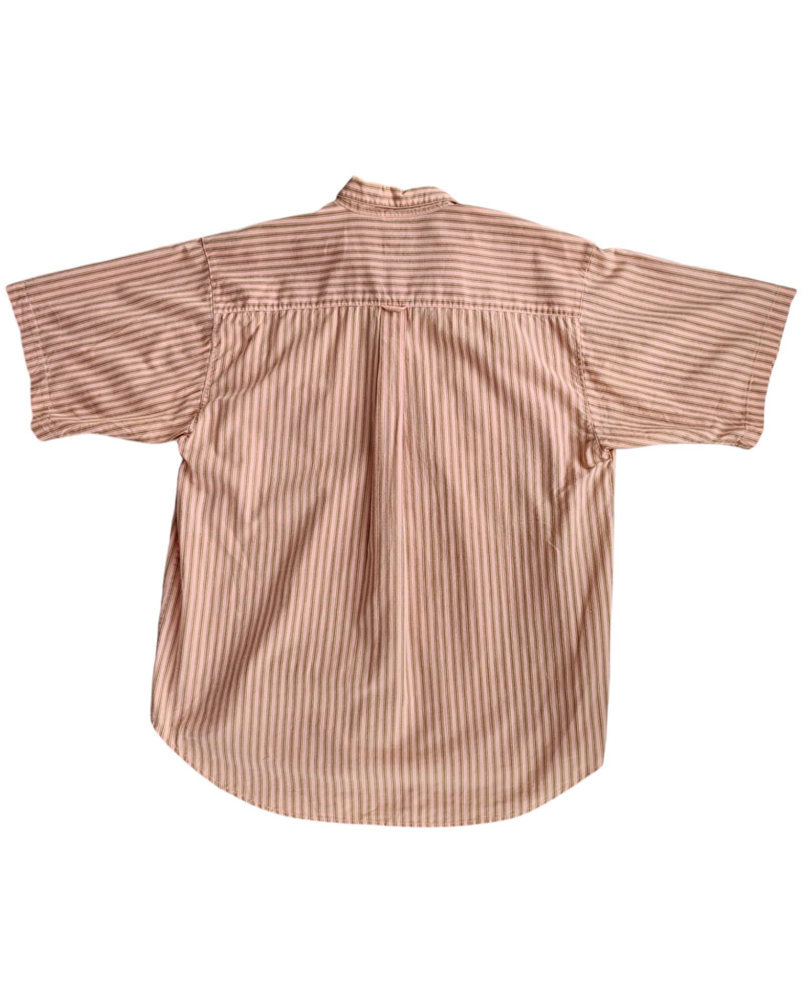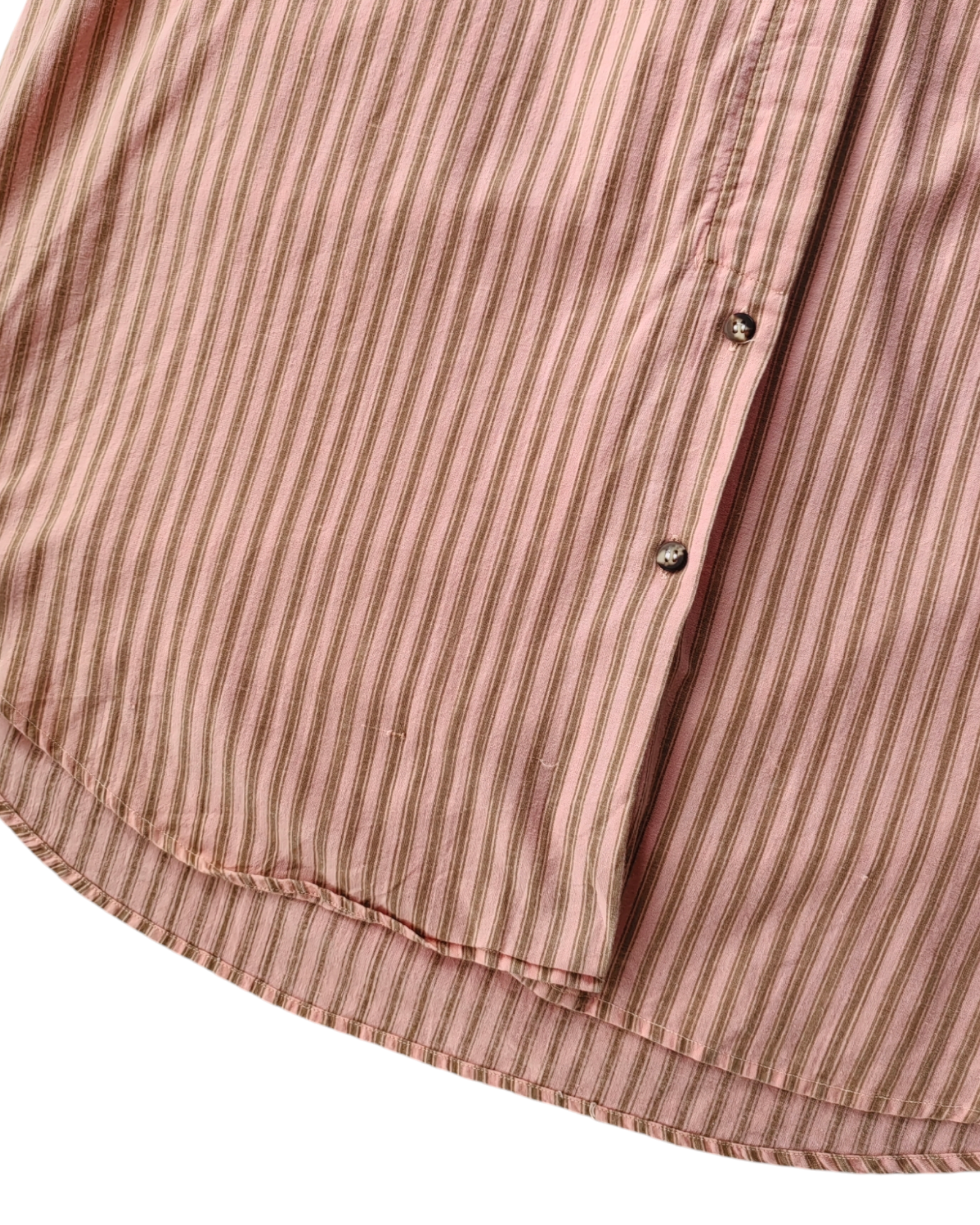 CAMISA DE RAYAS VERTICALES COLOR SALMON Y CAFE CLARO. 100% ALGODON. BOLSILLOS DELANTEROS FUNCIONALES. SIN DETALLES DE USO.