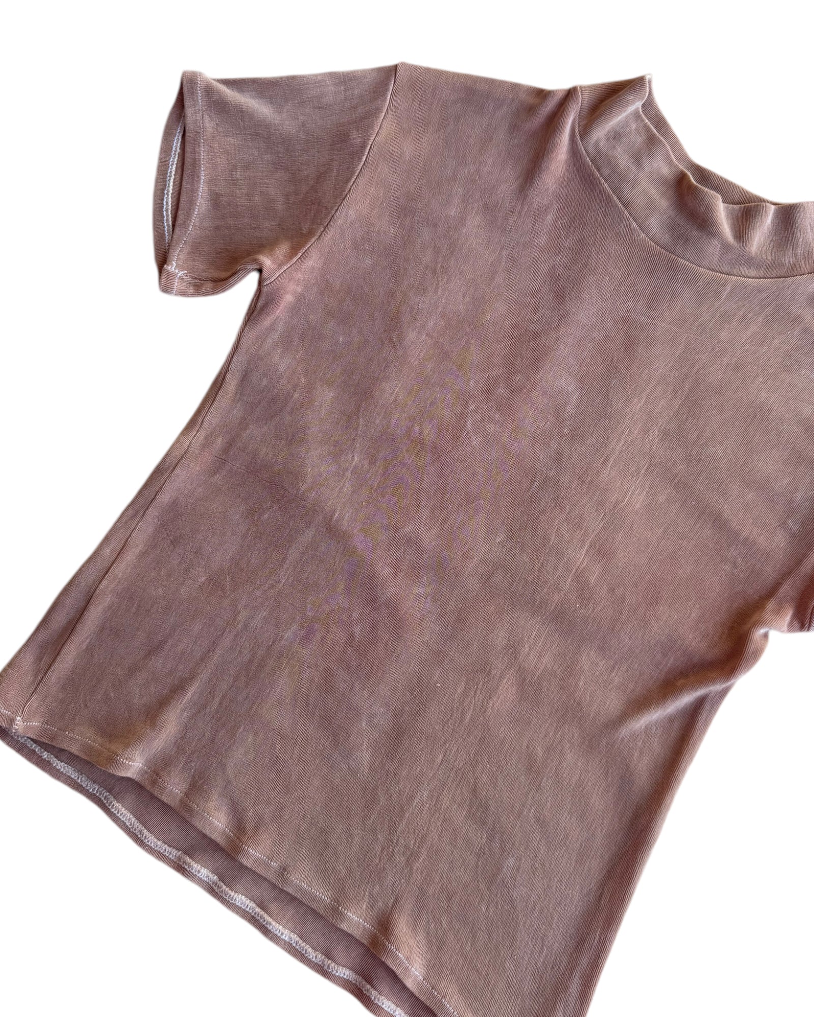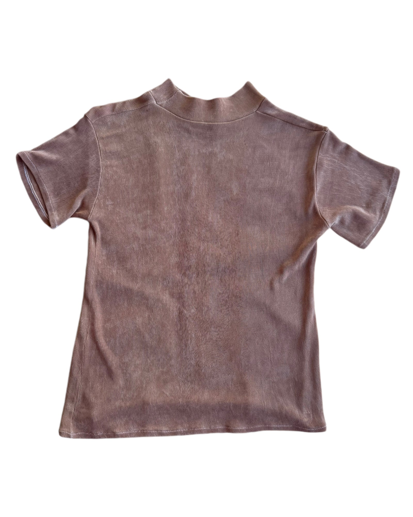 TOP AJUSTADO CON CUELLO ALTO Y MANGA CORTA EN COLOR PALO DE ROSA, SE AMOLDA AL CUERPO, ES UN BASICO. SIN DETALLES DE USO.