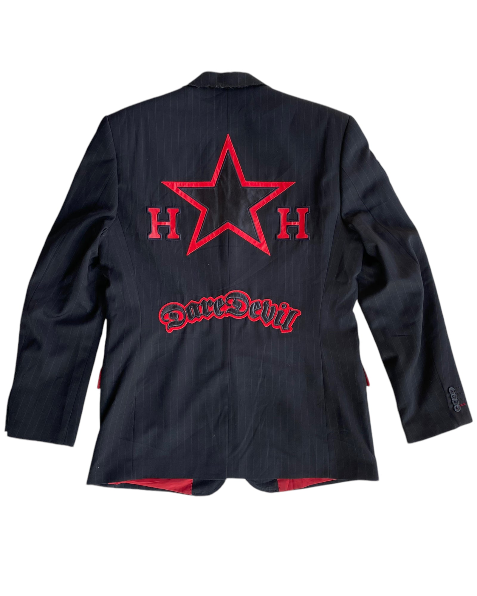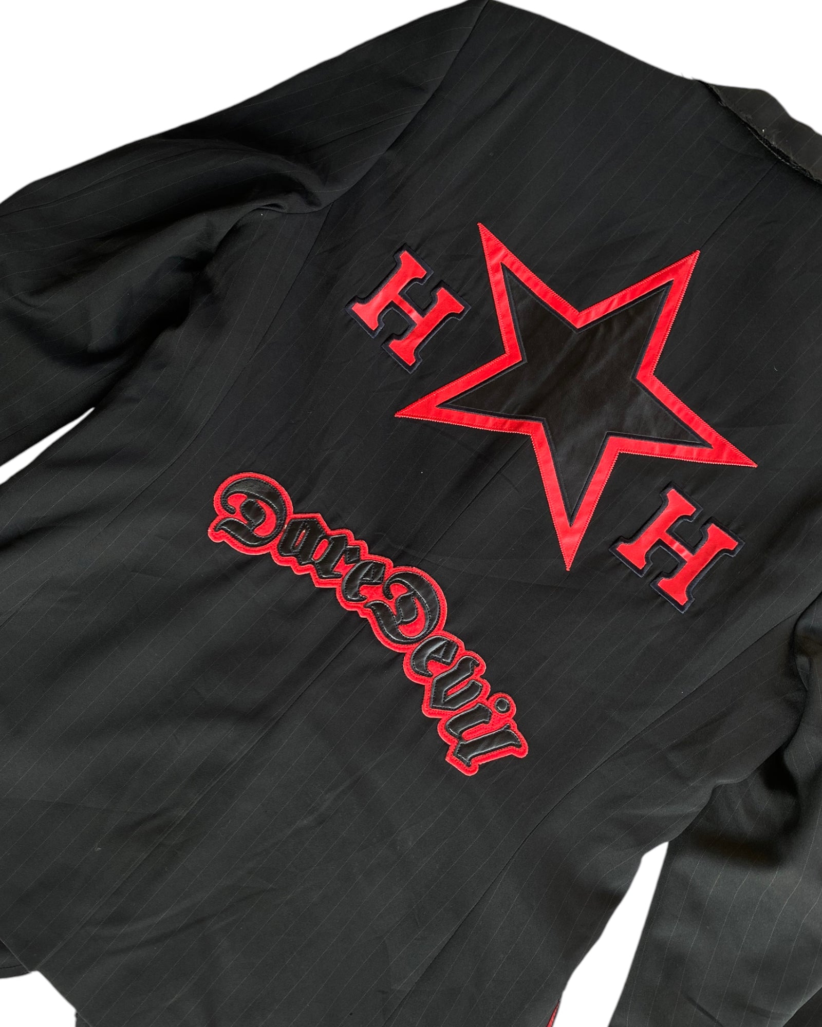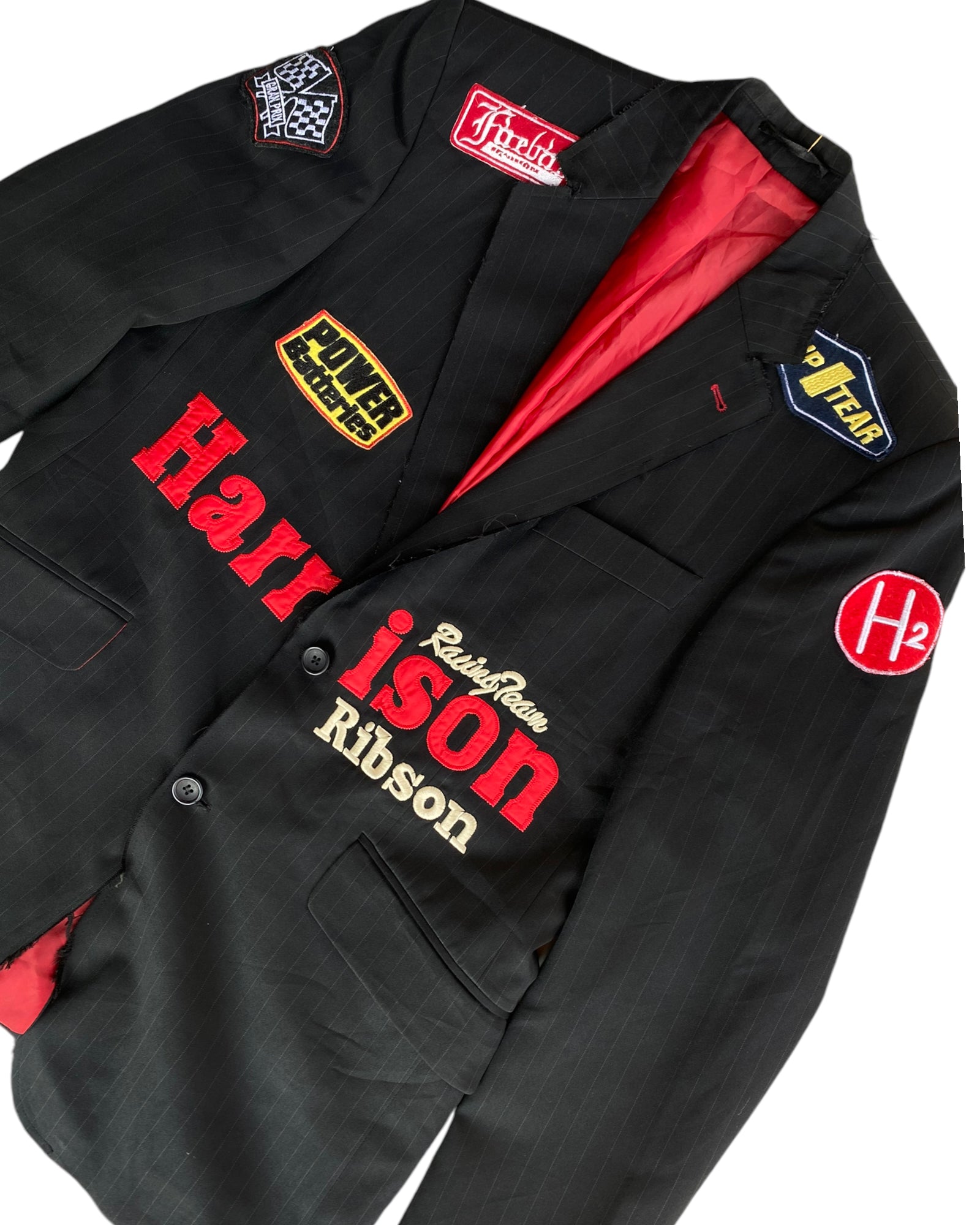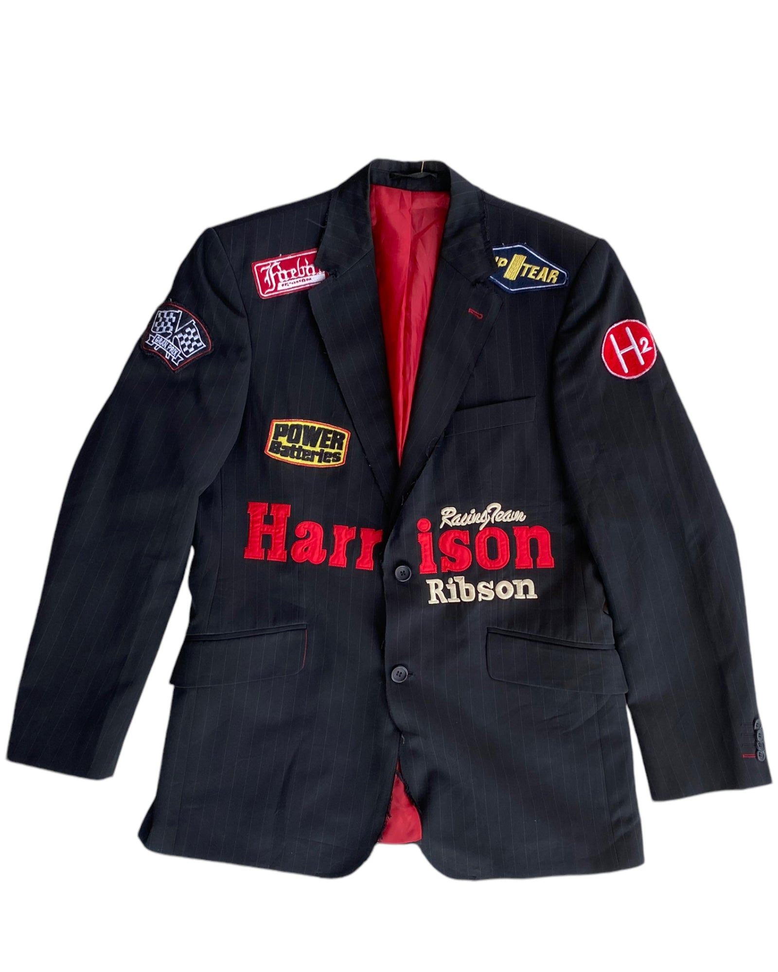SACO NEGRO DE RAYAS VERTICALES BLANCAS CON PARCHES EN MANGAS Y LA PARTE DELANTERA, BOLSILLOS FALSOS EN LA PARTE DELANTERA. SIN DETALLES DE USO.