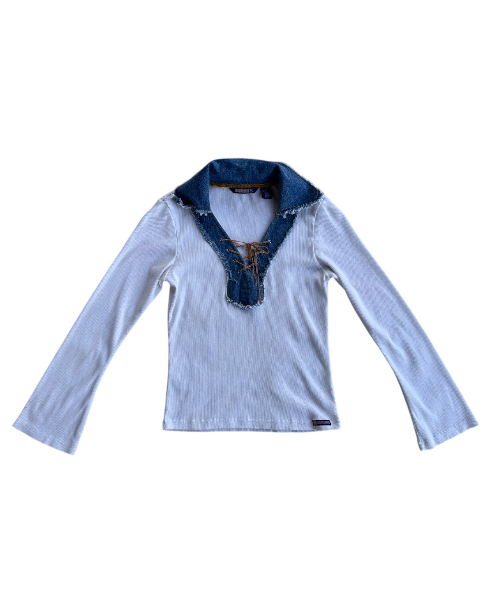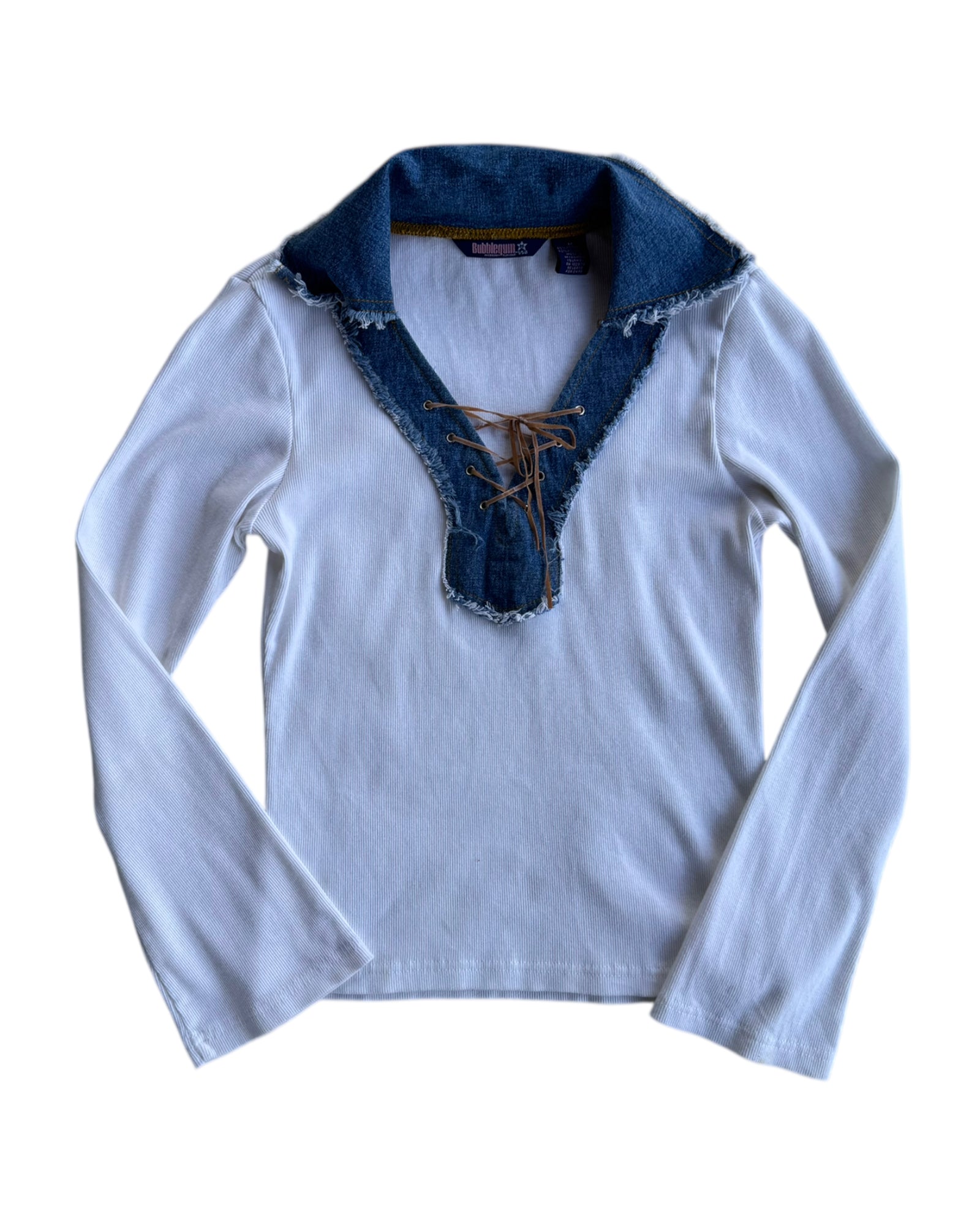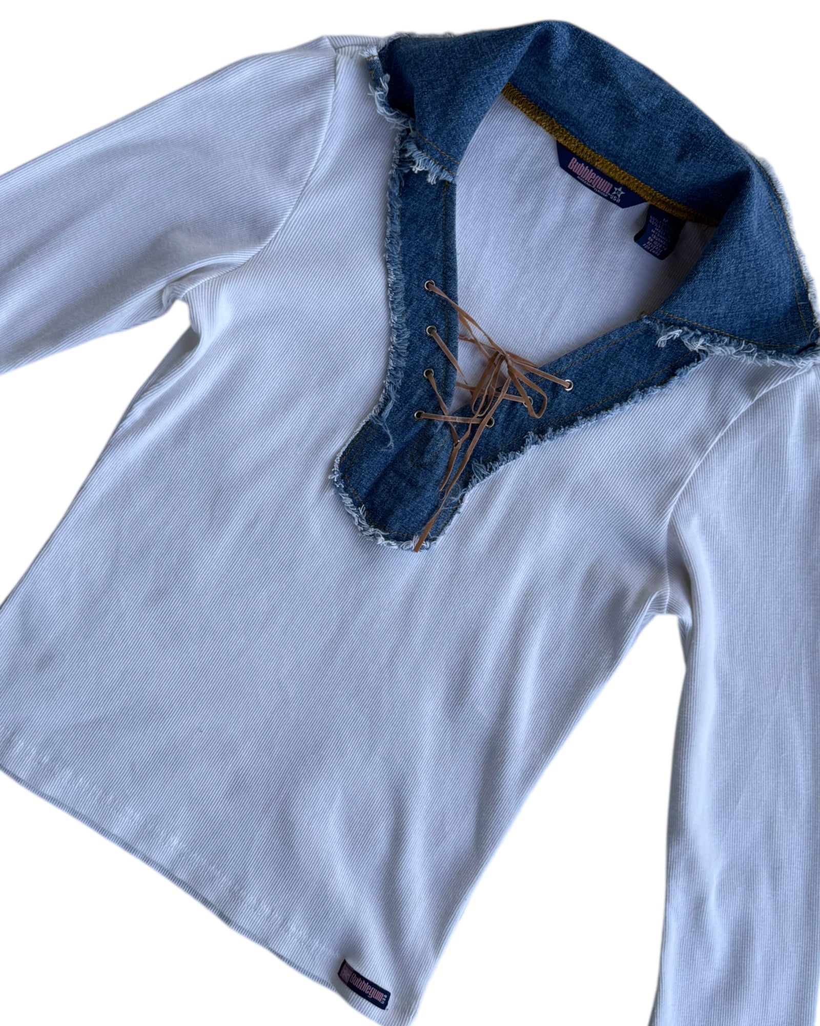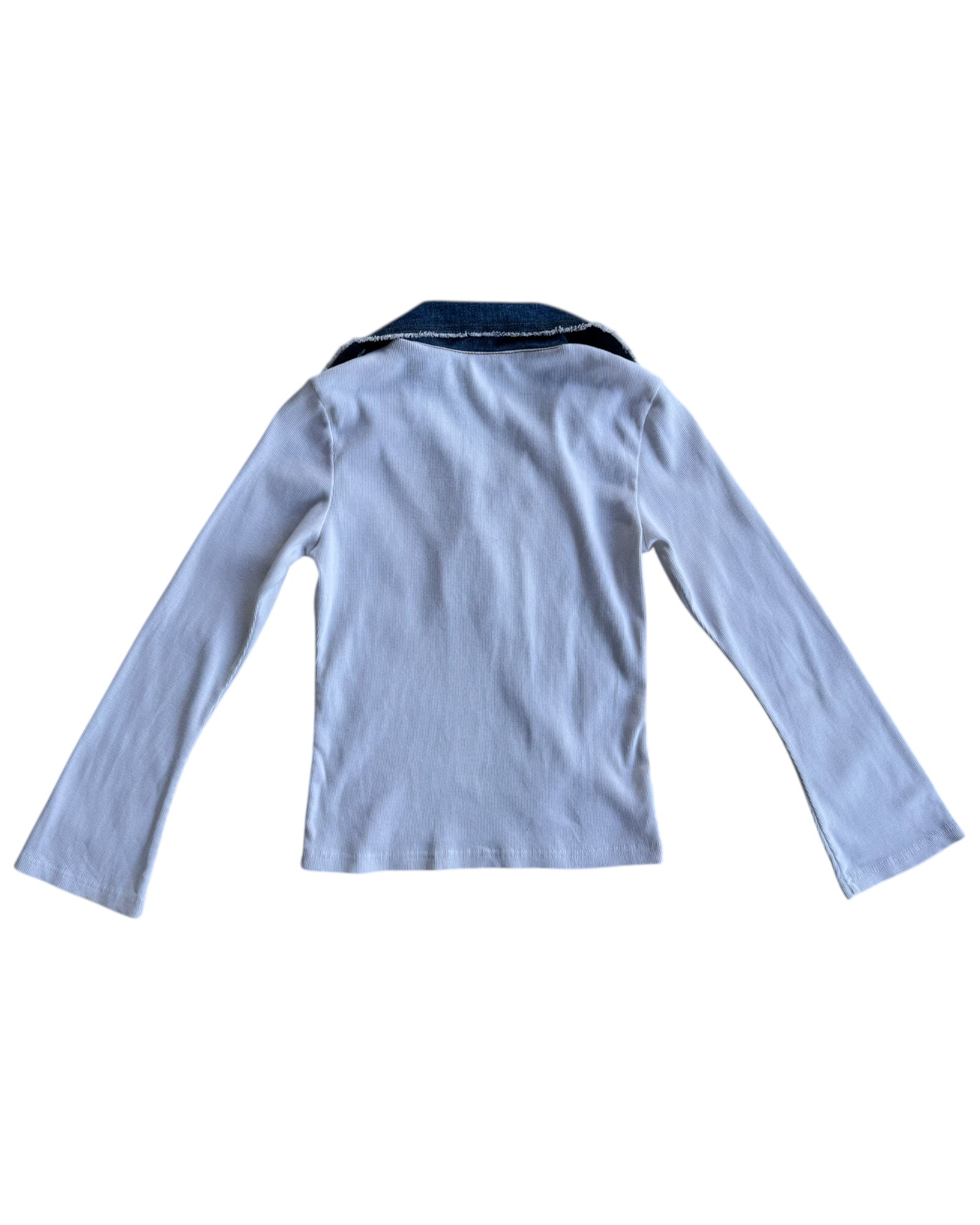 TOP DE MANGA LARGA RIBBED EN COLOR BLANCO 60% ALGODONY 40% POLYESTER CON CUELLO DE DENIM MEDIO Y LISTON PARA AMARRAR EN COLOR CAFE TIPO ANTE. NO TIENE DETALLES, EN PERFECTAS CONDICIONES.