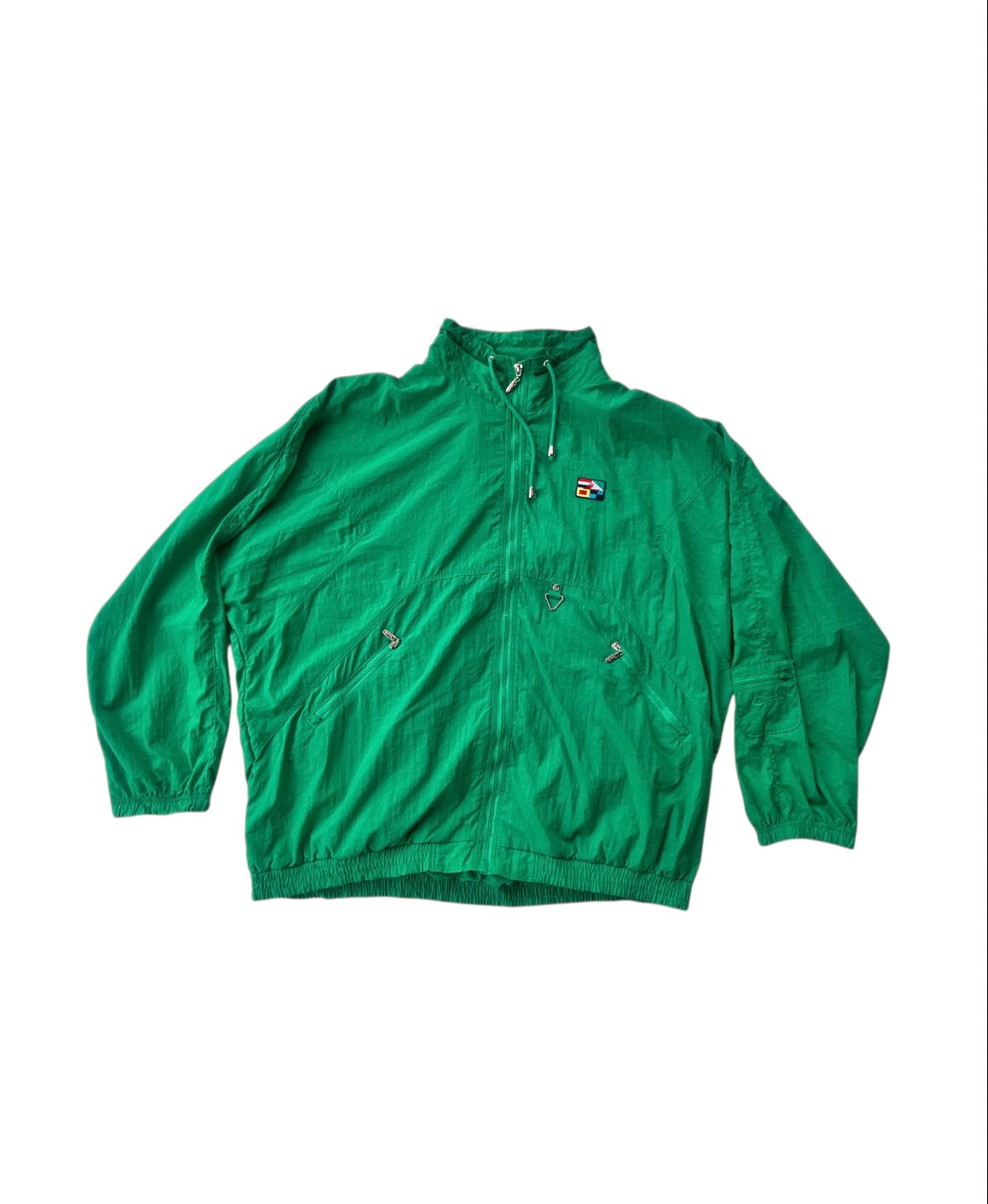 CHAMARRA ROMPEVIENTOS EN COLOR VERDE CON BORDADO EN UN COSTADO DE UNA BANDERA Y MULTIPLES COMPARTIMENTOS FUNCIONALES, HARDWEAR PLATEADO. NO TIENE DETALLES, EN PERFECTO ESTADO.
