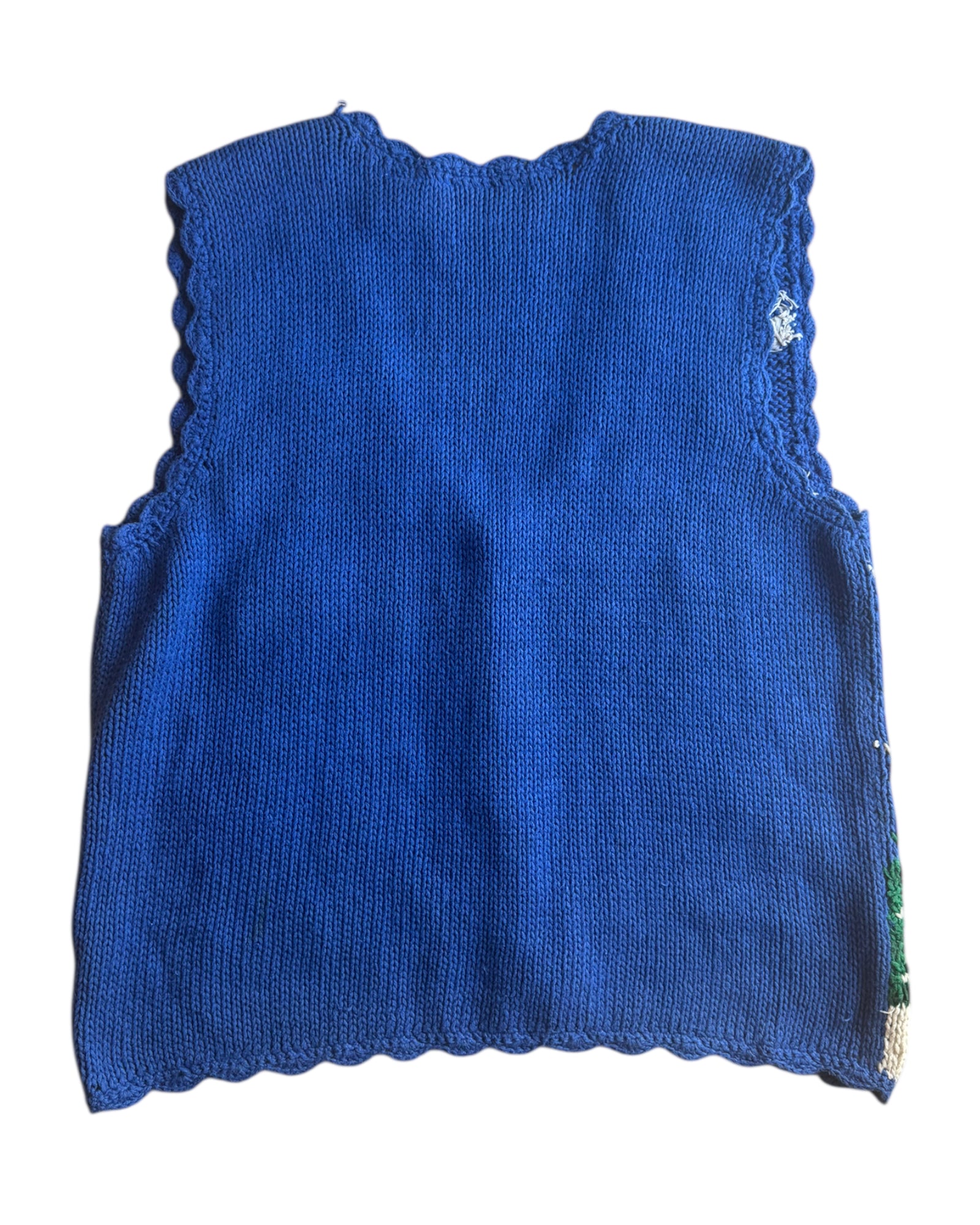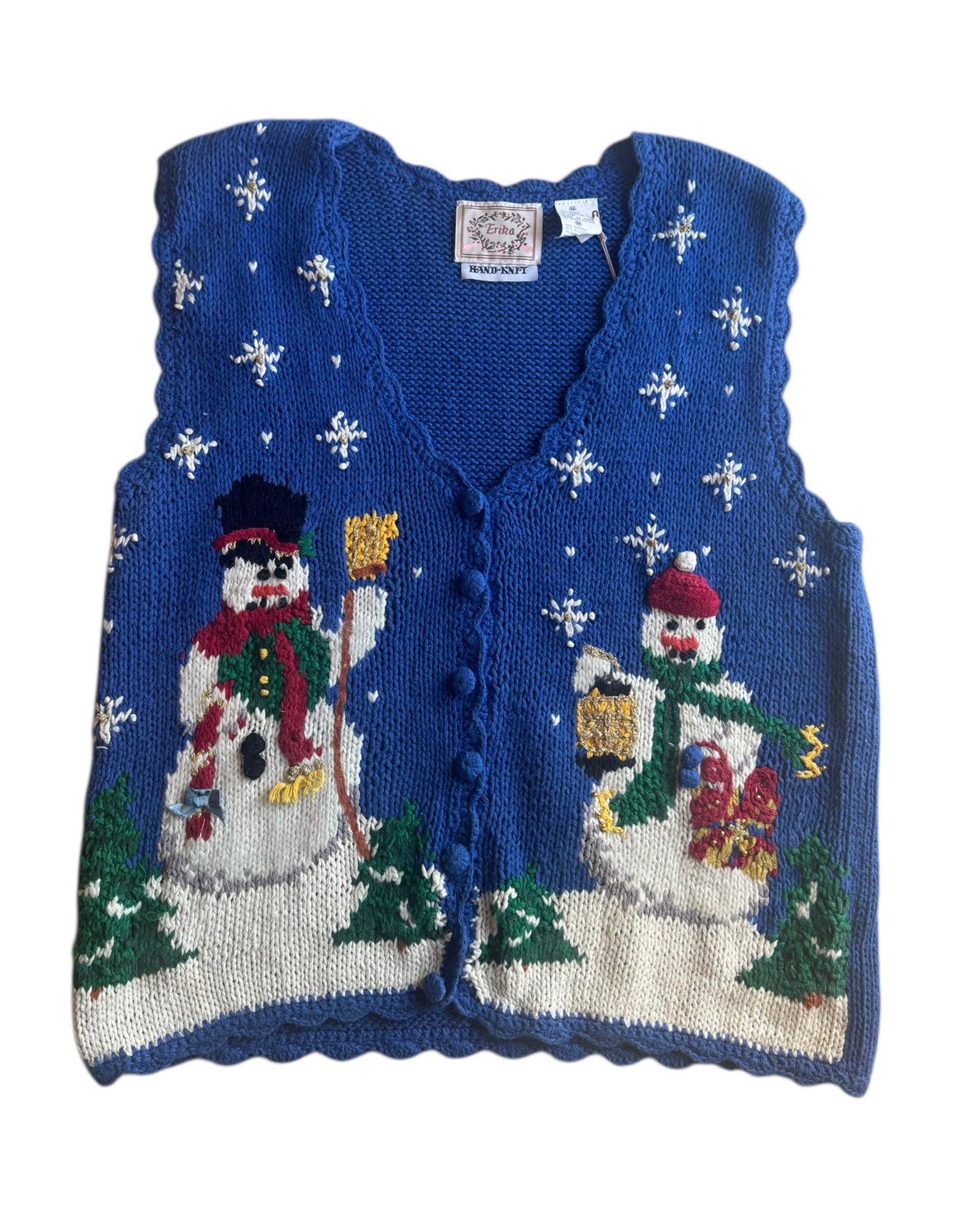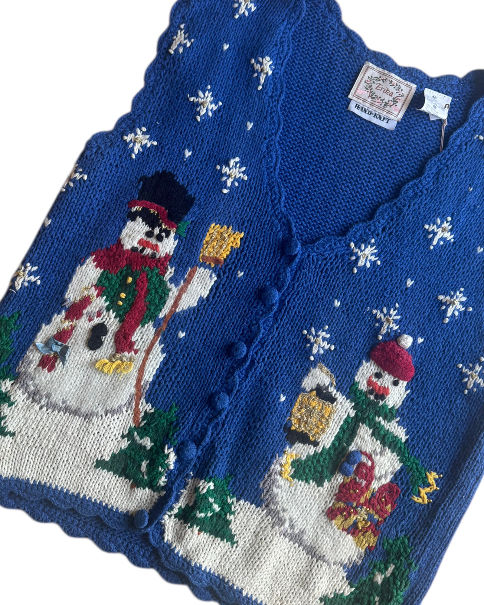 CHALECO TEJIDO A MANO EN COLOR AZUL COBALTO 55% RAMIE Y 45% ALGODÓN CON MUÑECOS DE NIEVE Y COPOS EN COLOR BLANCO. PERFECTO PARA NAVIDAD. NO TIENE DETALLES. EN PERFECTAS CONDICIONES.