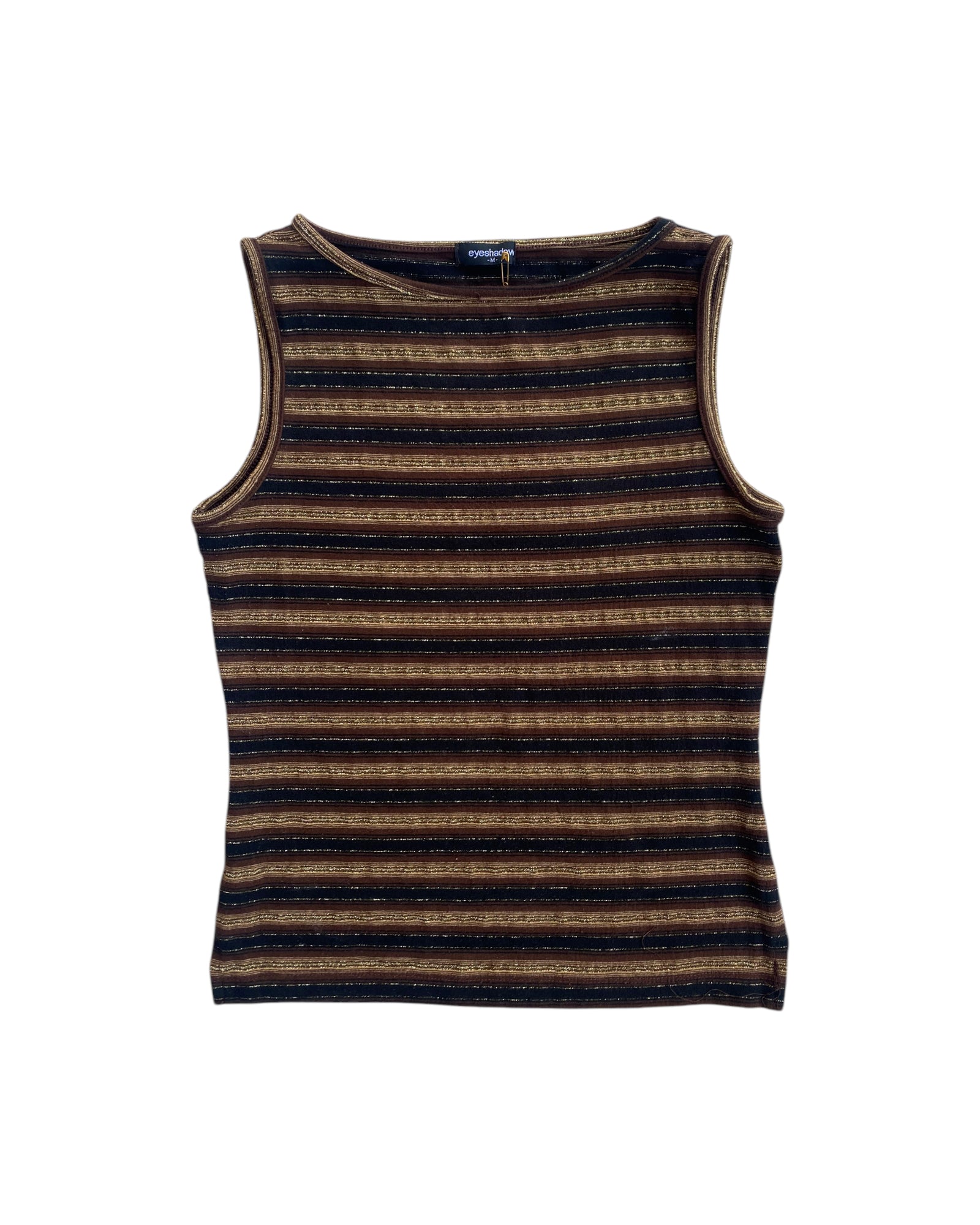 TOP CUELLO ALTO DE RAYAS VERTICALES EN TONOS CAFES Y CON LINEA DORADA. NO TIENE DETALLES