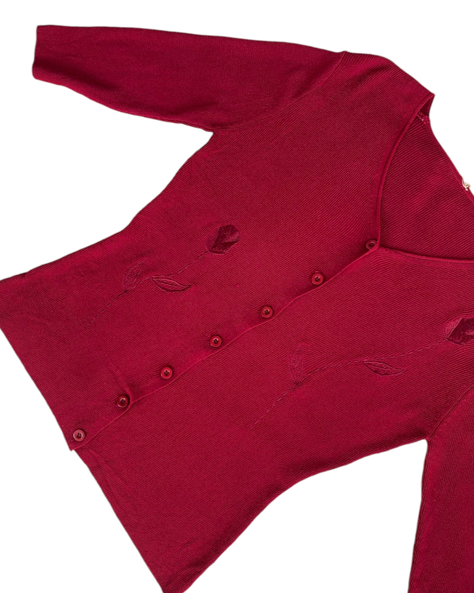 BLUSA TEJIDA EN COLOR VINO CON BORDADOS DE FLORES EN EL FRENTE, MANGA TRES CUARTOS, BOTONES PARA PODER USAR COMO CARDIGAN. SIN DETALLES DE USO.