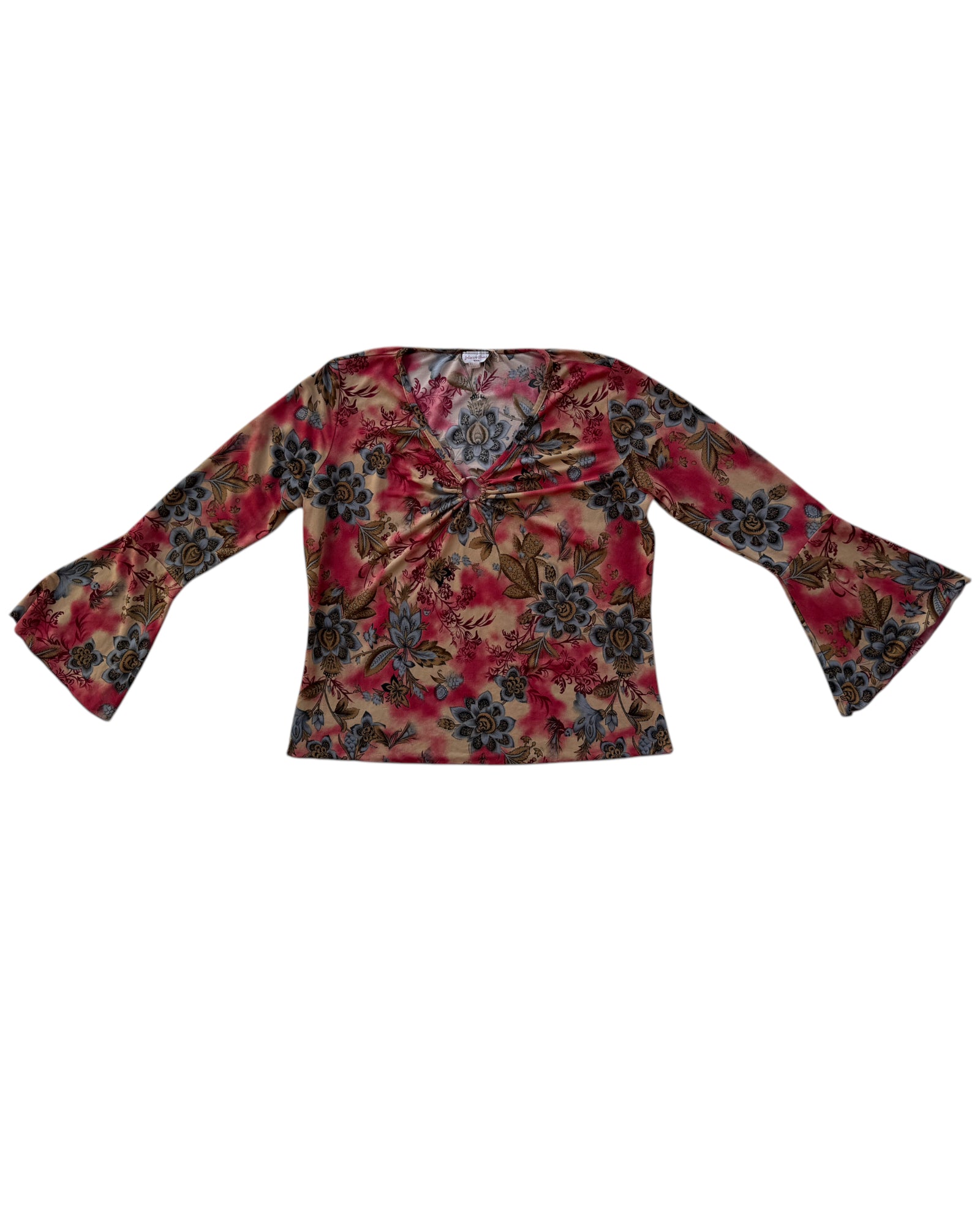 BLUSA100% POLYESTER CON SPANDEX MANGA TRES CUARTOS CON PRINT DE FLORES EN COLORES ROJOS Y AZULES, MANGAS ACAMPANADAS Y ARO EN LA PARTE DEL PECHO COMO DETALLE. NO TIENE DETALLES.