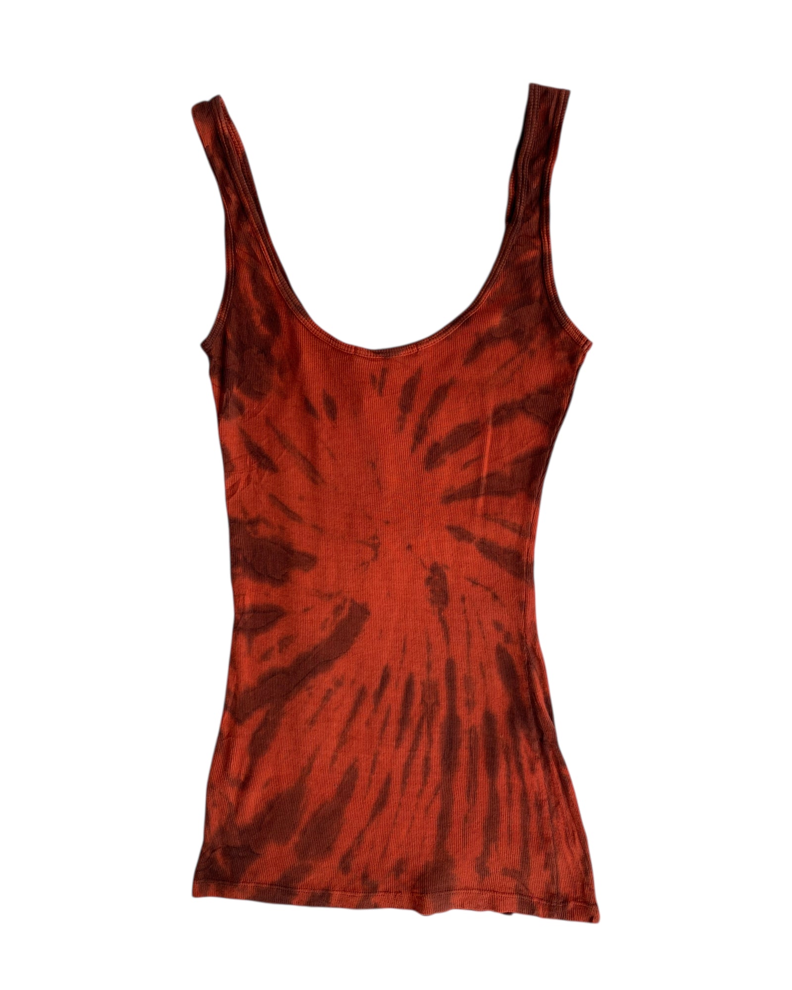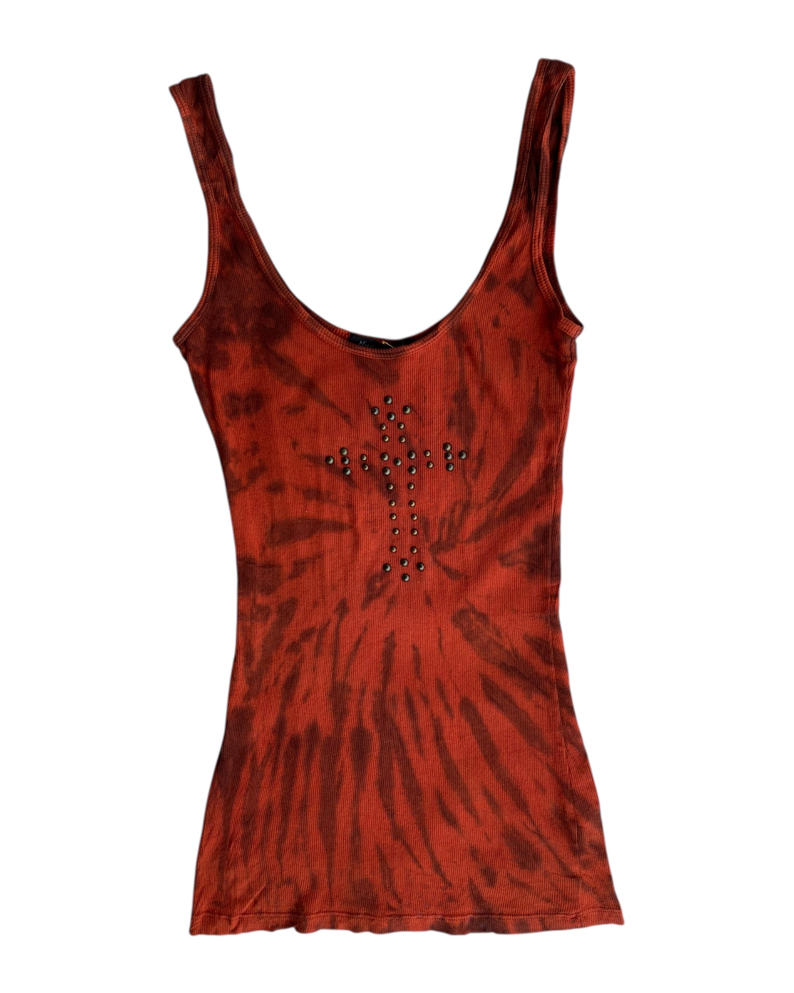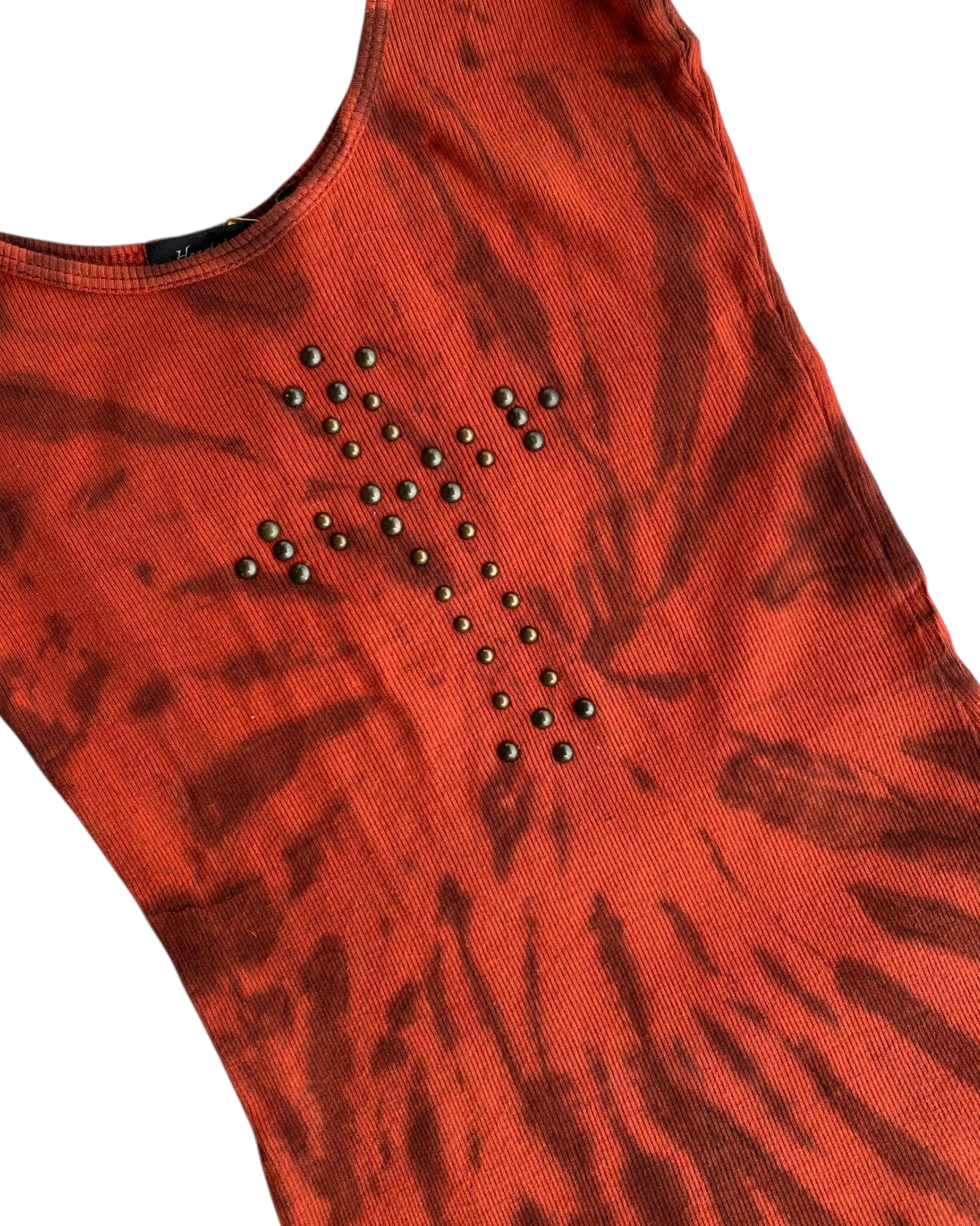 TANK TOP COLOR LADRILLO CON TIE -DYE EN NEGRO Y UNA CRUZ DE ESTOPEROLES EN EL PECHO EN COLOR DORADO DESLAVADO. TIRANTES NO AJUSTABLES. 100% ALGODON. EN PERFECTO ESTADO.