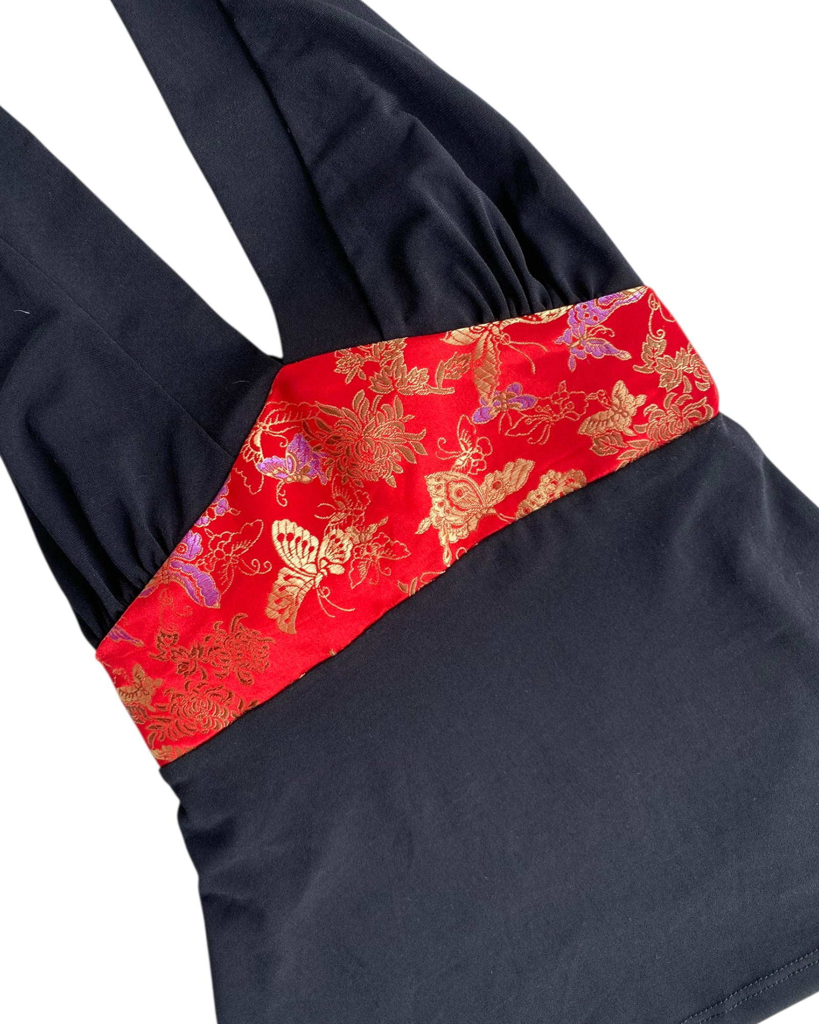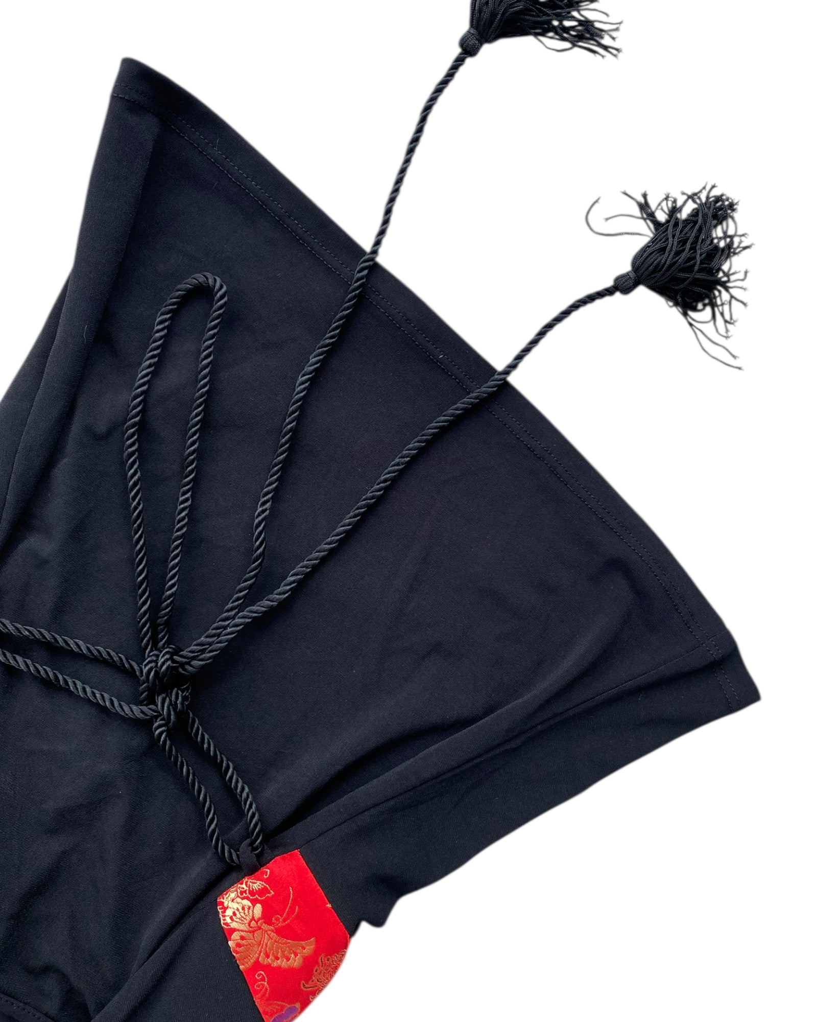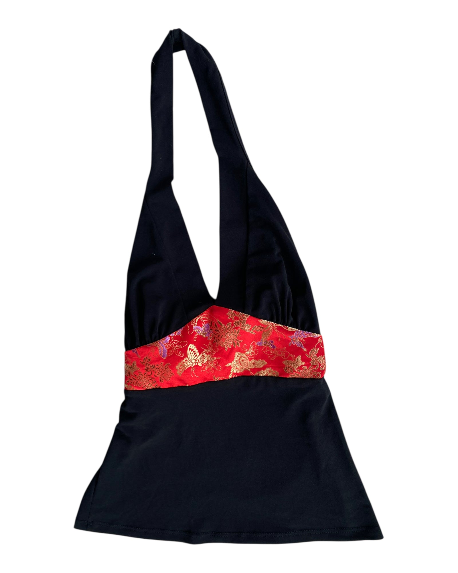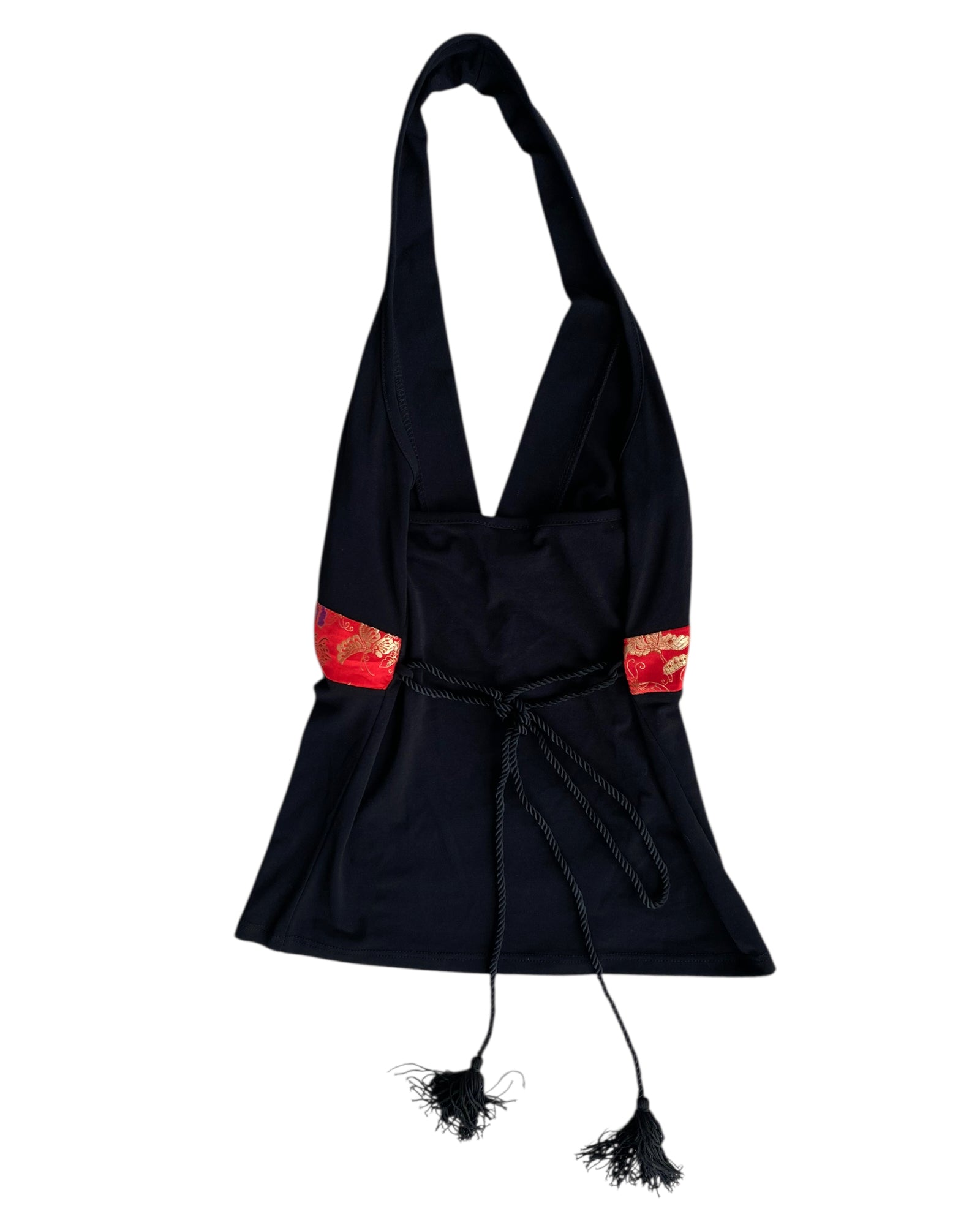 TOP NEGRO CUELLO HALTER NO AJUSTABLE CON BANDA DEBAJO DEL PECHO CON PATRON ASIATICO, ESPALDA DESCUBIERTA CON CORDONES AJUSTABLES 92% POLYESTER 8% SPANDEX. EN PERFECTO ESTADO