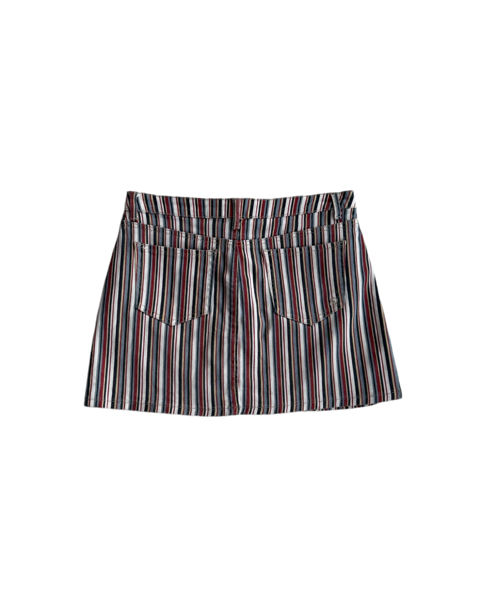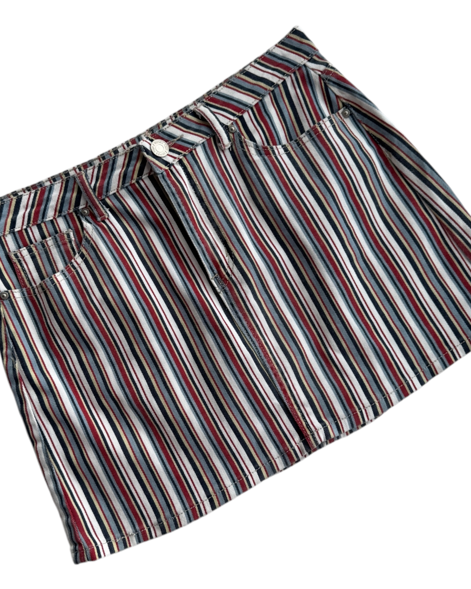 FALDA MINI DE RAYAS VERTICALES EN COLORES BLANCO, ROJO, AZUL Y BEIGE, BOLSOS DELANTEROS Y TRASEROS FUNCIONALES. HEBILLAS PARA CINTURON. 98% ALGODON 2% SPANDEX. SIN DETALLES DE USO.