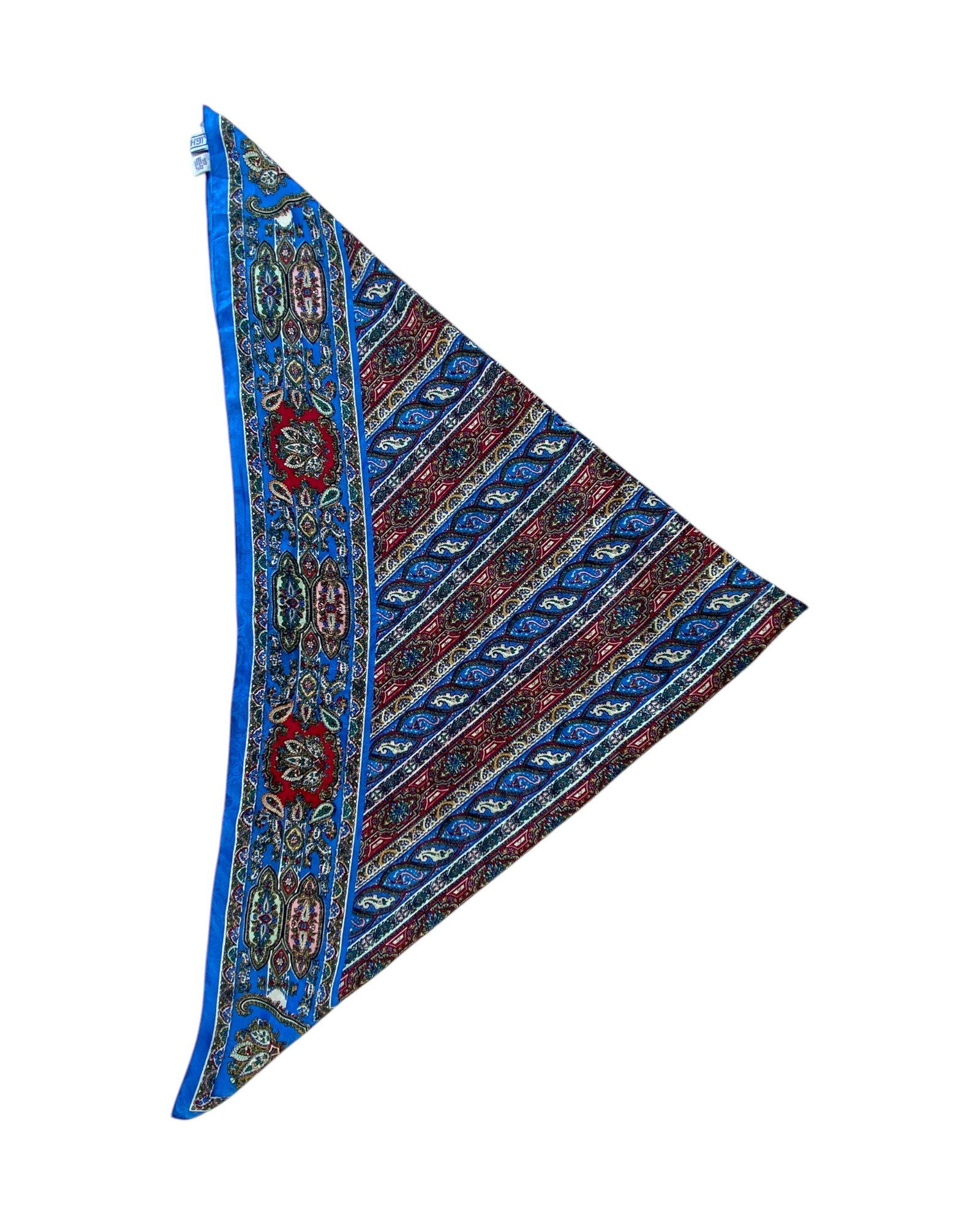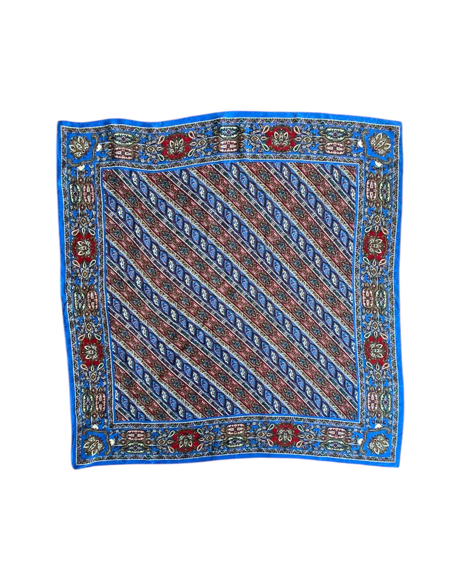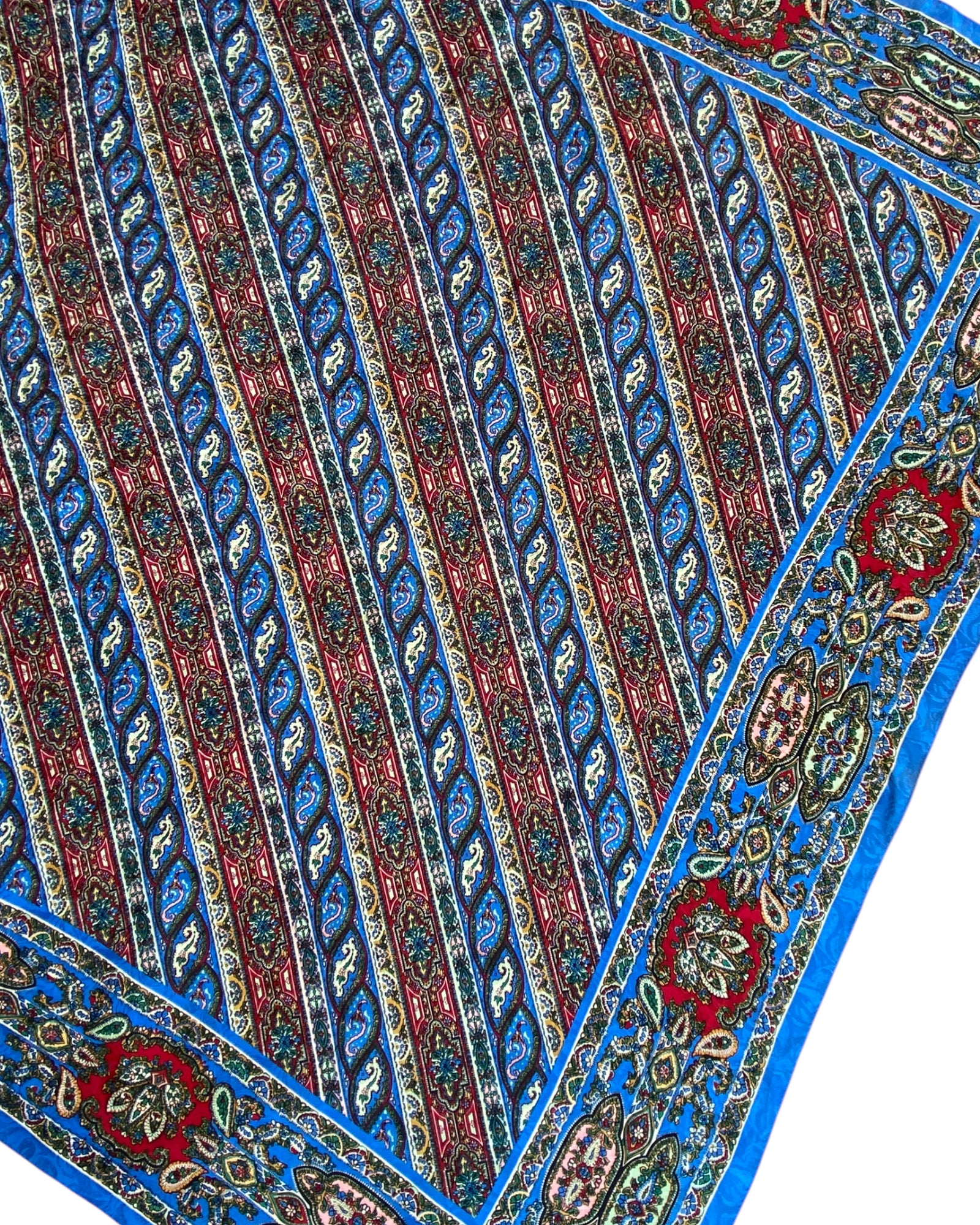 PASHMINA 100% SEDA DE COLOR AZUL CON PATRÓN ORNAMENTAL EN TONOS ROJOS, AMARILLOS Y VERDES. SIN DETALLES DE USO