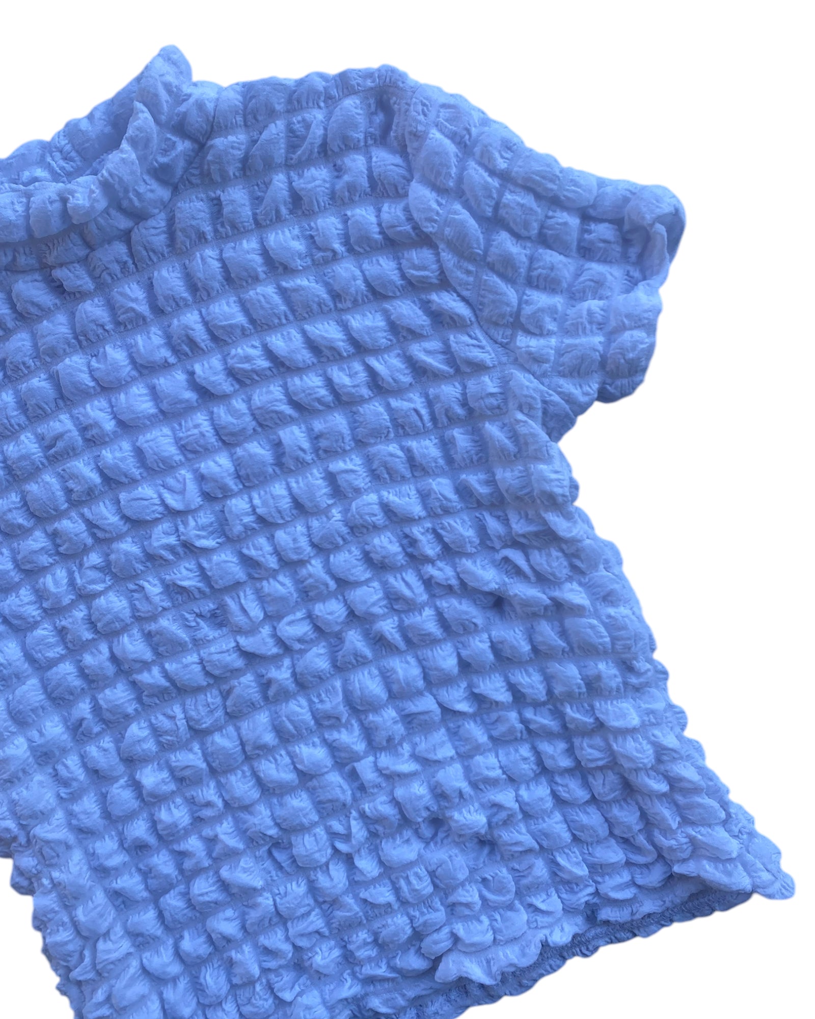 PLAYERA BLANCA TIPO "POPCORN" CON ELASTICO Y AJUSTABLE 955 POLYESTER% 5% SPANDEX, TEXTURA SUAVE. EN MUY BUEN ESTADO