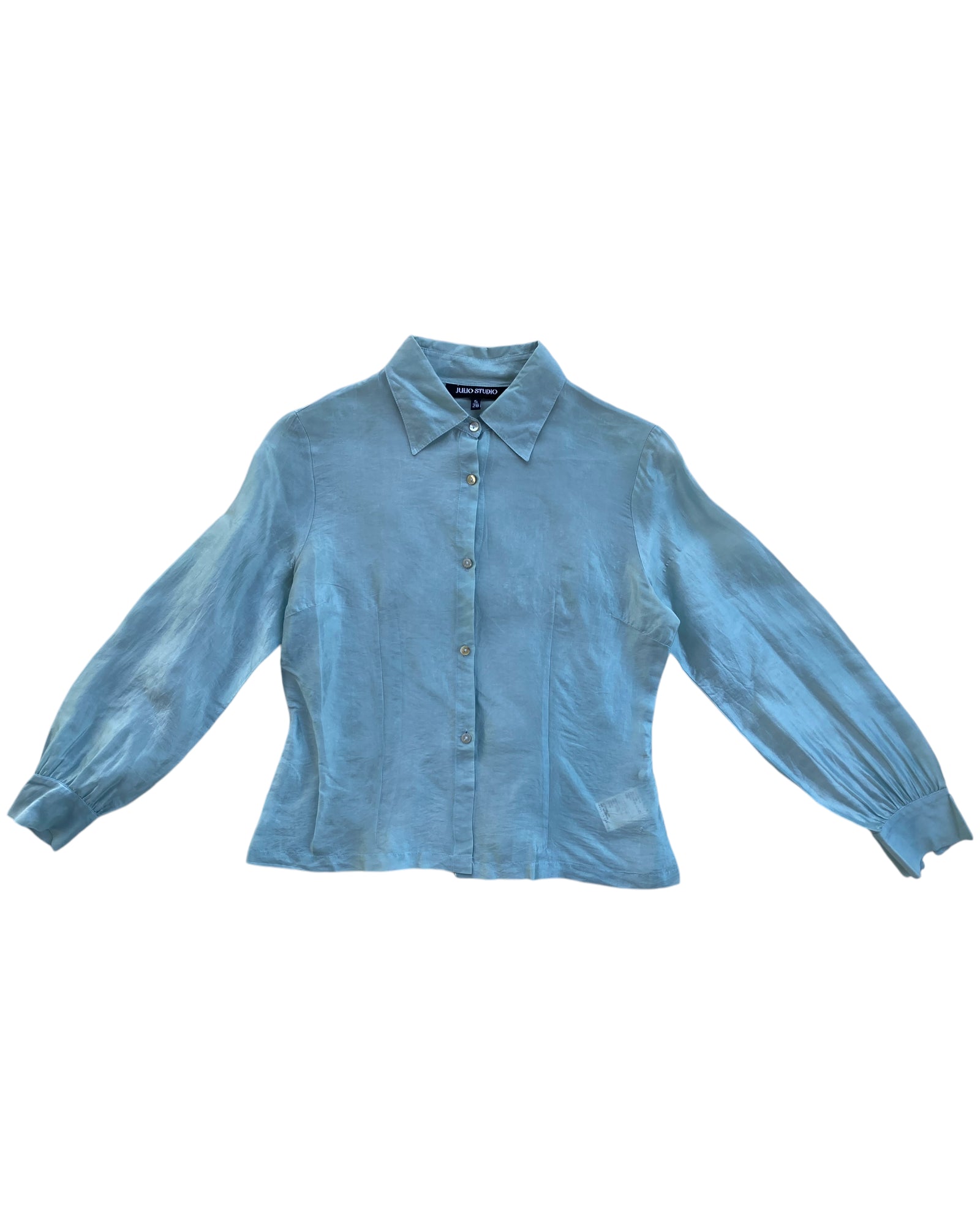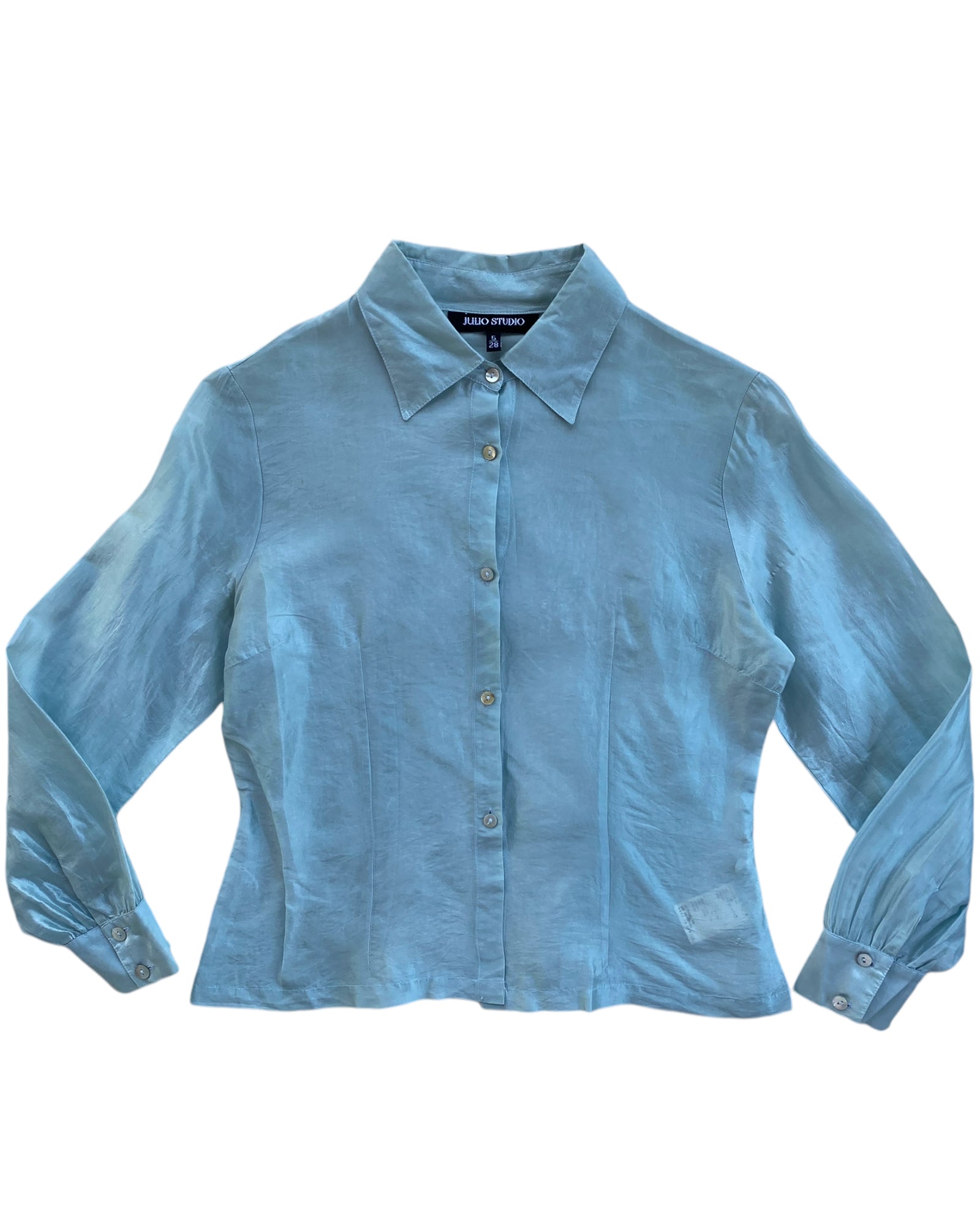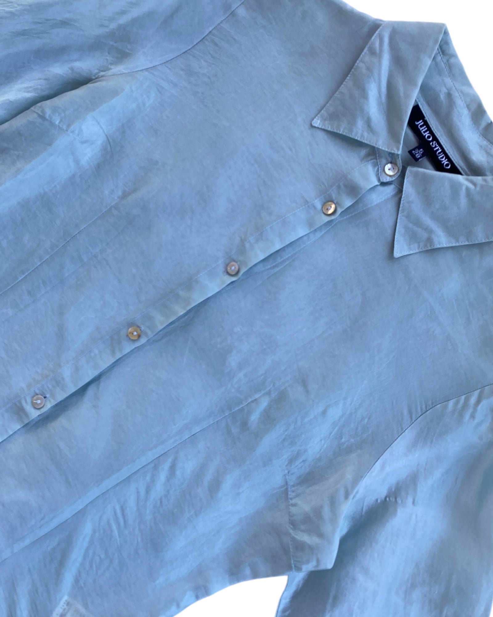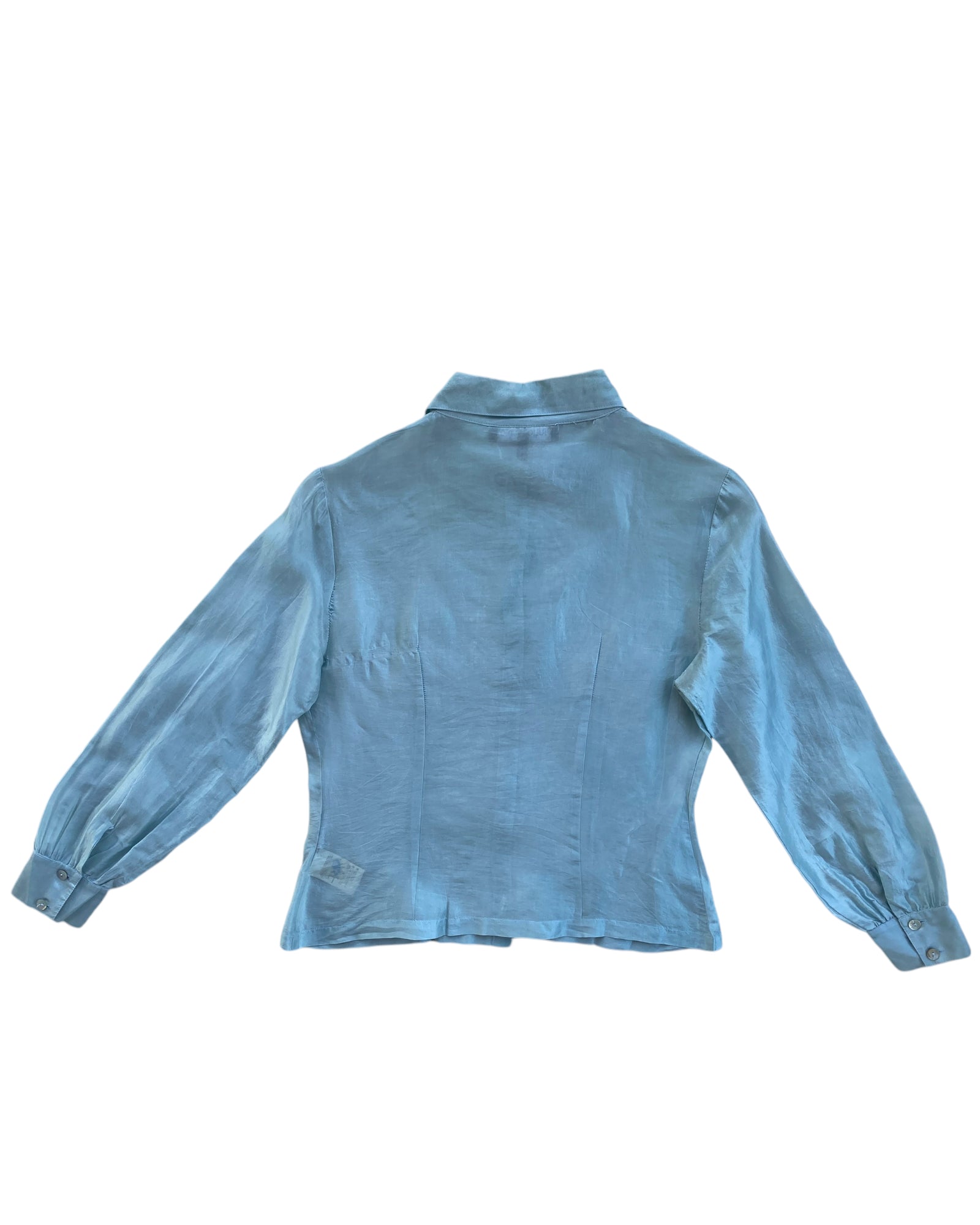 CAMISA DE SEDA AZUL CLARO CEÑIDA AL CUERPO, BOTONES FRONTALES. 100% SEDA. SIN DETALLES DE USO.