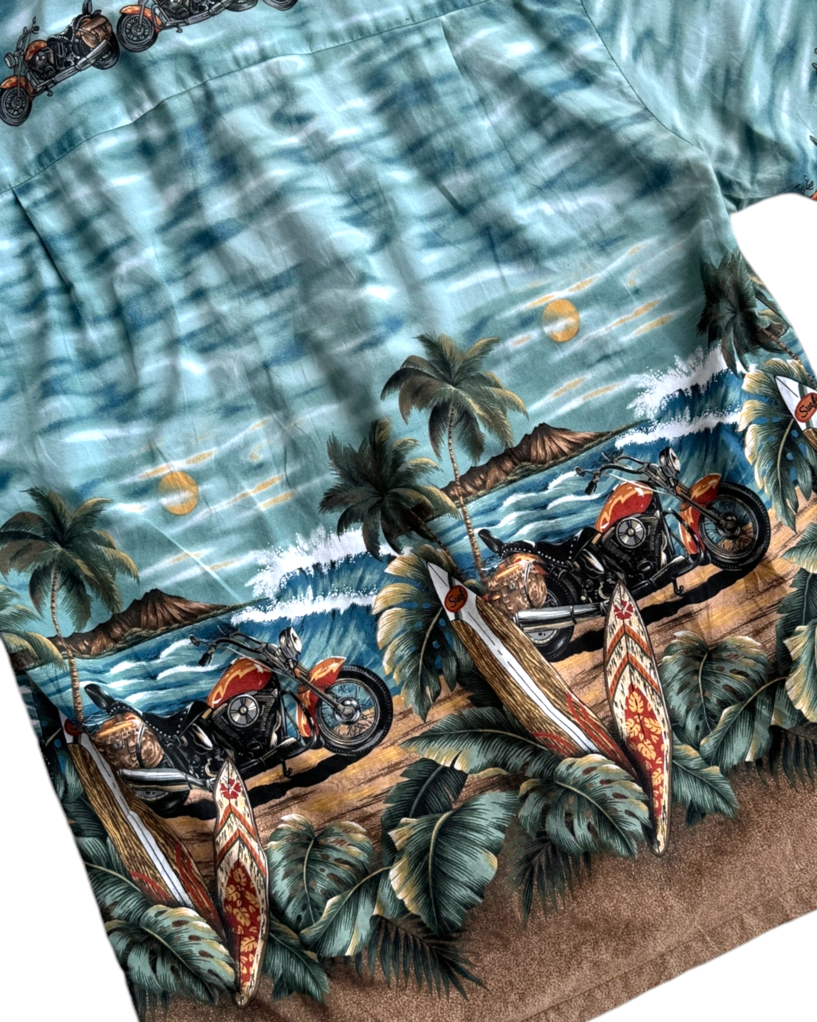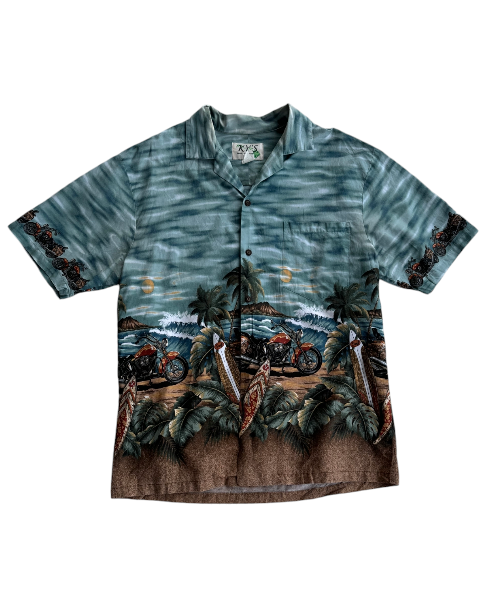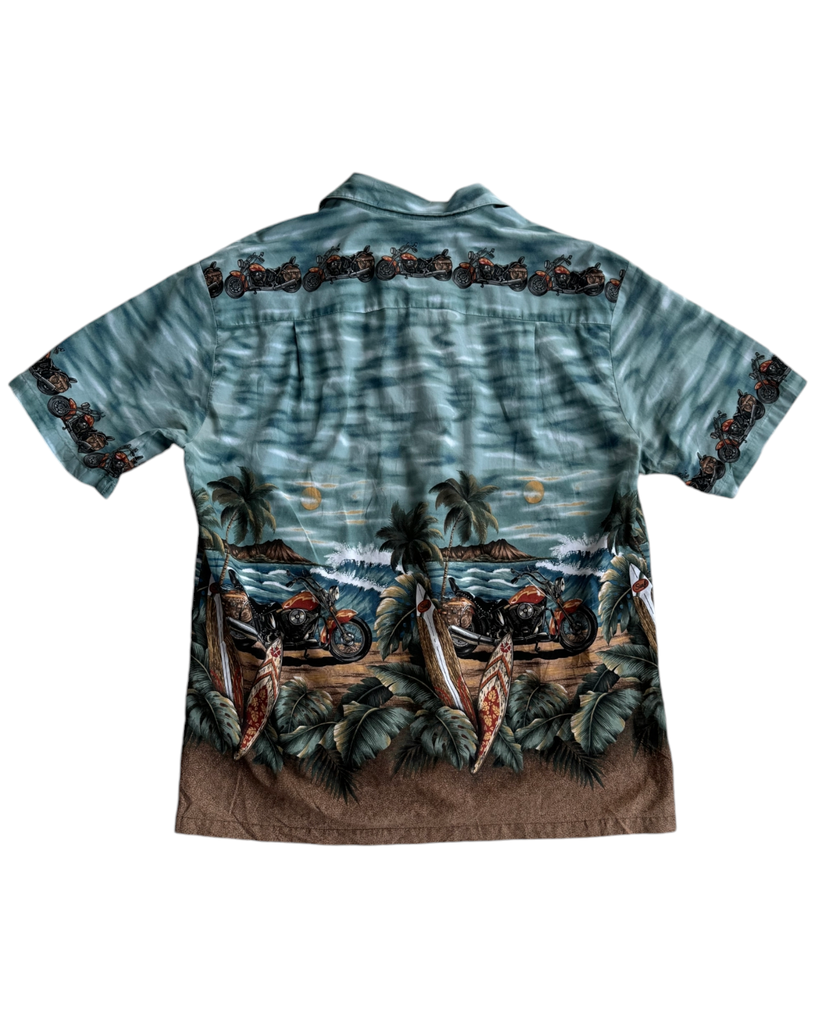 CAMISA HAWAIIANA CON ATARDECER Y PRINT DE TABLAS DE SURF, MOTOCICLETAS, OLAS Y PALMERAS. BOTONES DE MADERA Y BOLSILLO IZQUIERDO, 100% ALGODÓN. SIN DETALLES DE USO.