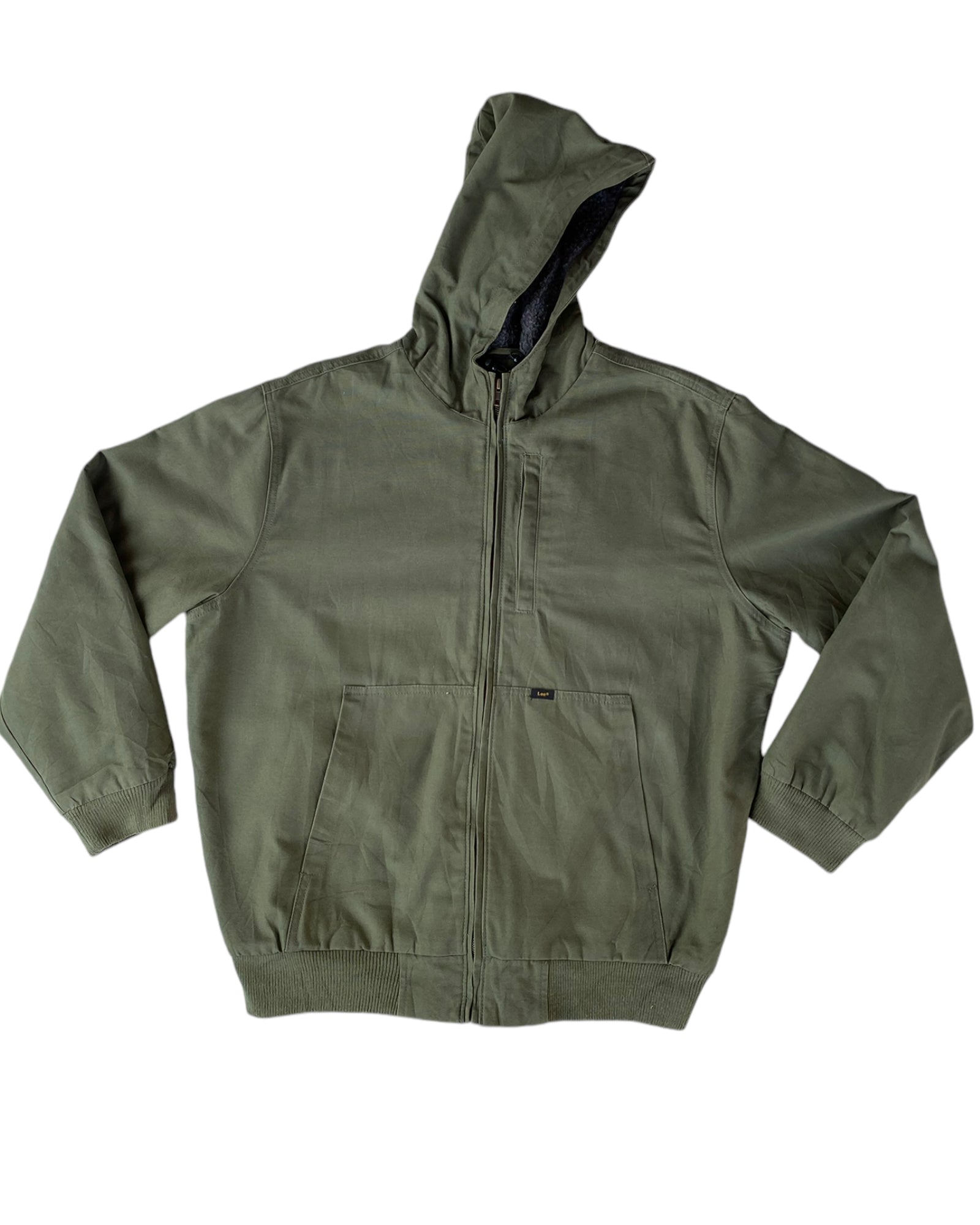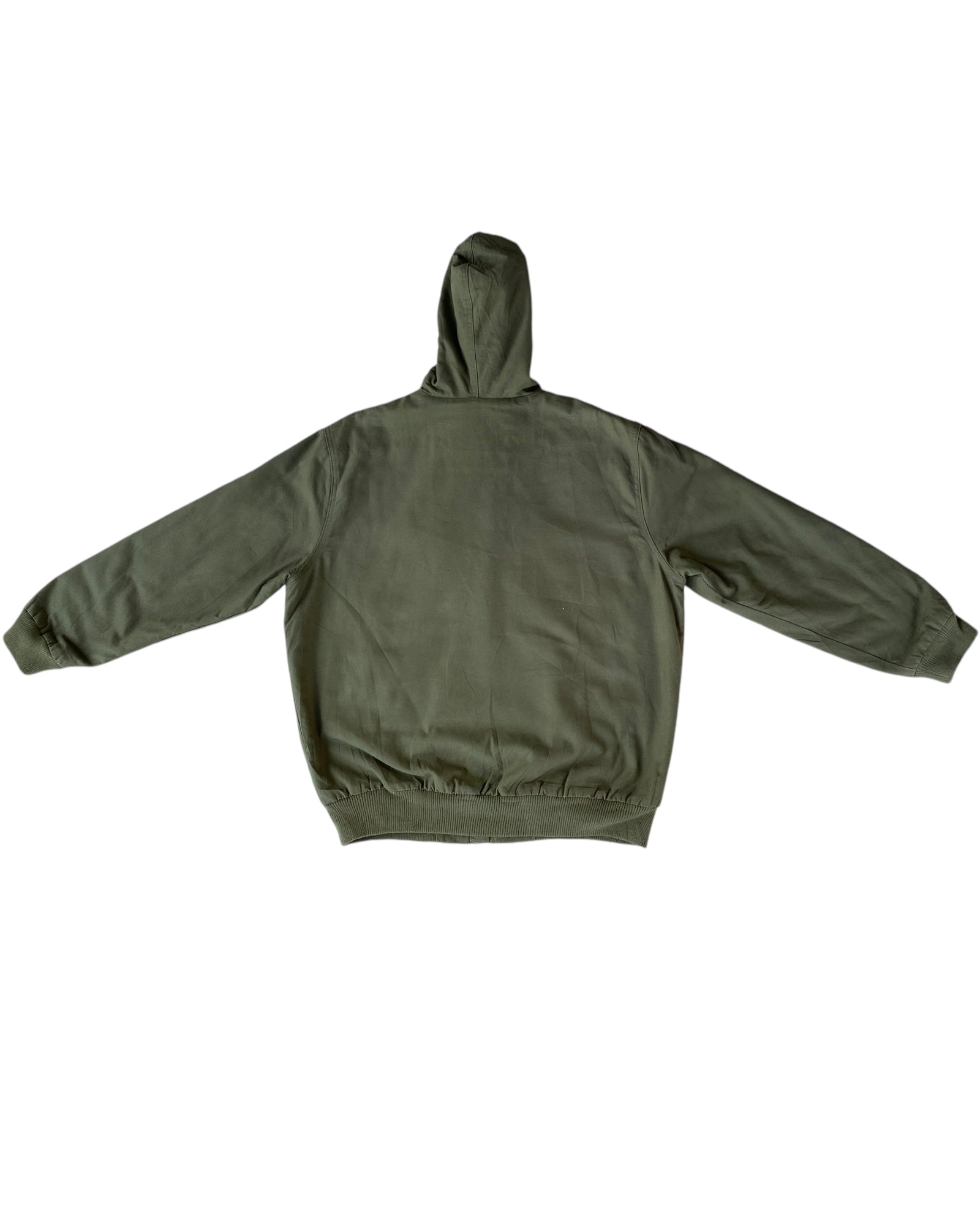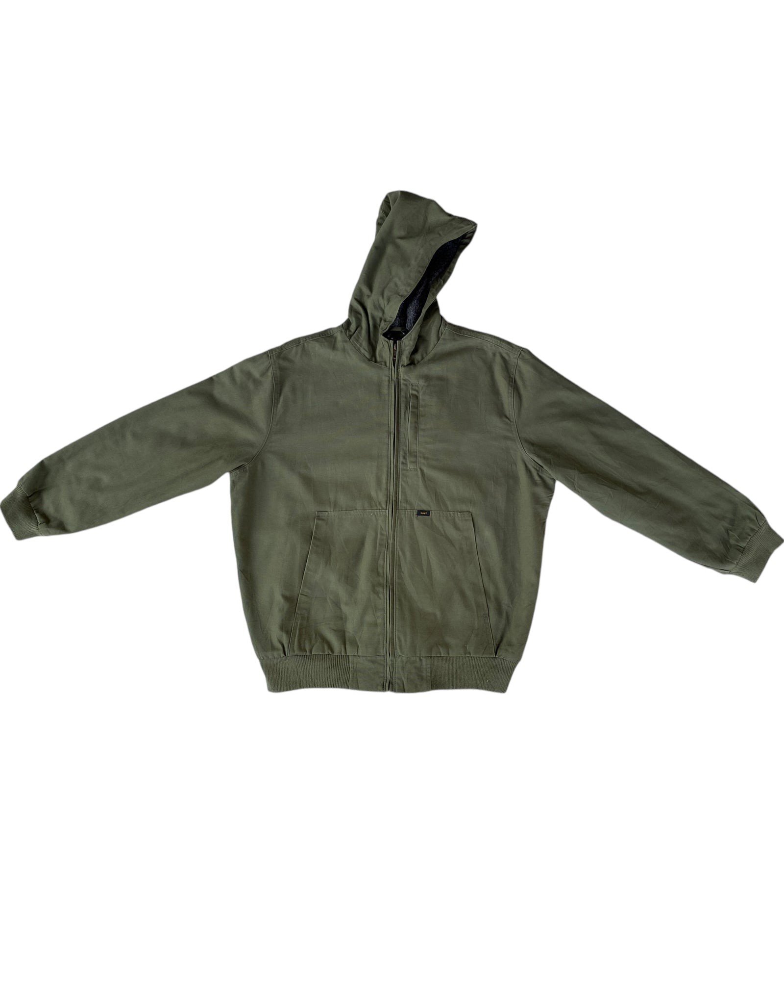 CHAMARRA IMPERMIABLE VERDE MILITAR CON FORRO ABORREGADO GRIS 100% ALGODON CON BOLSILLOS FUNCIONALES DELANTEROS, MUY CALIENTE PARA EL INVIERNO. SIN DETALLES DE USO.
