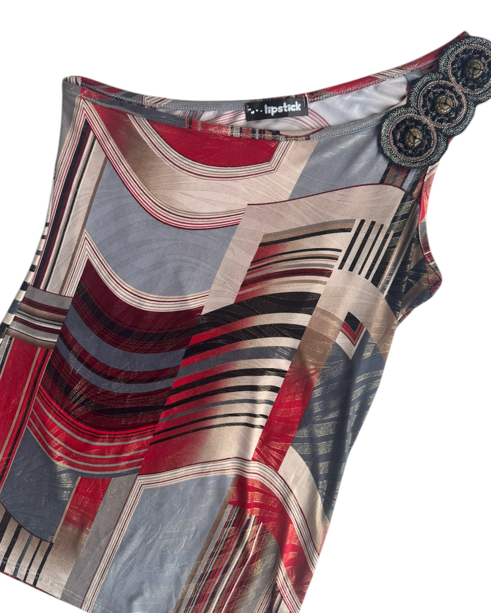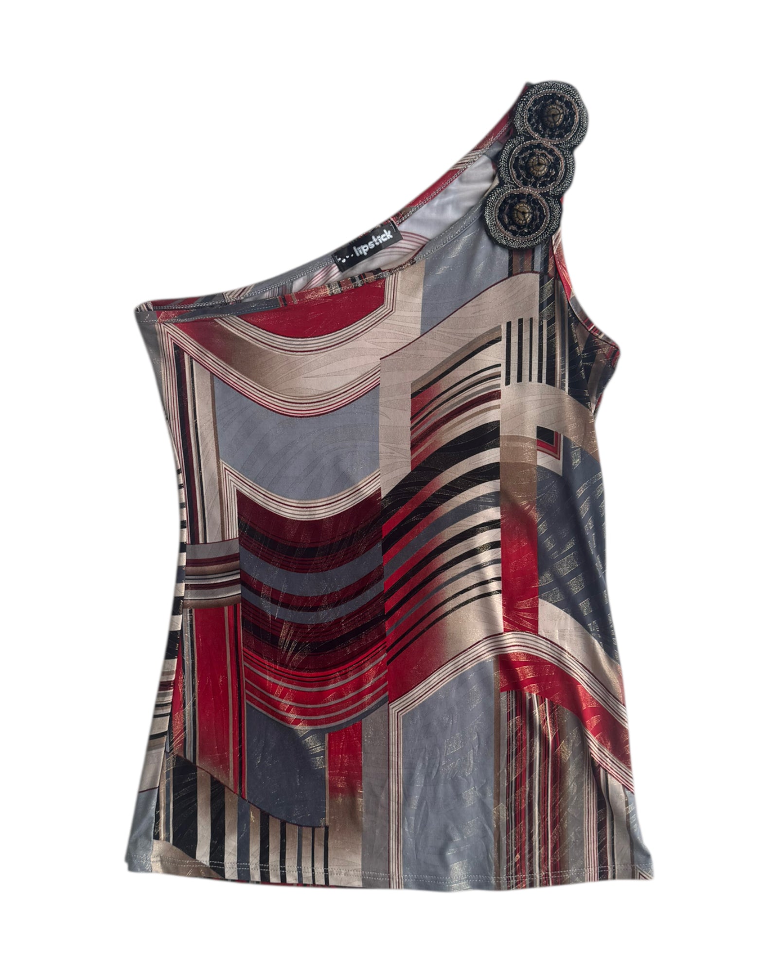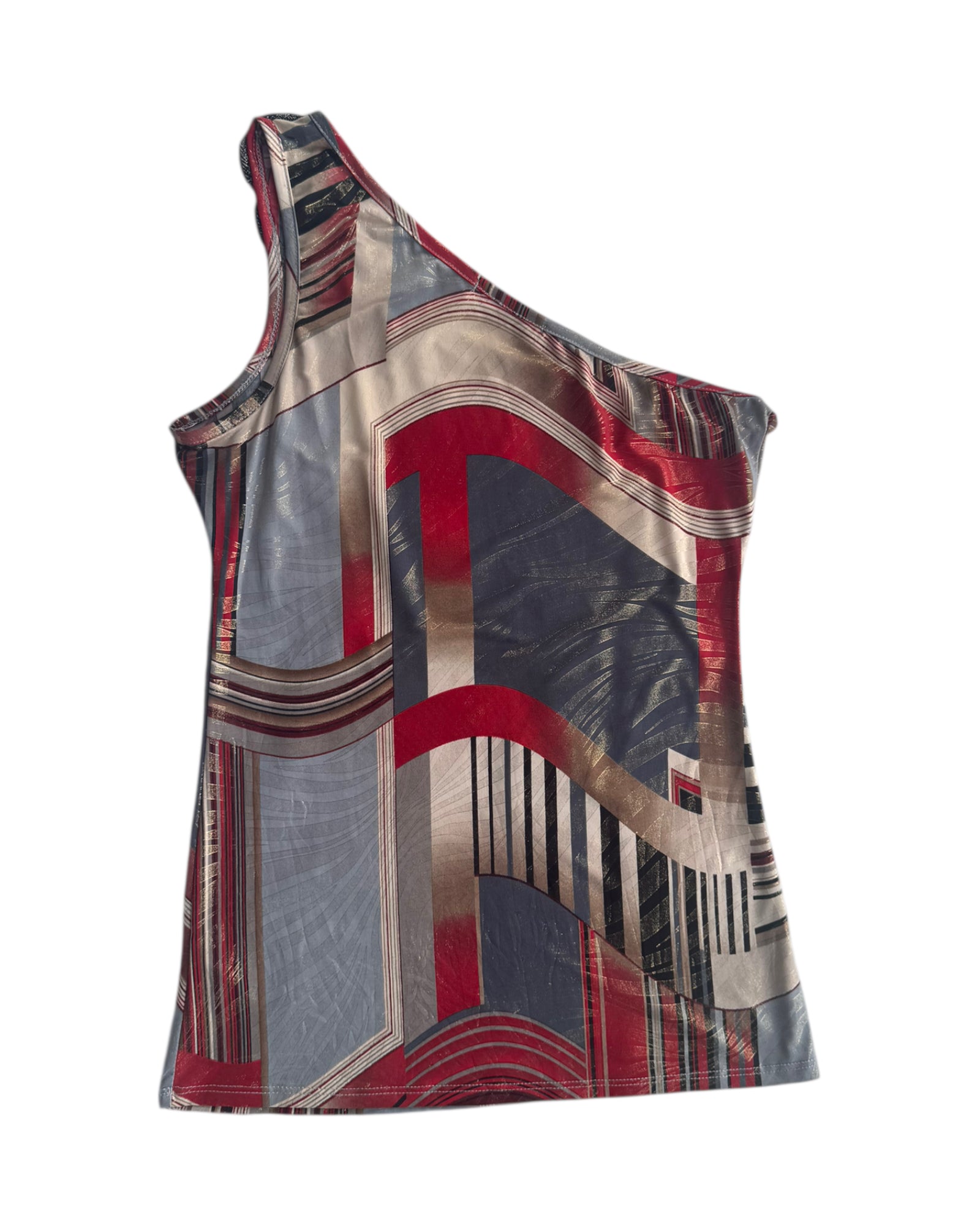 TOP DE UN HOMBRO CON PRINT SIMETRICO DE FIGURAS Y TRES PARCHES CON BORDADO NEGRO EN EL HPMBRO, TELA CON BRILLO METALICO. NO TIENE DETALLES, EN PERFECTAS CONDICIONES.