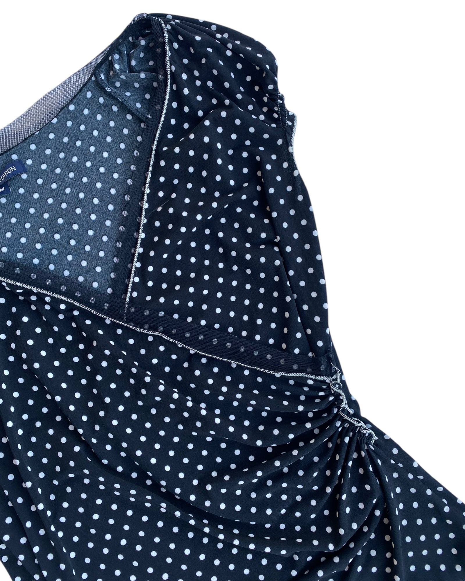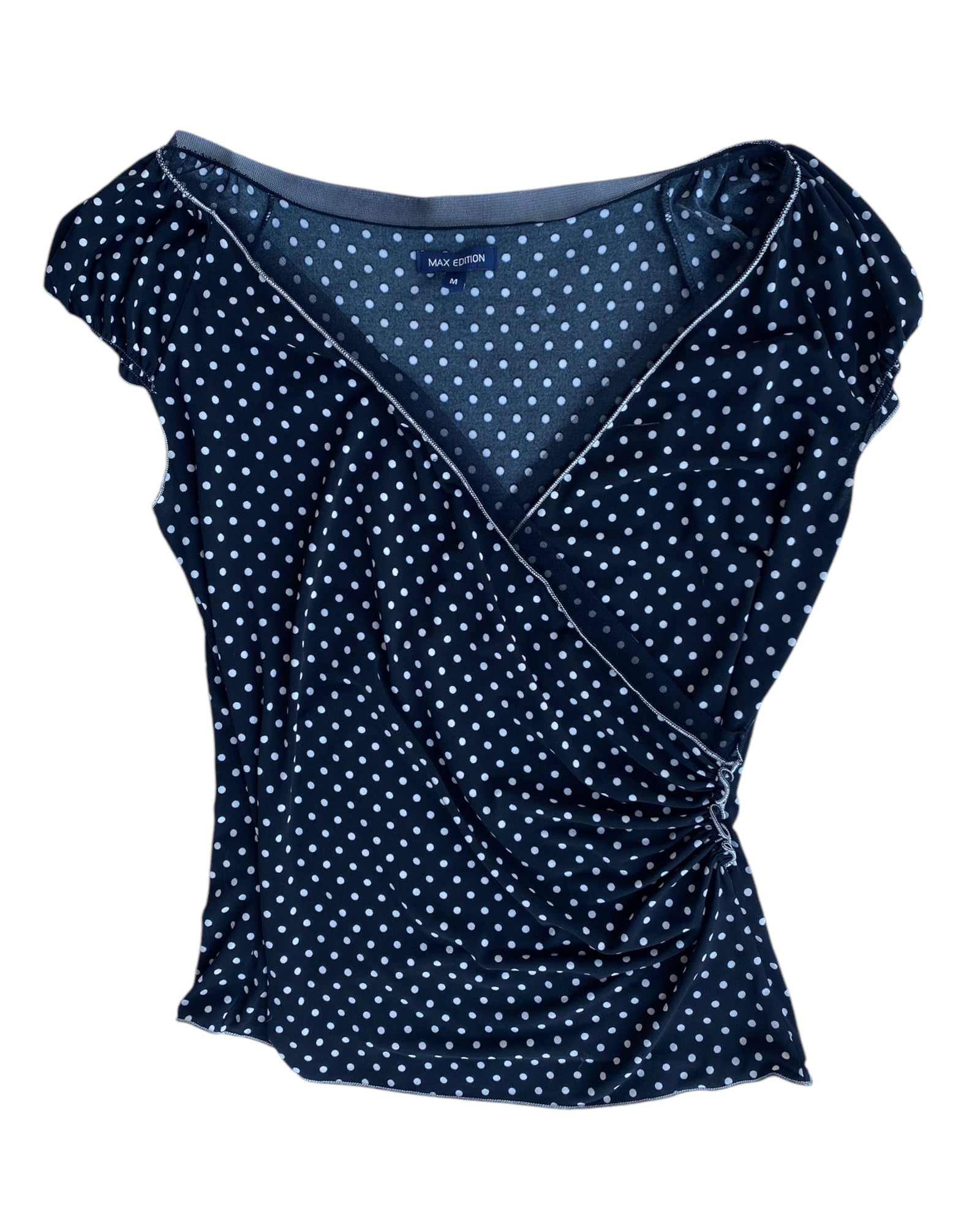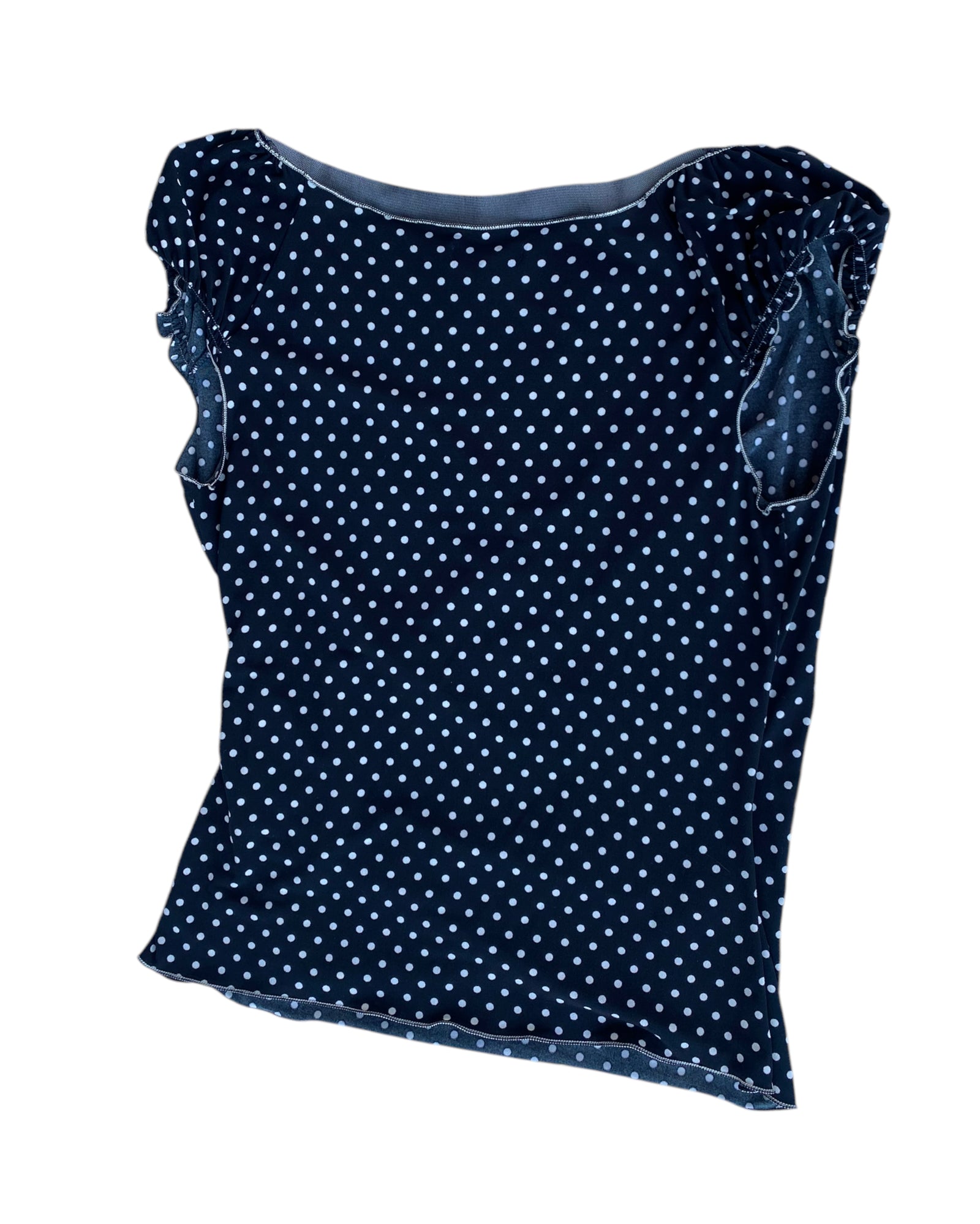 CAMISETA CON MANGAS PEQUEÑAS Y OLANES CON PECHO CRUZADO Y ABIERTO, PRINT DE PUNTOS BLANCOS EN COLOR NEGRO, 95% POLYESTER 5% SPANDEX, EN PERFECTO ESTADO.