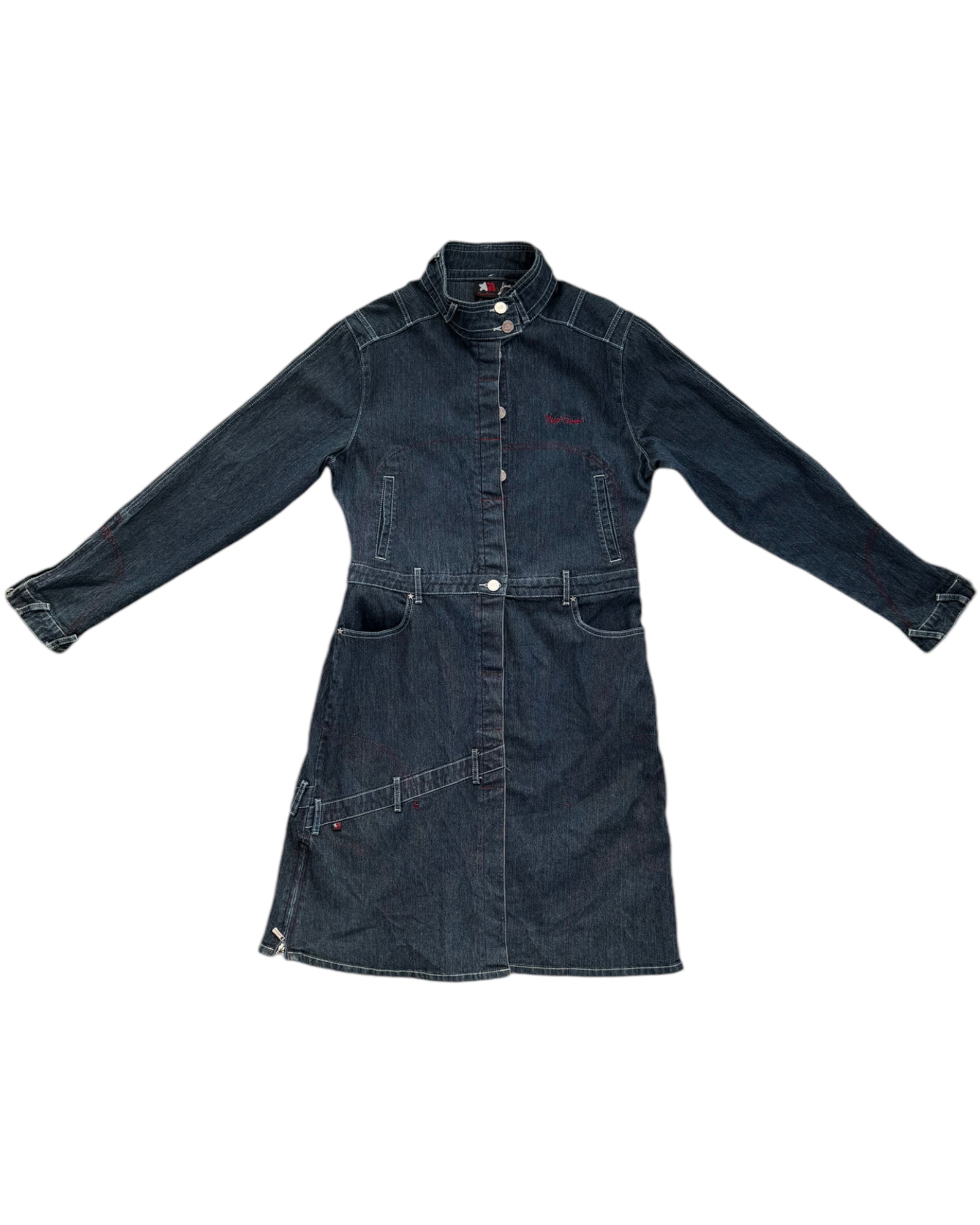 CHAMARRA LARGA TIPO GABARDINA DE MEZCLILLA OSCURA 83% ALGODON Y 15% POLYESTER, BOLSOS DELANTEROS FUNCIONALES, BORDADO DE LA MARCA EN ROJO DEL LADO IZQUIERDO. SIN DETALLES DE USO