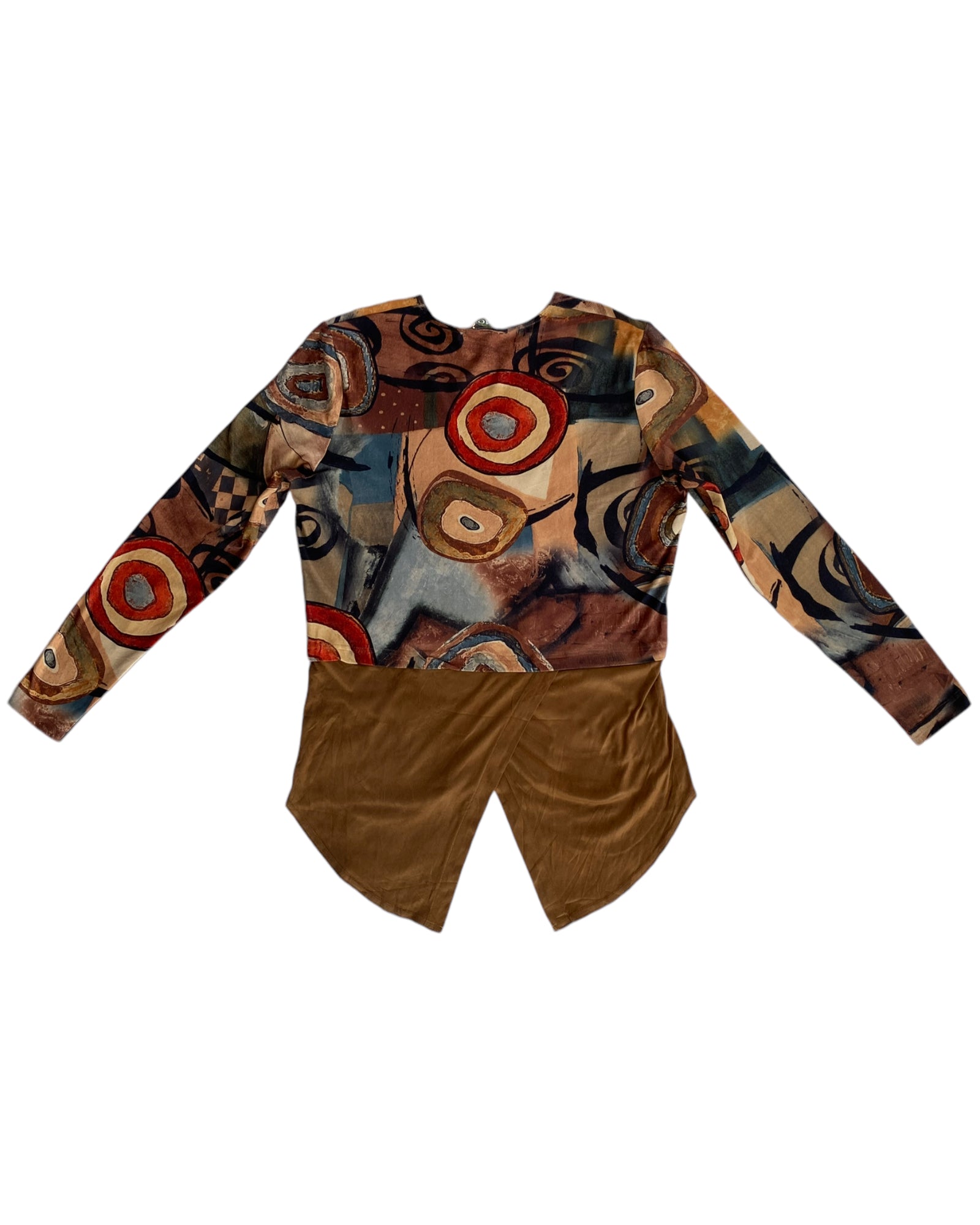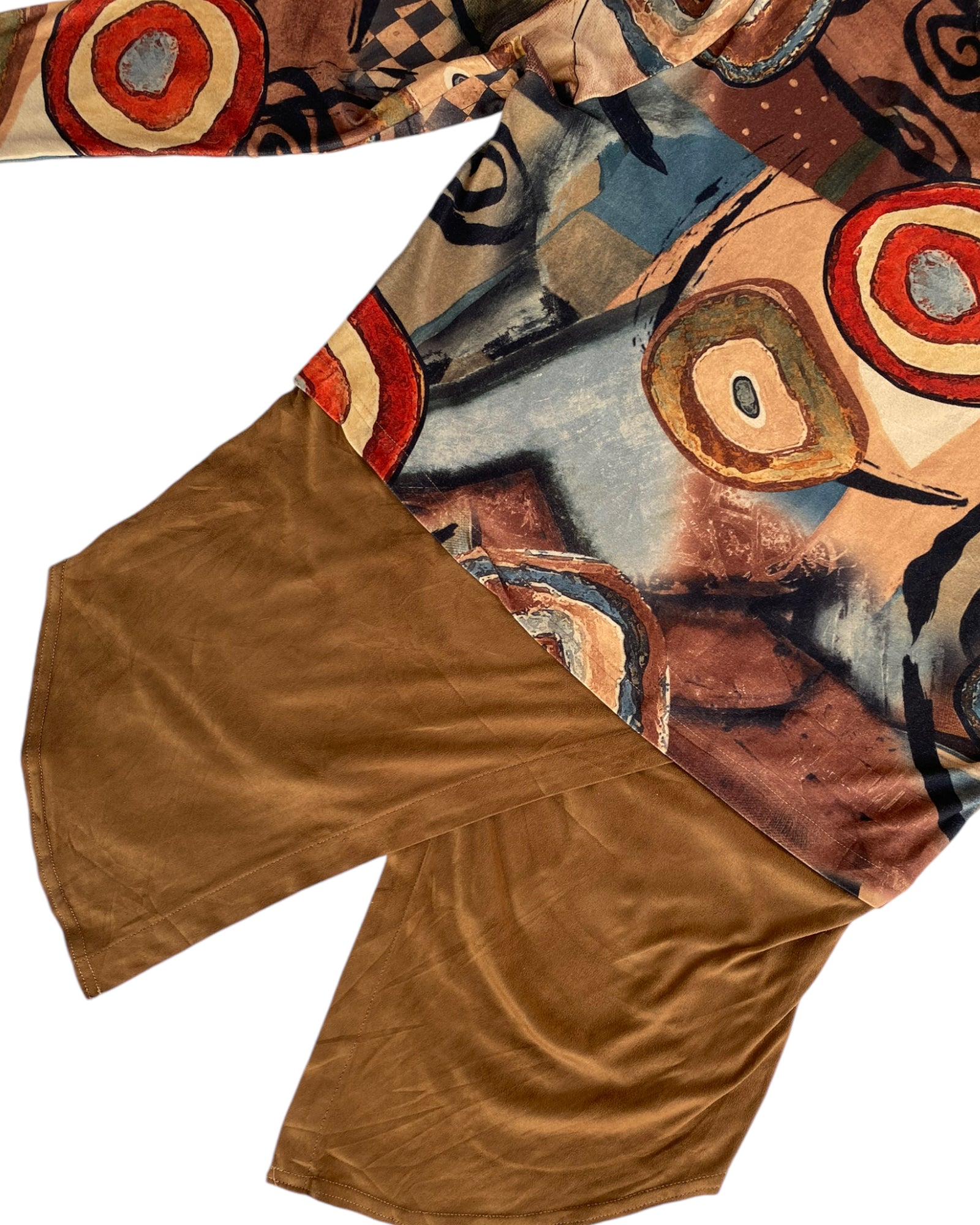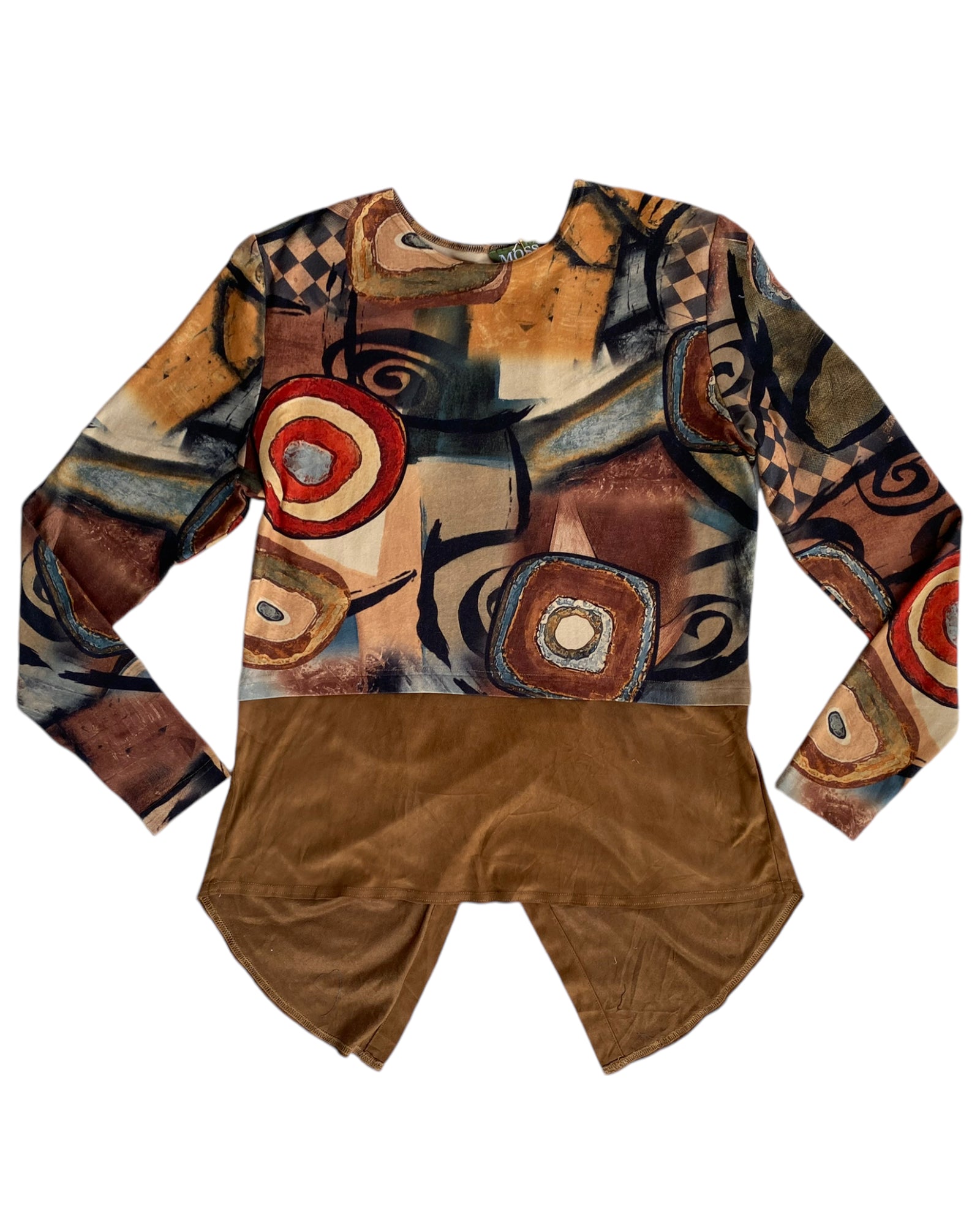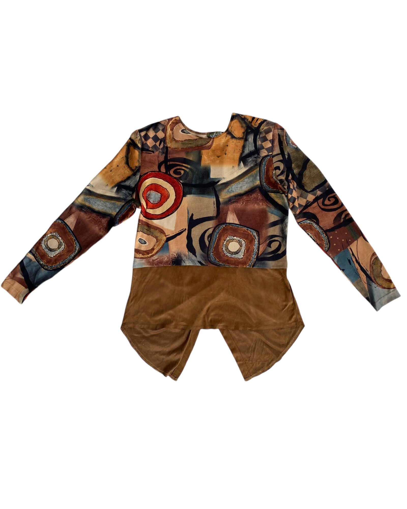 BLUSA CON DOS CAPAS; LA PRIMERA PRINT DE PINTURA CON FIGURAS GEOMETRICAS Y LA SEGUNDA CAPA DE TIPO ANTE CAFE. SIN DETALLES DE USO.