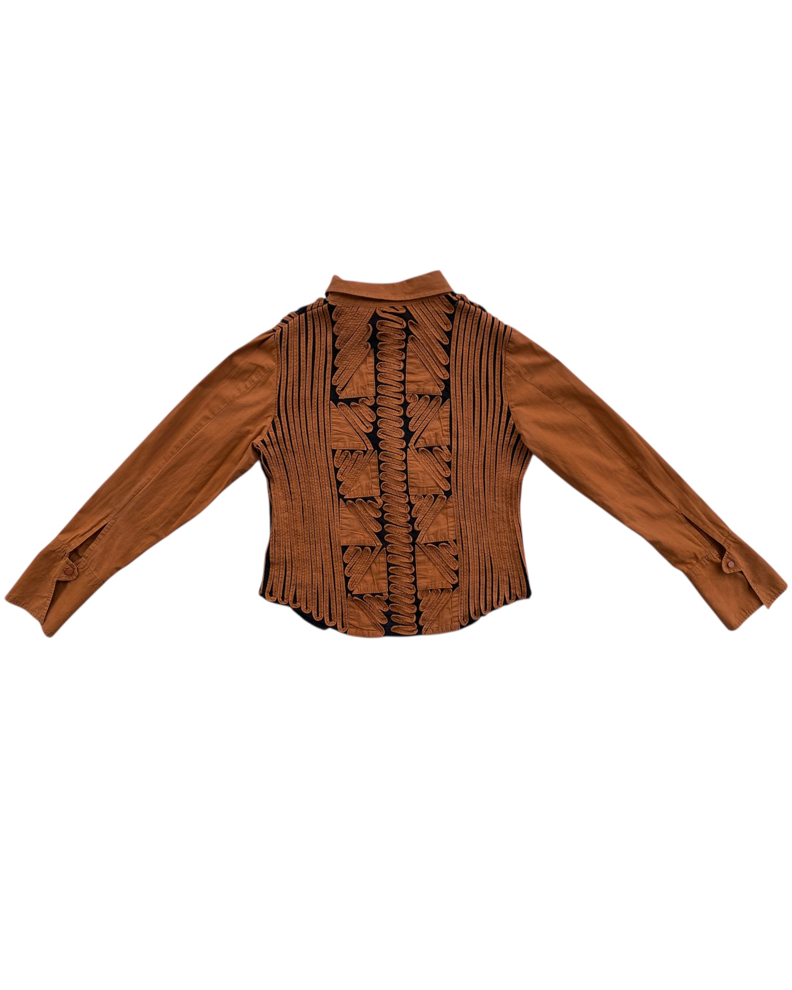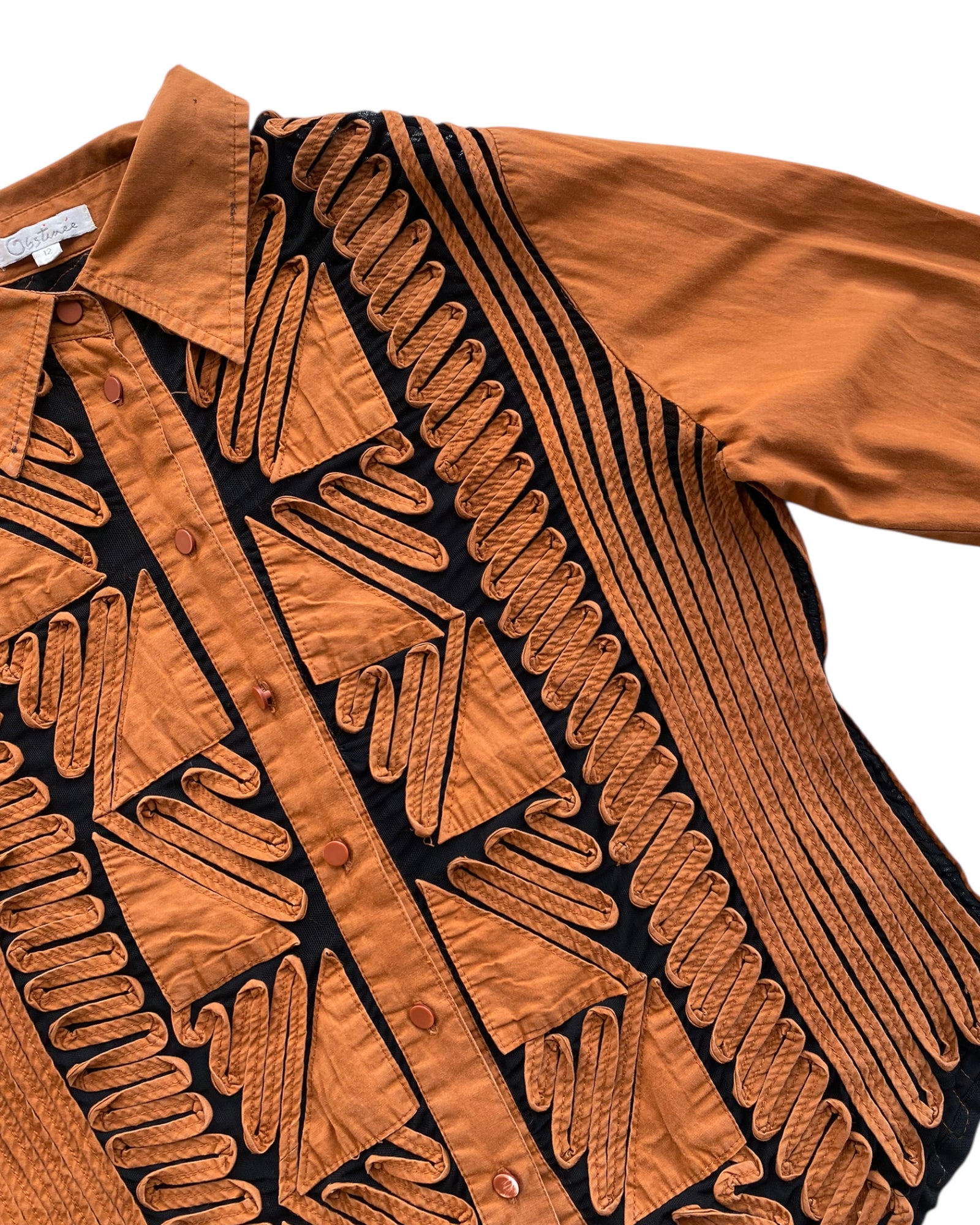 CAMISA DE BOTONES CON MESH NEGRO CON BORDADO EN COLOR NARANJA QUEMADO EN TODA LA PARTE FRONTAL, MANGAS EN COLOR NARANJA QUEMADO. EN PERFECTO ESTADO, 100% ALGODON