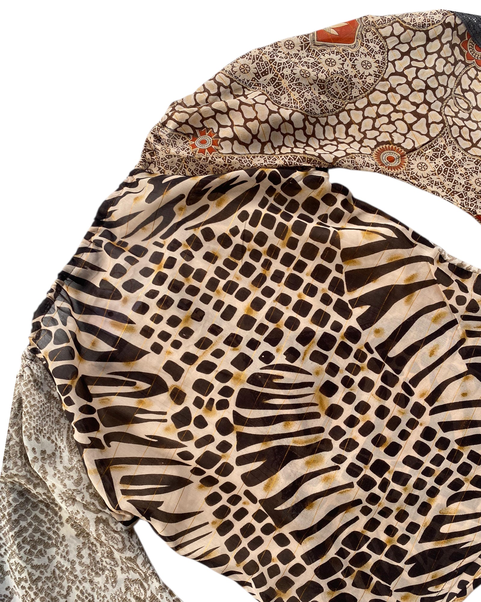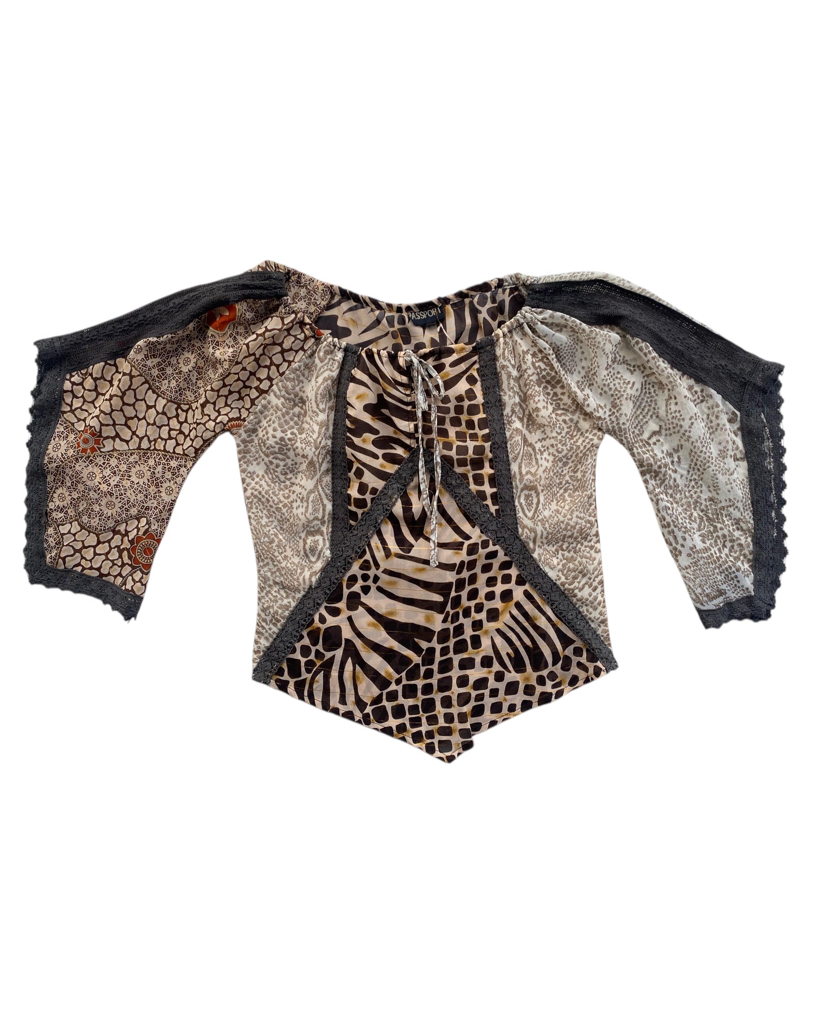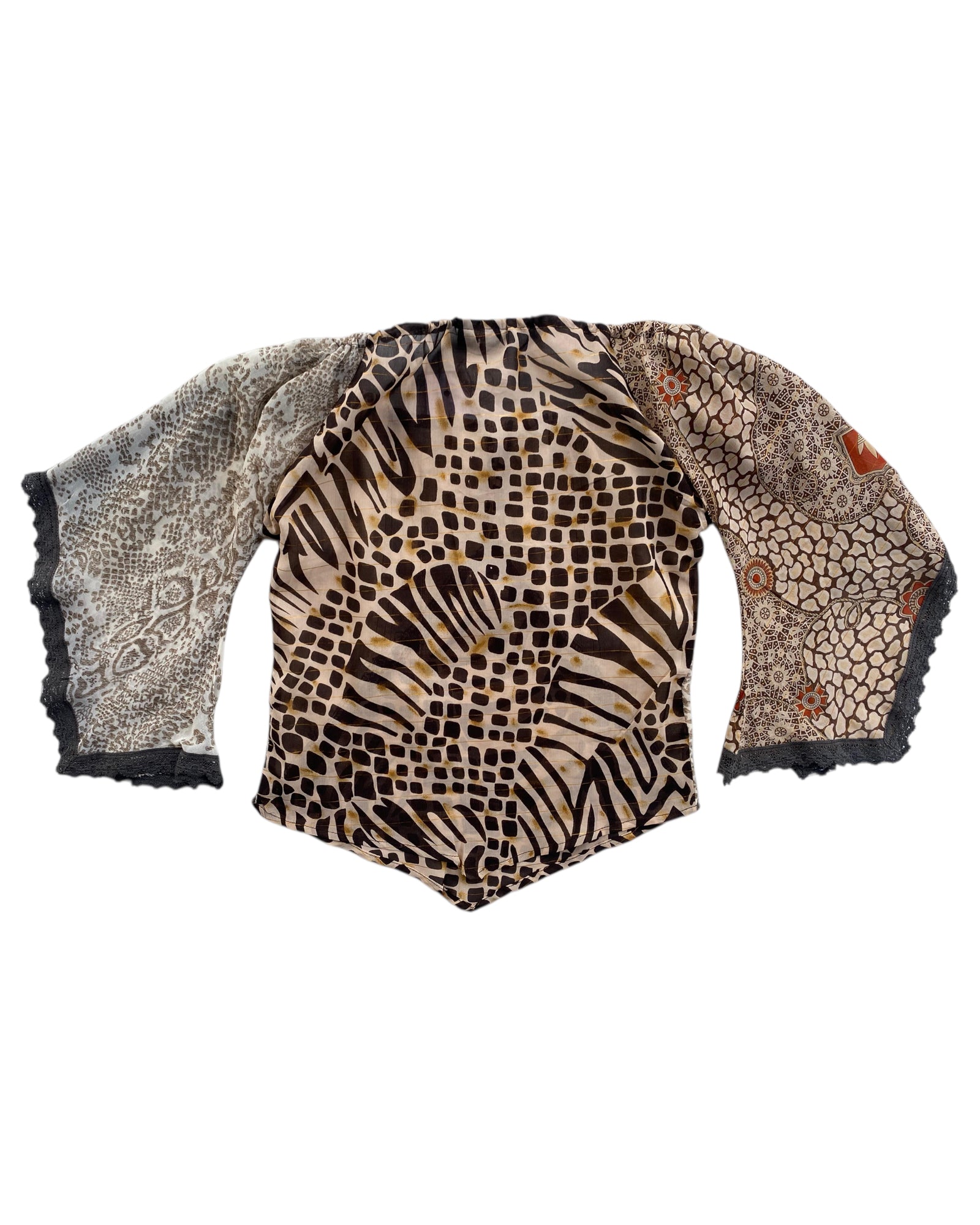 BLUSA CON MANGAS TIPO MURCIELAGO TRES CUARTOS LIGERAMENTE CROPPED, VARIOS PRINTS DISTINTOS DE MANDALA Y ANIMAL POR TODA LA BLUSA, ENCAJE GRIS EN MANGAS Y TRASERO, 100% POLYESTER. EN PERFECTO ESTADO