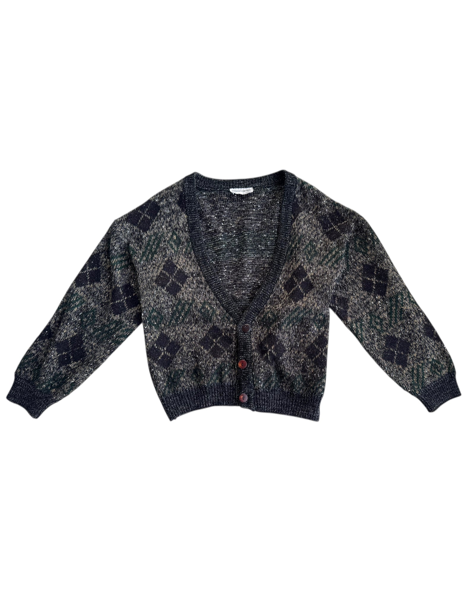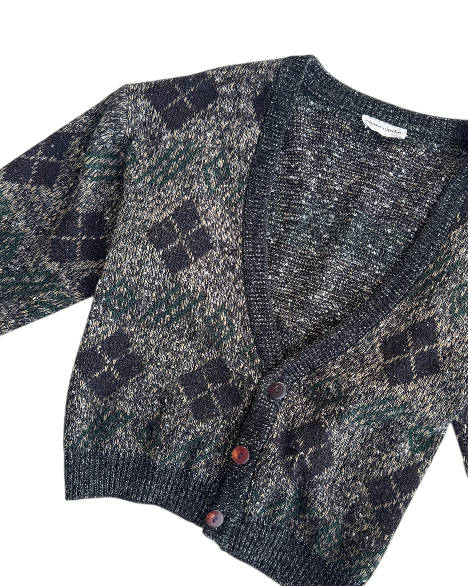 CARDIGAN EN COLOR NEGRO CON ROMBOS CAFÉS Y VERDES. CON TRES BOTONES EN PARTE DELANTERA, NO TIENE DETALLES, EN PERFECTO ESTADO.