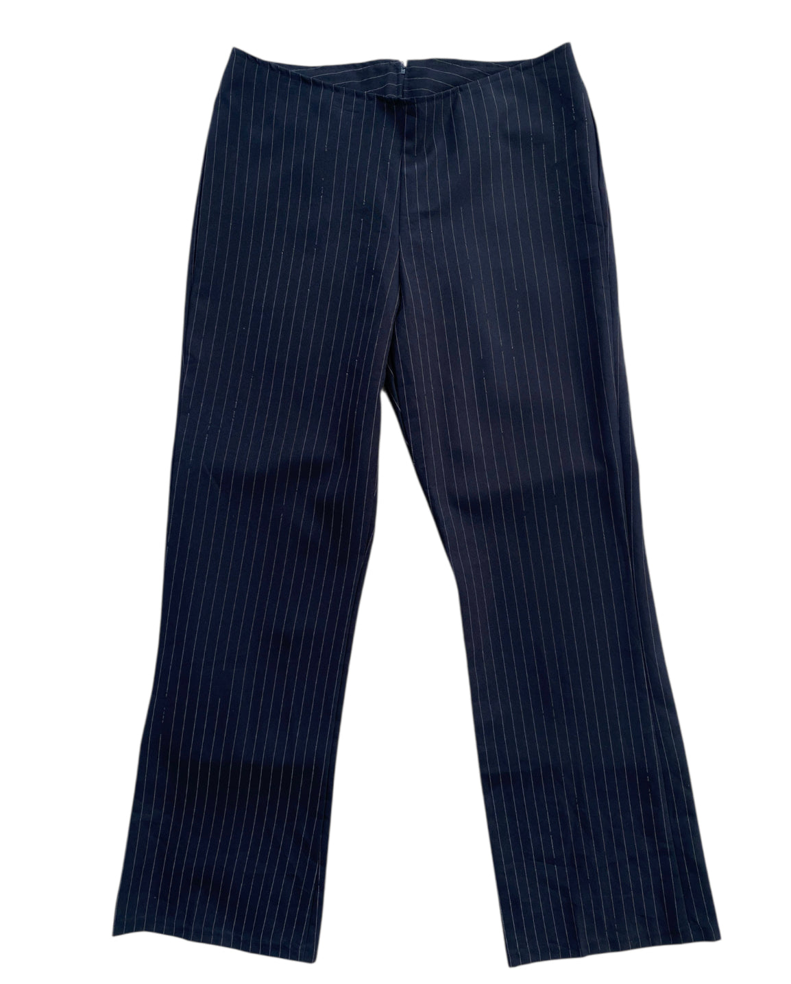 PANTALONES 100% POLYESTER NEGROS CON RAYAS VERTICALES BLANCAS Y CIERRE EN LA PARTE TRASERA PARA SUBIR, PATA ANCHA ESTILO FLARE, NO TIENE DETALLES, EN PERFECTO ESTADO.