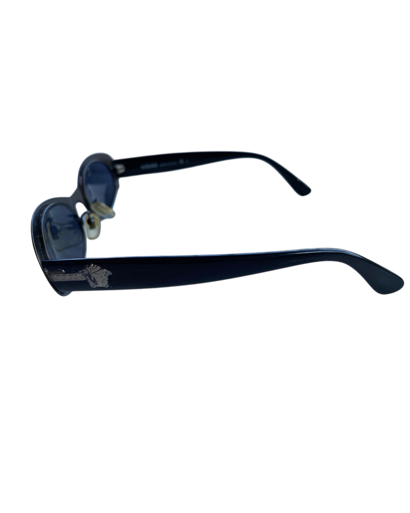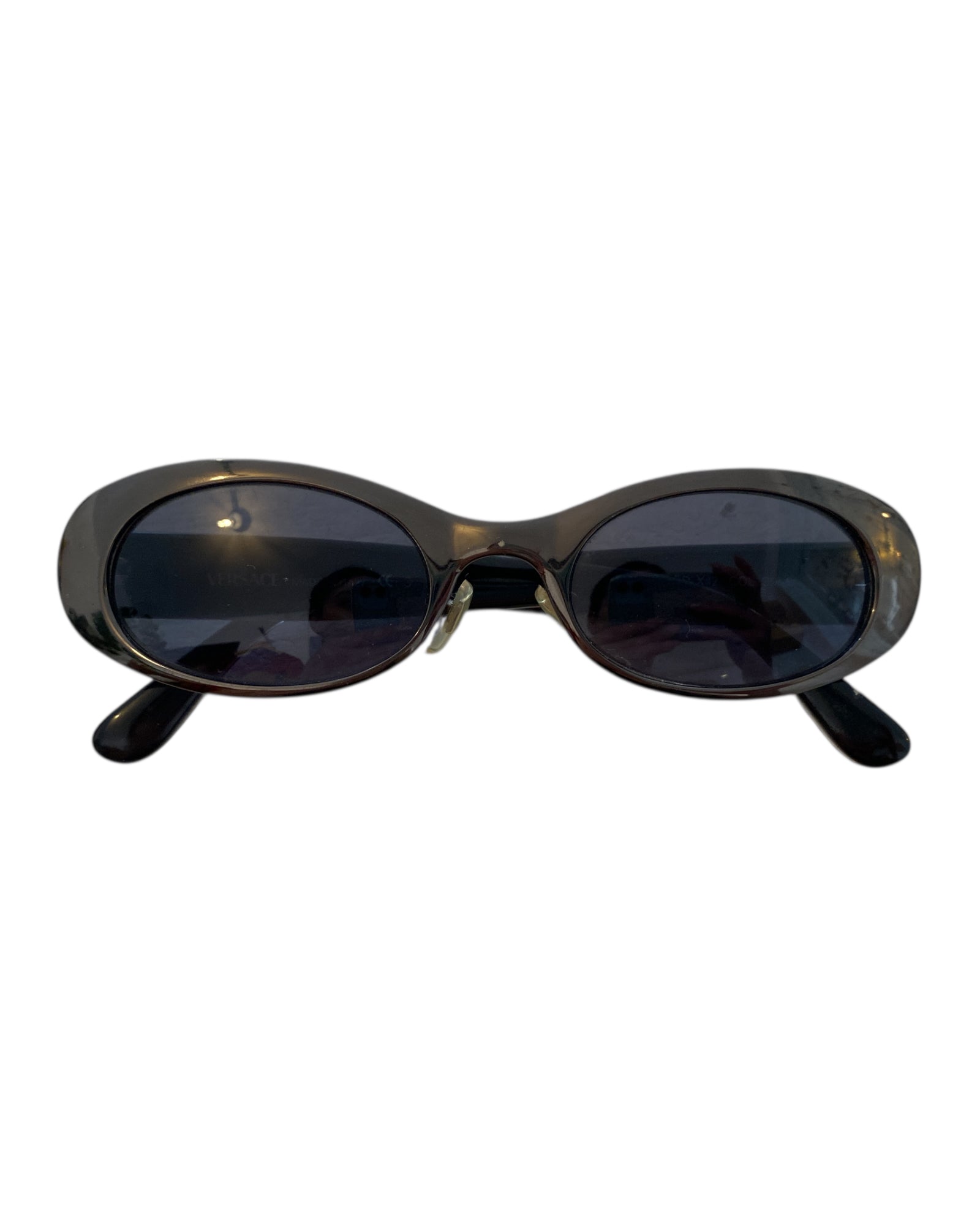 LENTES DE SOL VERSACE COLOR GRIS OXFORS CON MICAS NEGRAS, ESTILO OVALADO CON MEDUSA DE VERSACE EN COLOR PLATEADO EN AMBOS LADOS, MODELO X42, NO TIENE DETALLES, EN PERFECTO ESTADO.