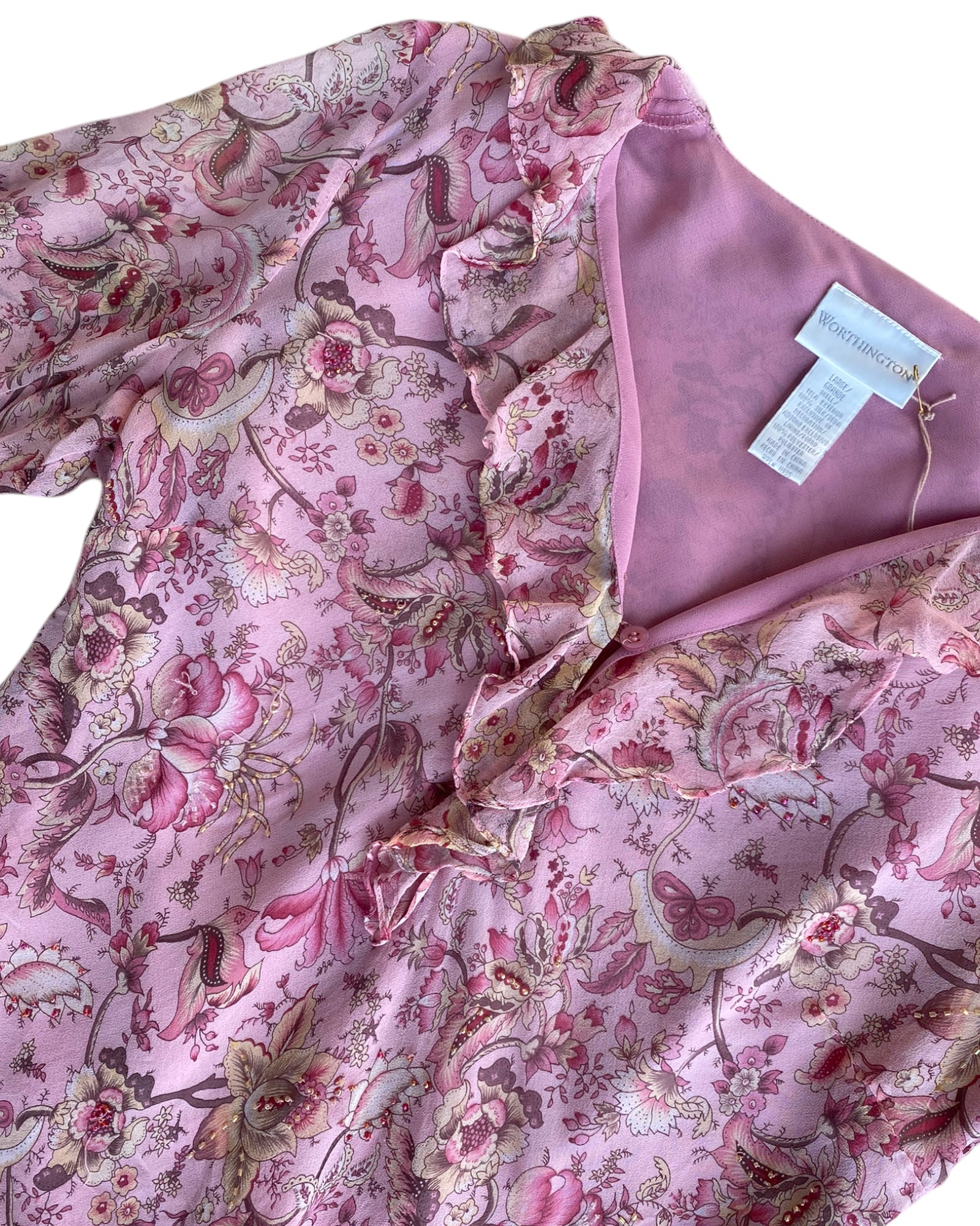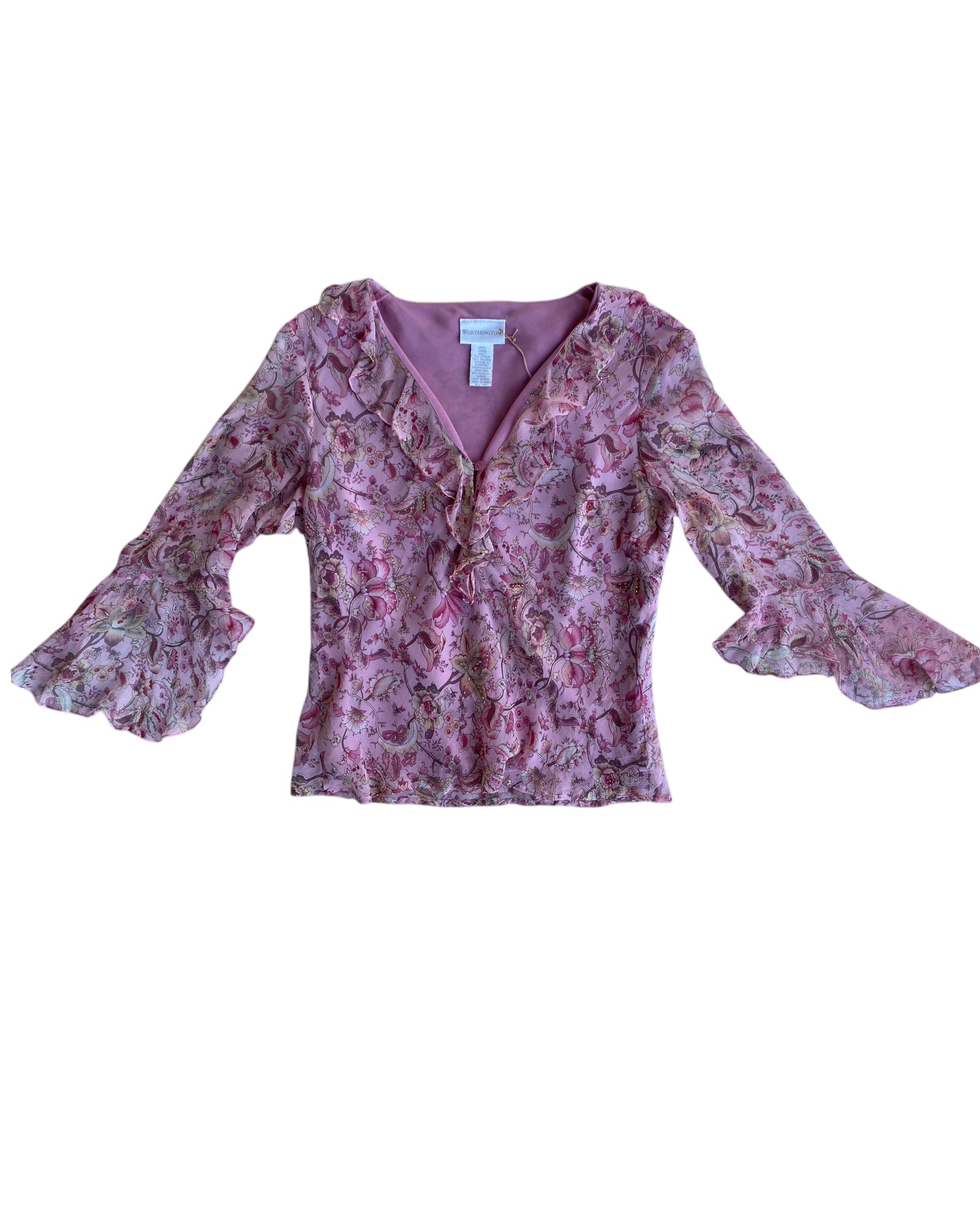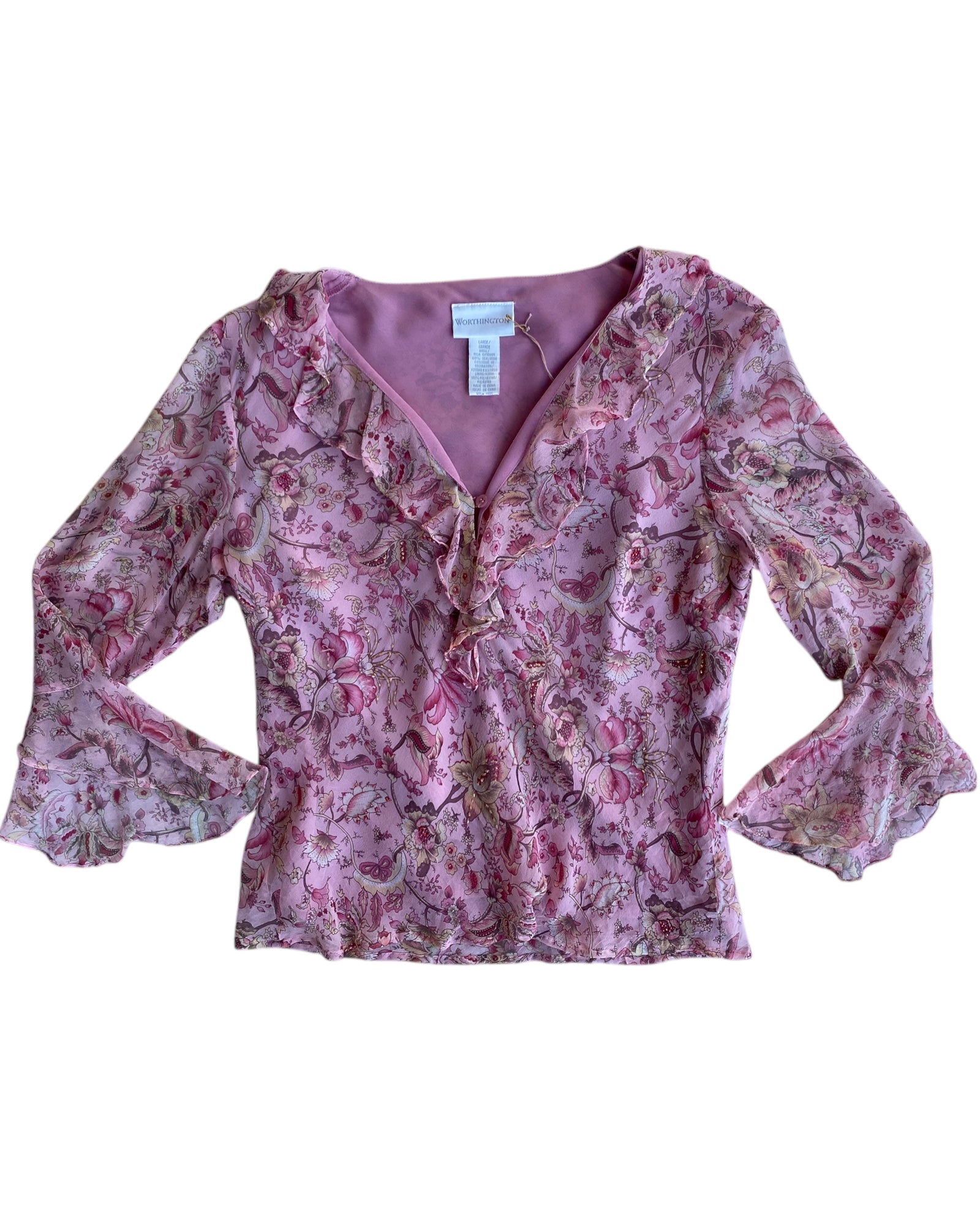 BLUSA 100% SEDA ROSA PETALO CON PRINT DE FLORES VARIADAS EN TONOS TIERRA, BOTONES EN LA PARTE DE EN MEDIO PARA CAMBIAR ESCOTE Y OLAN EN EL ESCOTE. PERFECTO ESTADO