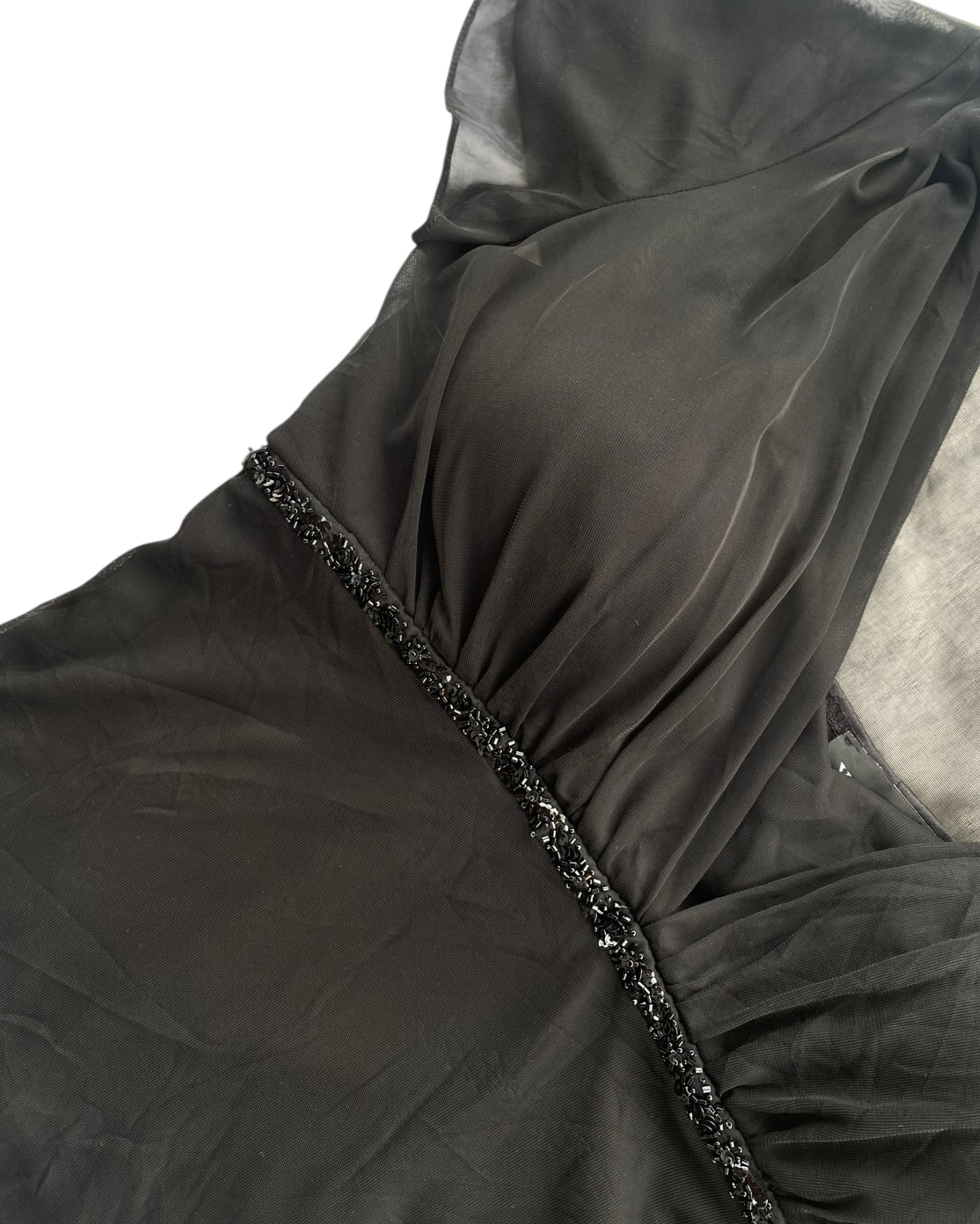 BLUSA 100% POLYESTER EN COLOR NEGRO CON TELA DE MESH Y CUELLO EN V, BANDA DE CUENTAS NEGRAS DEBAJO DEL PECHO, FORRO INCLUIDO Y COPAS. NO TIENE DETALLES, EN PERFECTO ESTADO.