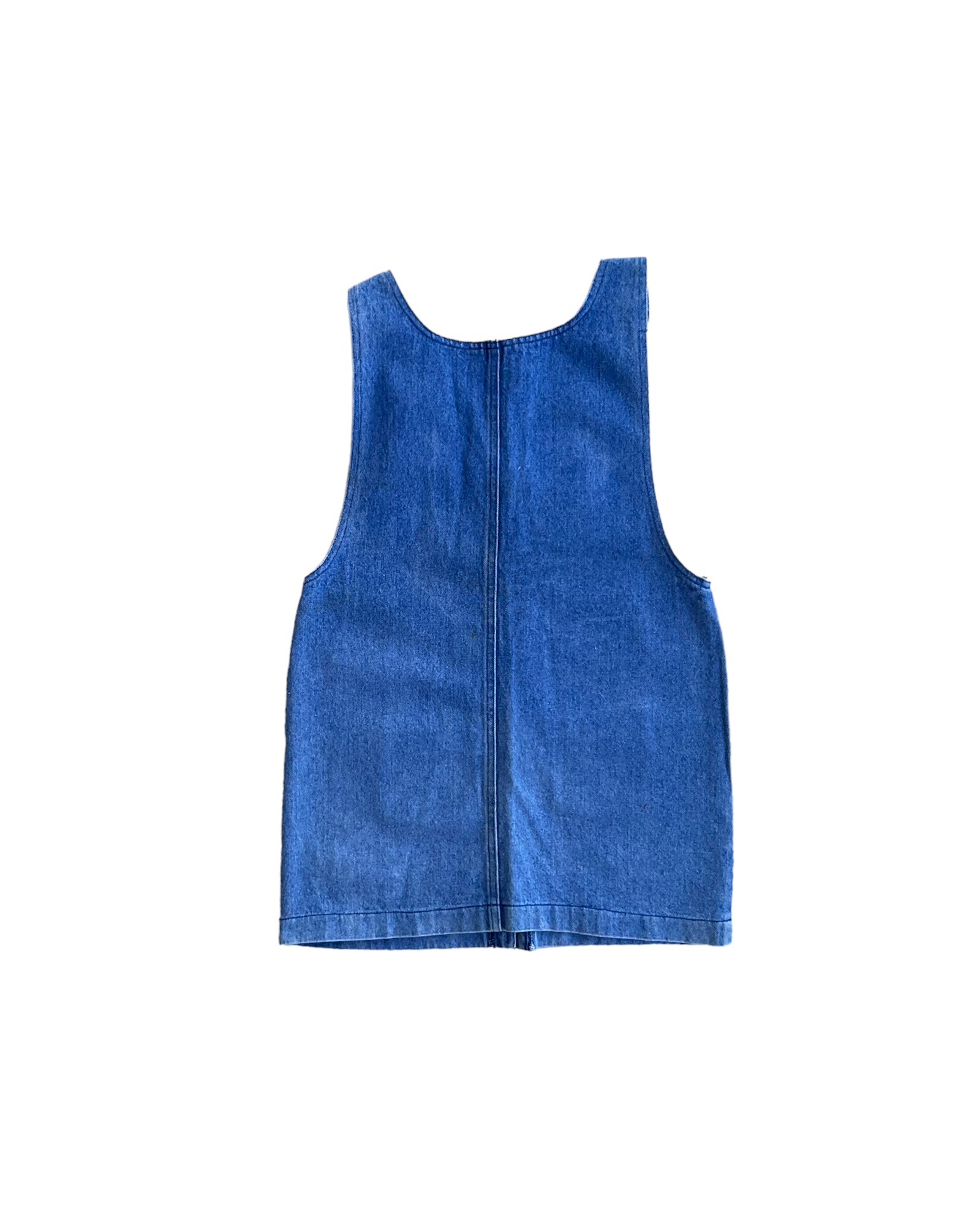 OVEROL DE MEZCLILLA COLOR AZUL CLARO DÁLMATA BORDADO EN EL PECHO. BOTONES CENTALES CROMADOS. DOS BOLSILLOS DELANTEROS. SIN DETALLES DE USO.