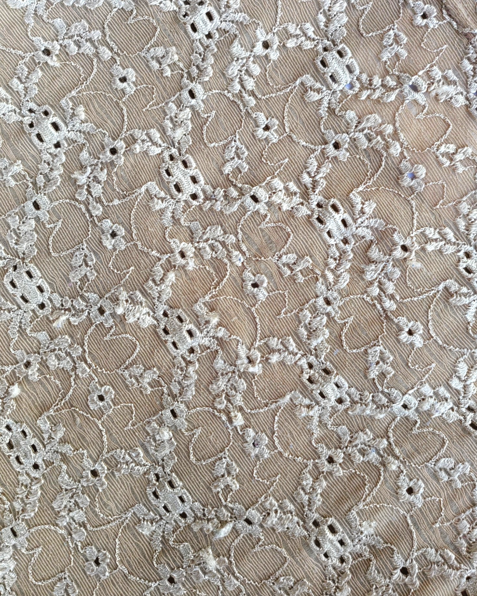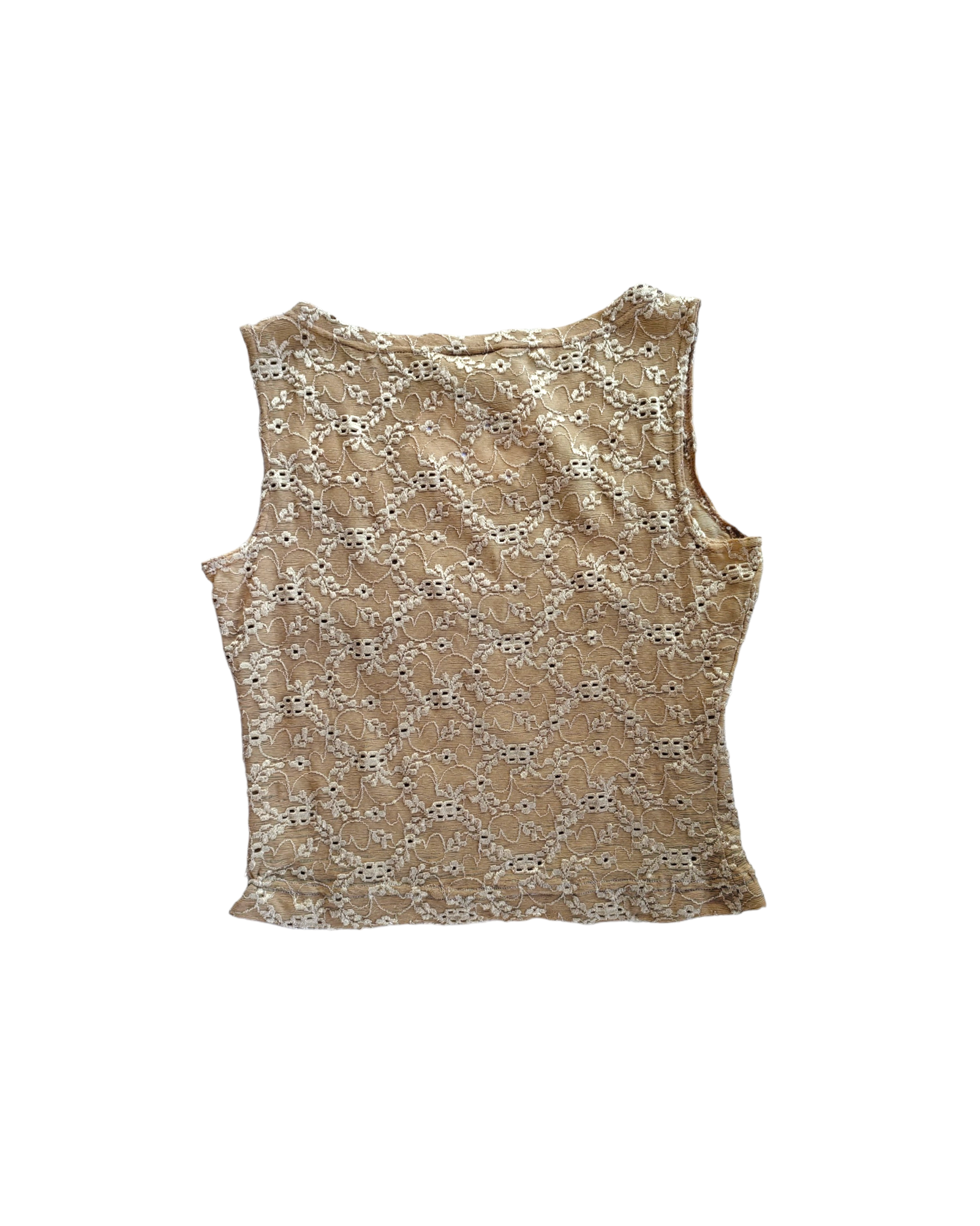 TOP COLOR BEIGE CON DETALLES BORDADOS DE FLORES ESTILO ENCAJE. SIN DETALLES DE USO.