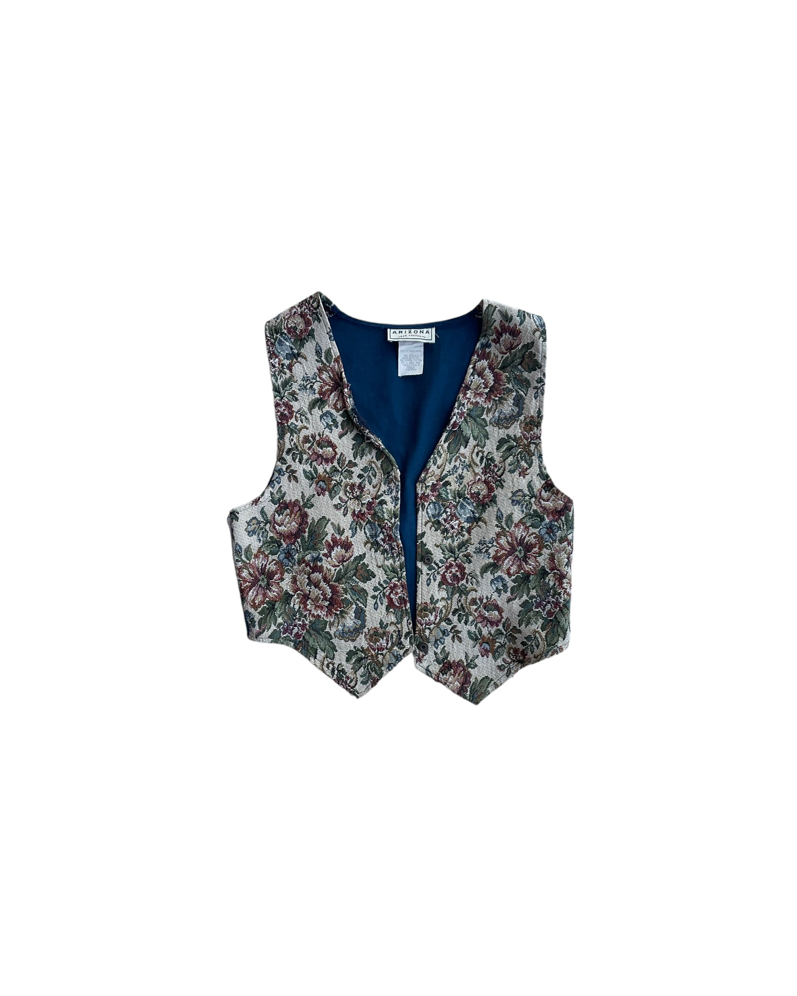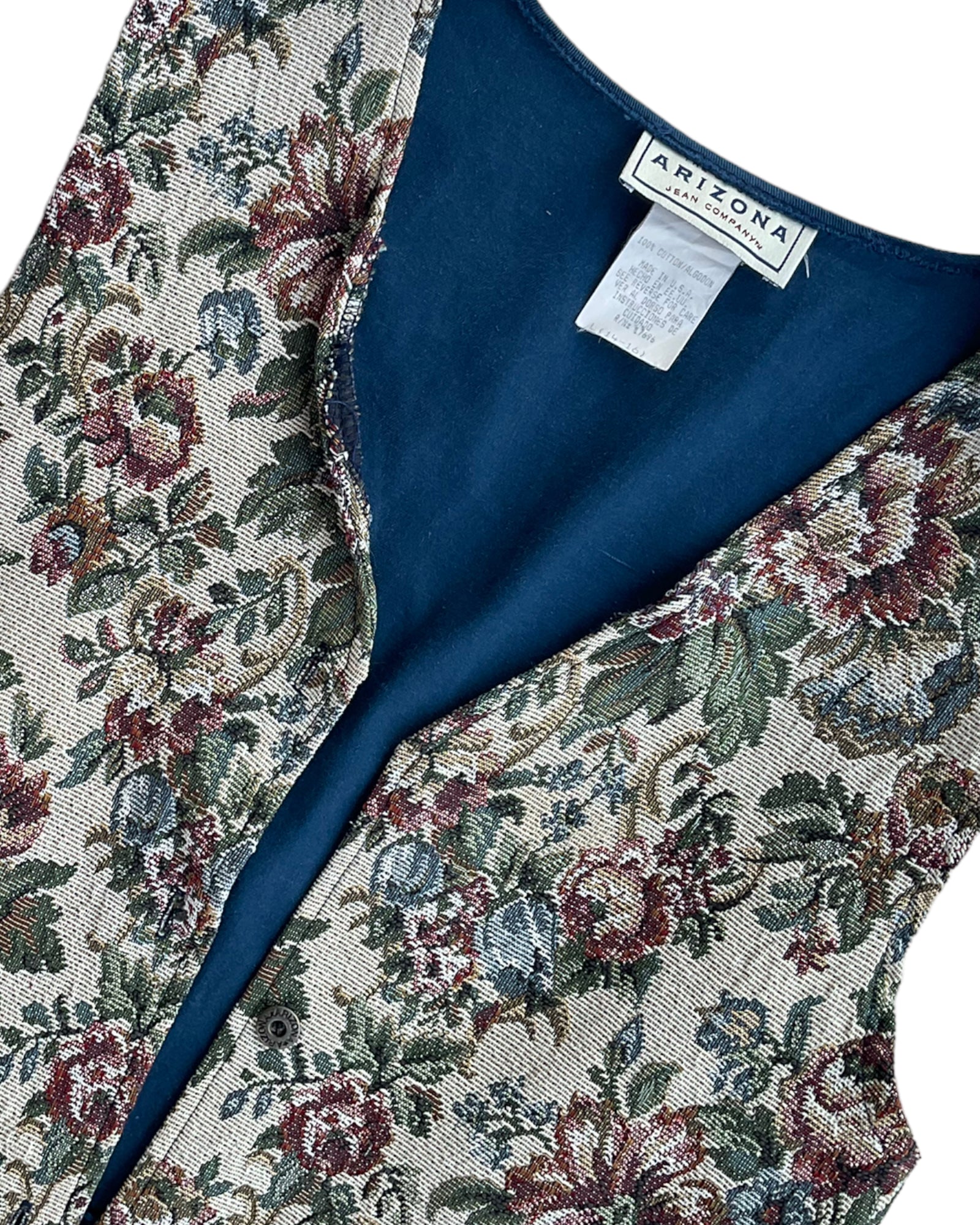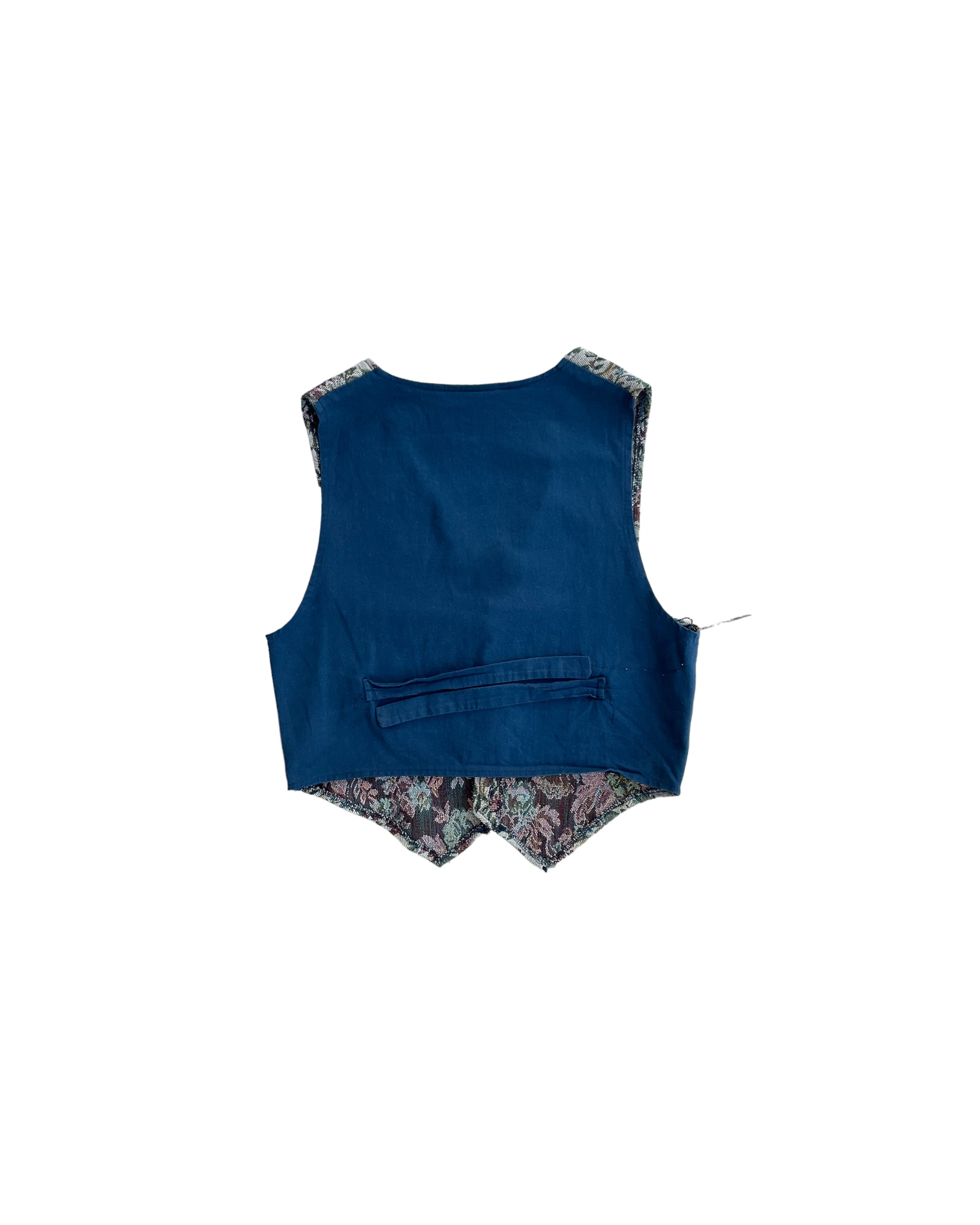 CHALECO 100% ALGODÓN DE COLOR BLANCO CON PATRÓN DE FLORES CON RELIEVE EN EL FRENTE, AZUL MARINO ATRÁS. SI UNO DE LOS BOTONES ORIGINALES.