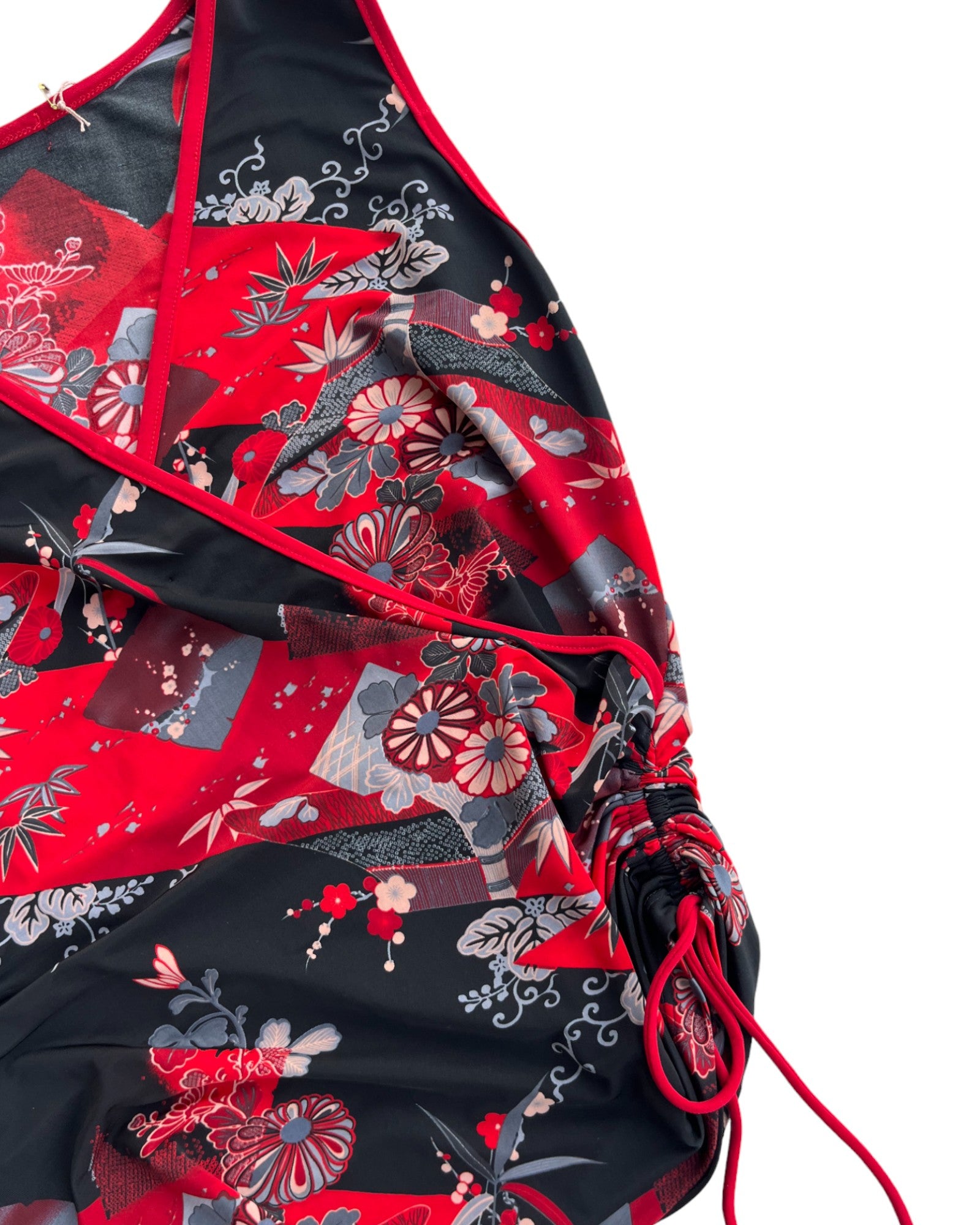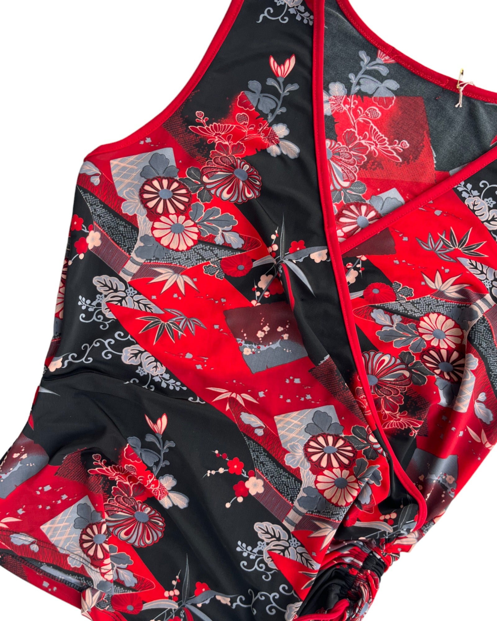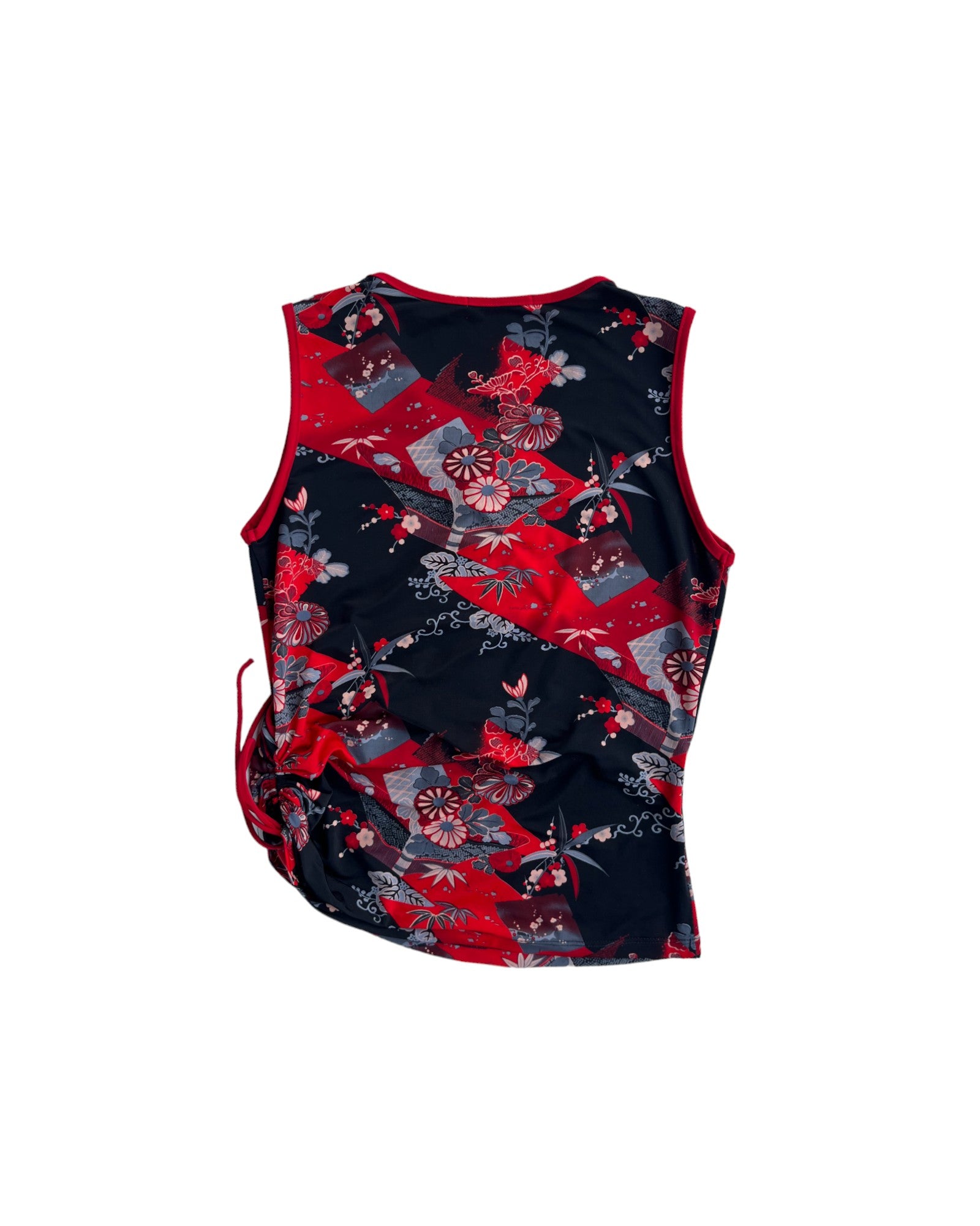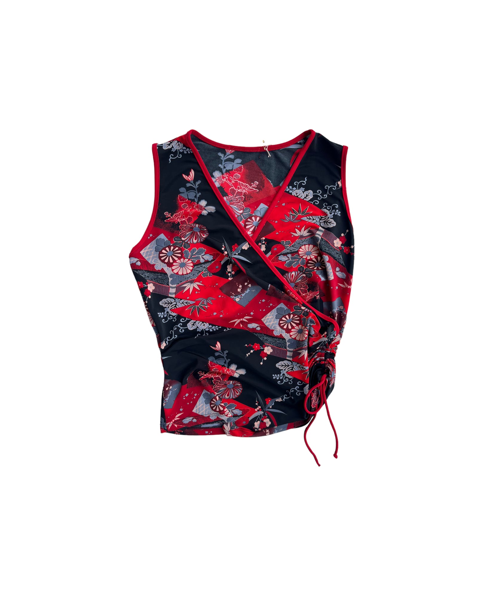 TOP NEGRO CON PRINT DE FLORES ROJAS Y GRIS. TELA MICRO MESH. ESTIRA Y AJUSTA AL CUERPO. ESCOTE EN -V- Y DETALLE DE RUSHING EN UN COSTADO. SIN DETALLES DE USO