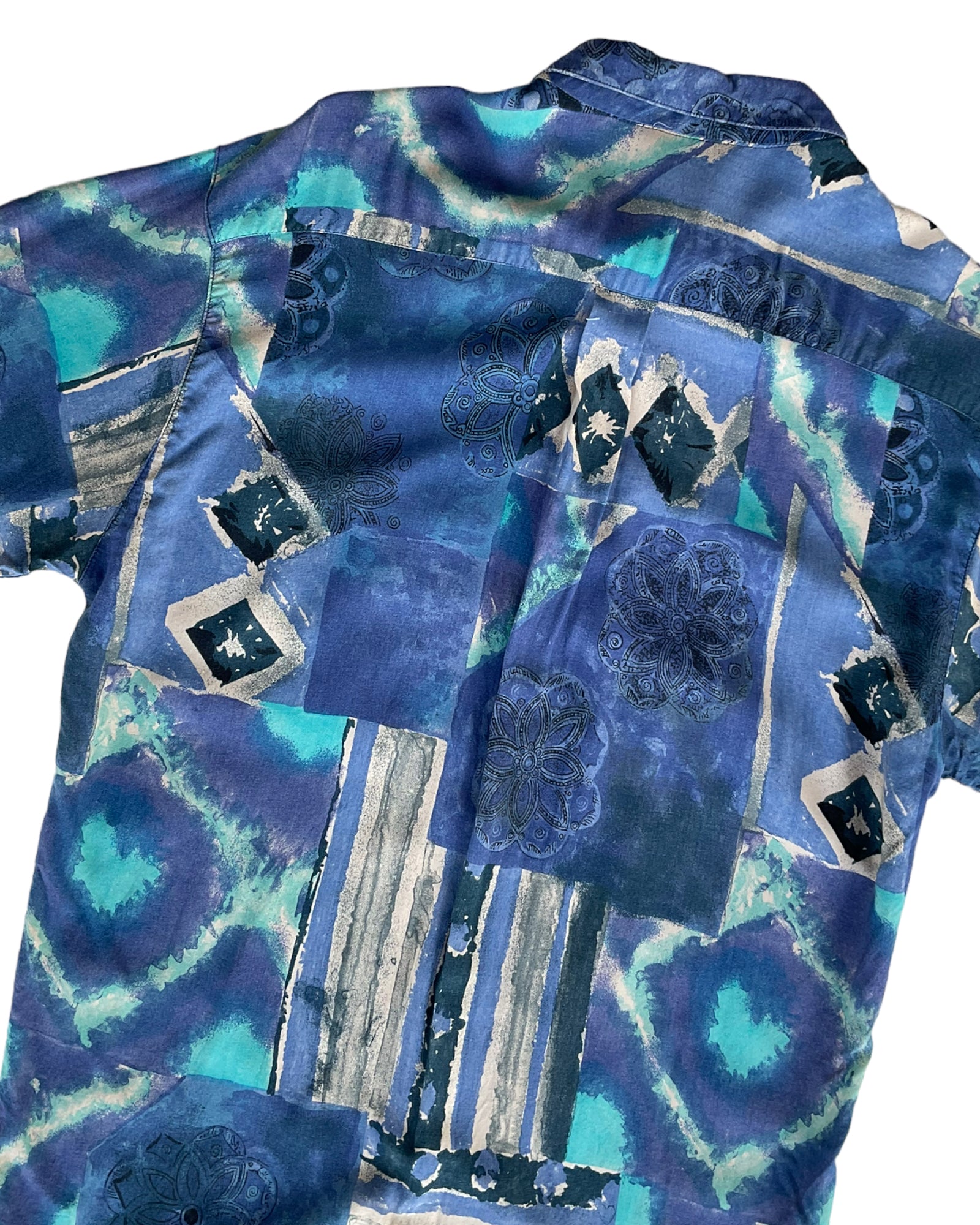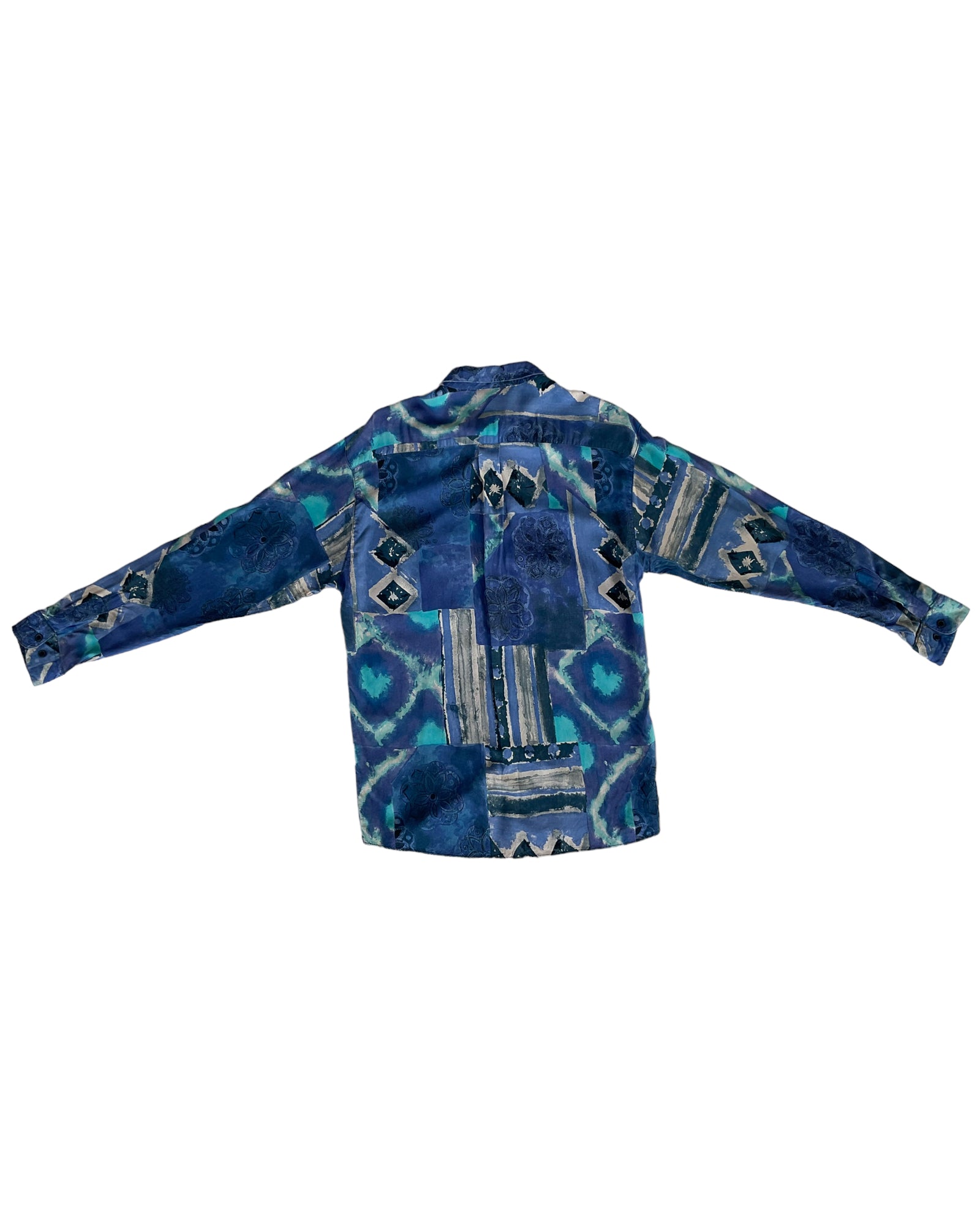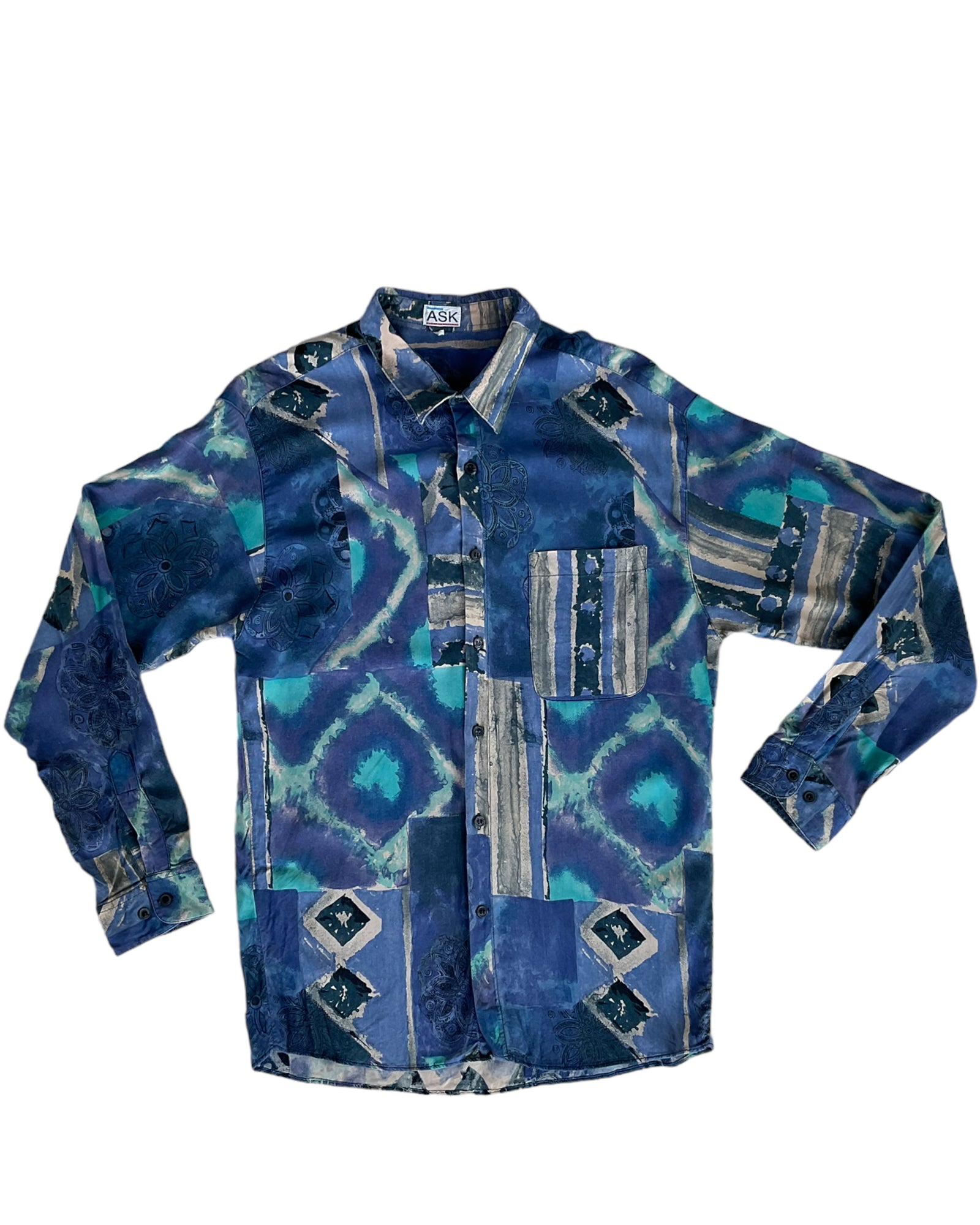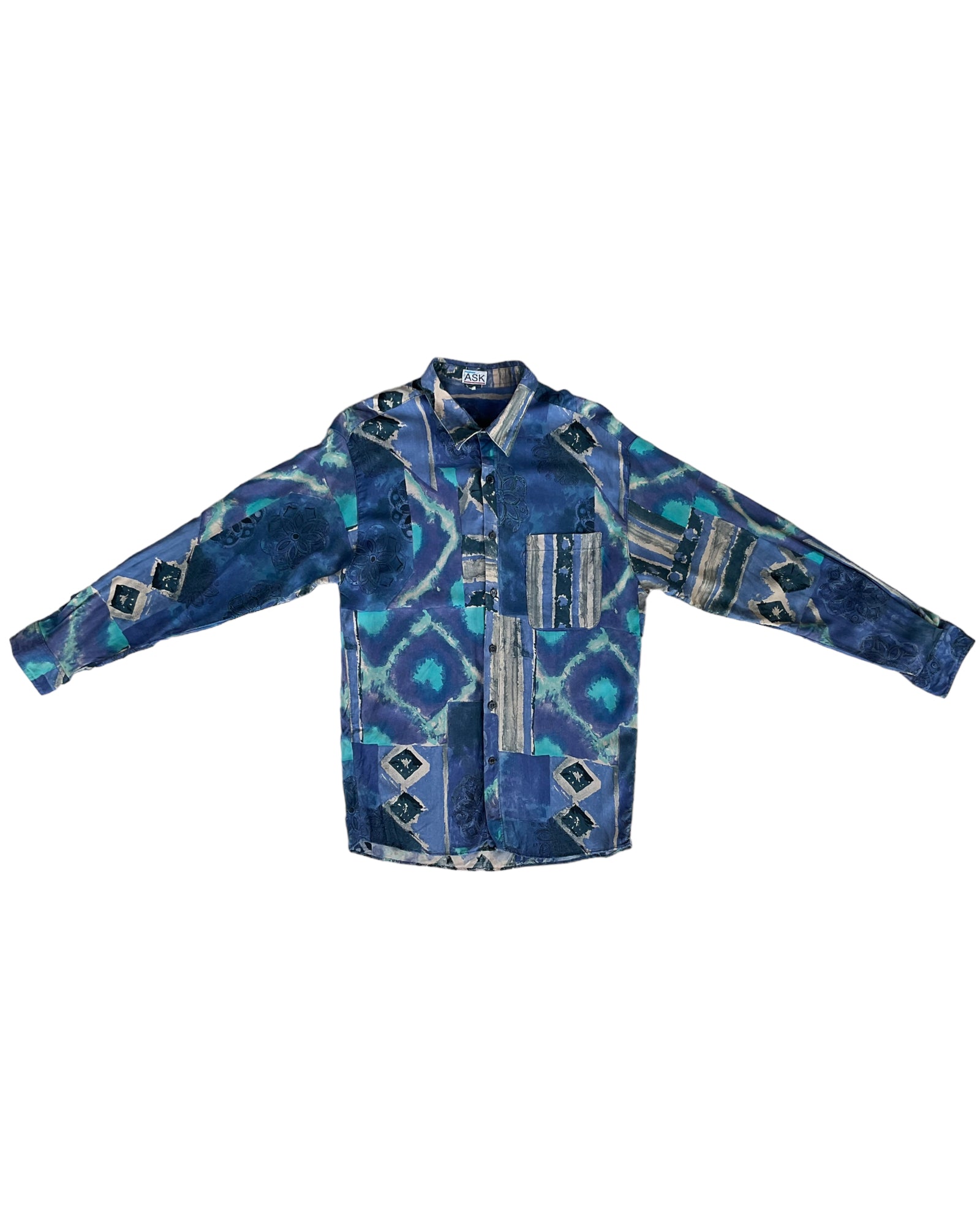 CAMISA MANGA LARGA 100% RAYÓN EN TONOS AZULES Y VERDES. UN BOLSILLO FRONTAL. SIN DETALLES DE USO.