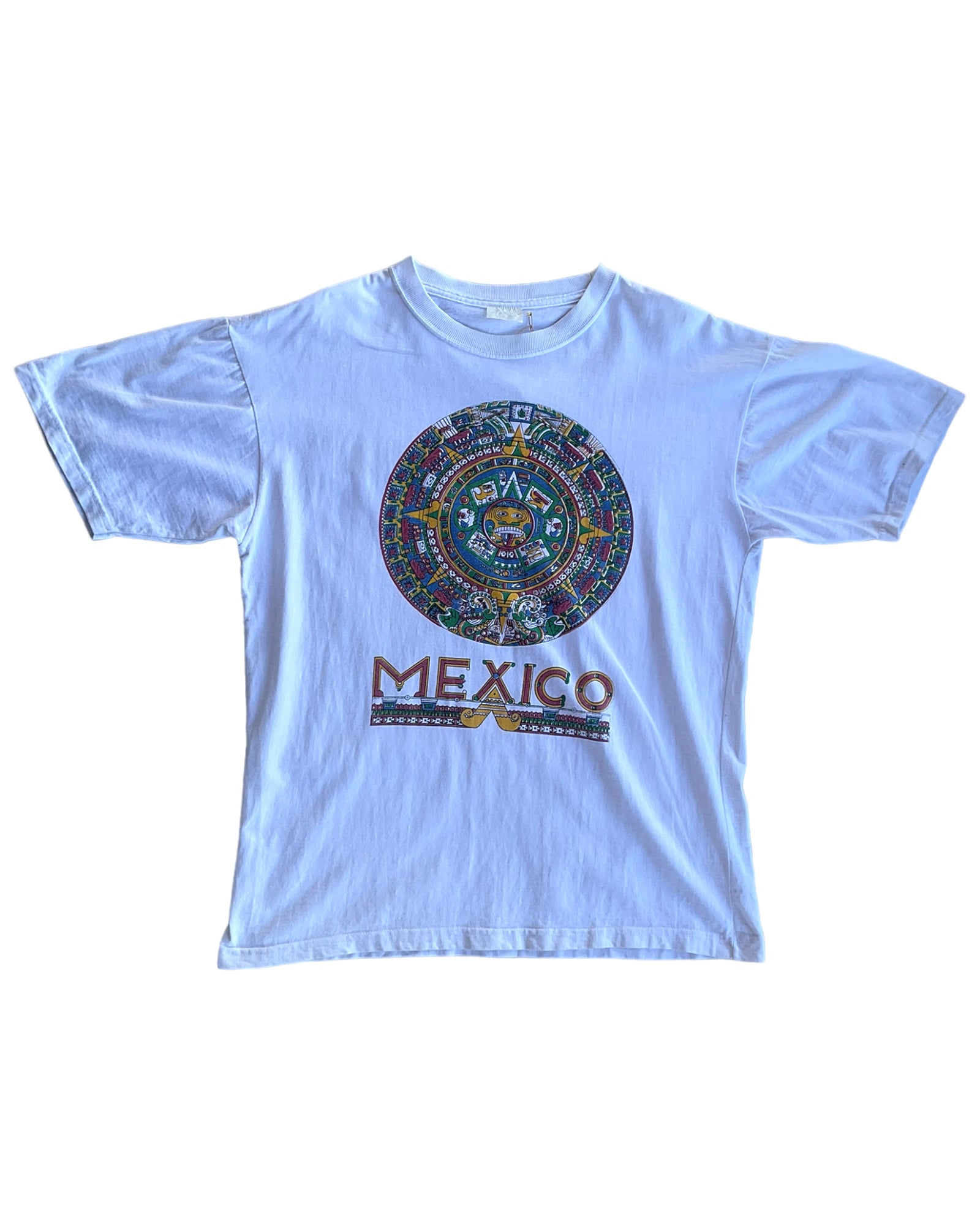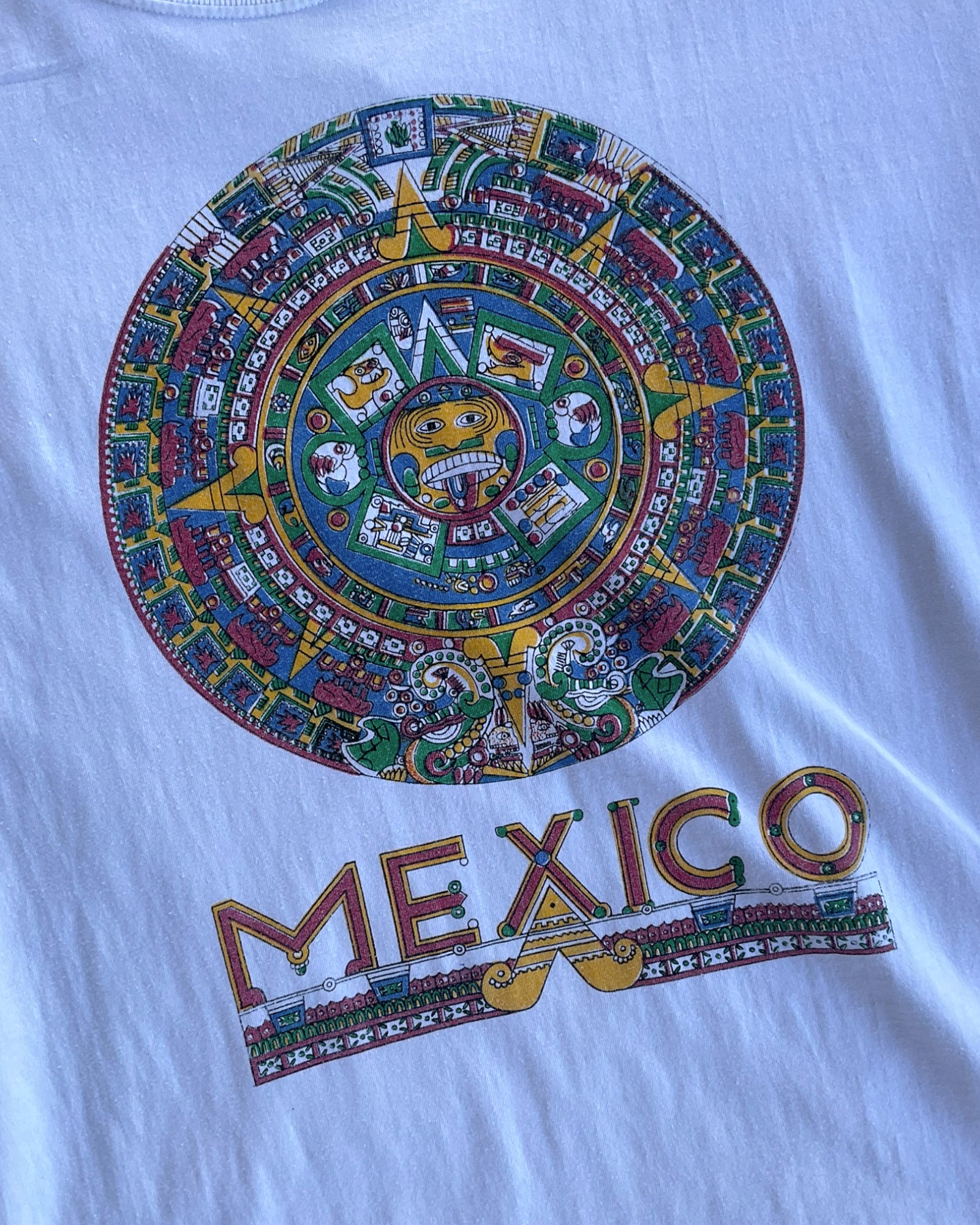 PLAYERA COLOR BLANCO 100% ALGODÓN CON ESTAMPADO DE MÉXICO Y EL CALENDARIO AZTECA EN COLORES AMARILLO, AZUL, VERDE Y ROJO. LIGERO DESGASTE EN EL ESTAMPADO POR ANTIGÜEDAD.