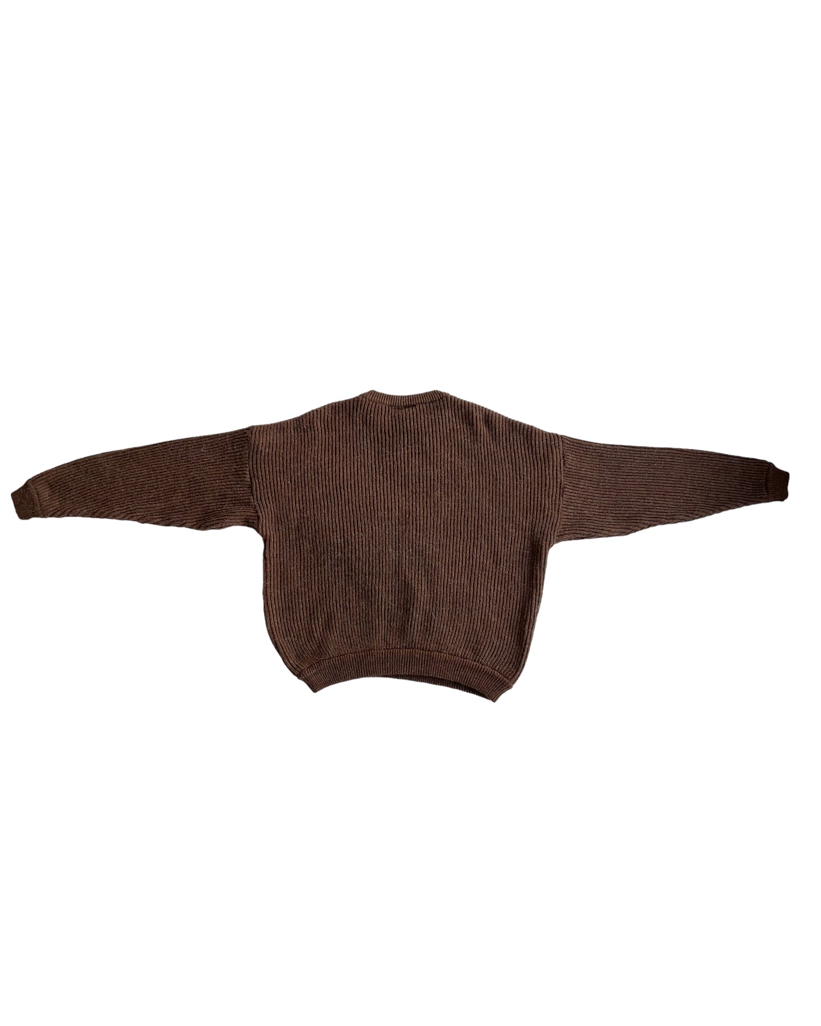 SUÉTER TEJIDO COLOR CAFÉ 60% ACRÍLICO 40% LANA. DOS FRANJAS COLOR CAMELLO CRUZADAS EN EL PECHO.
