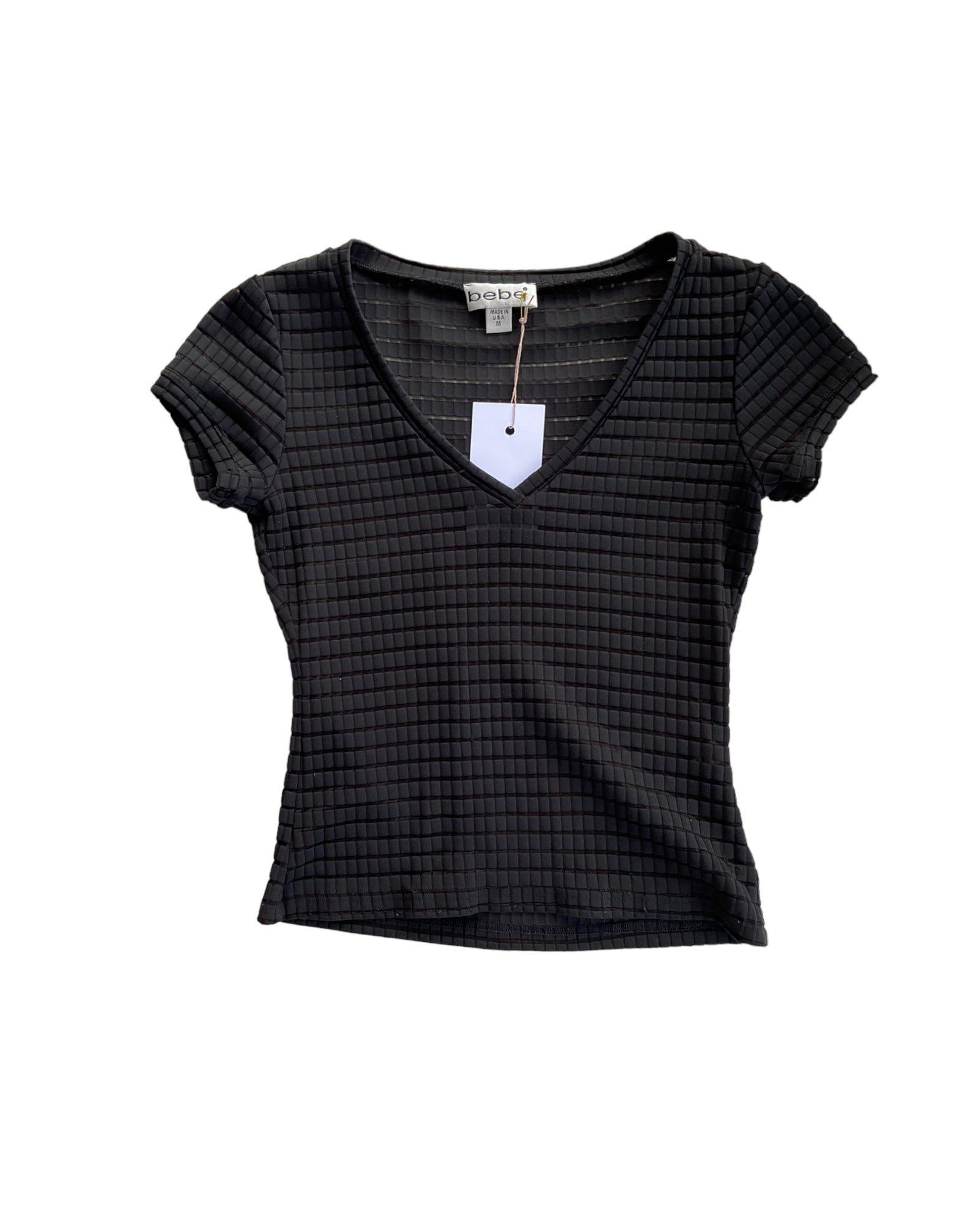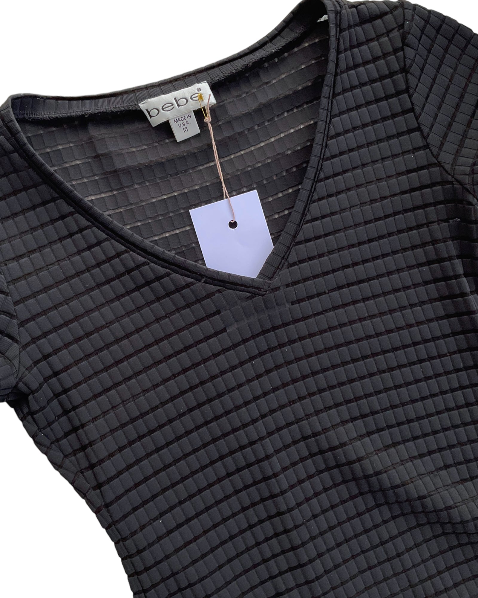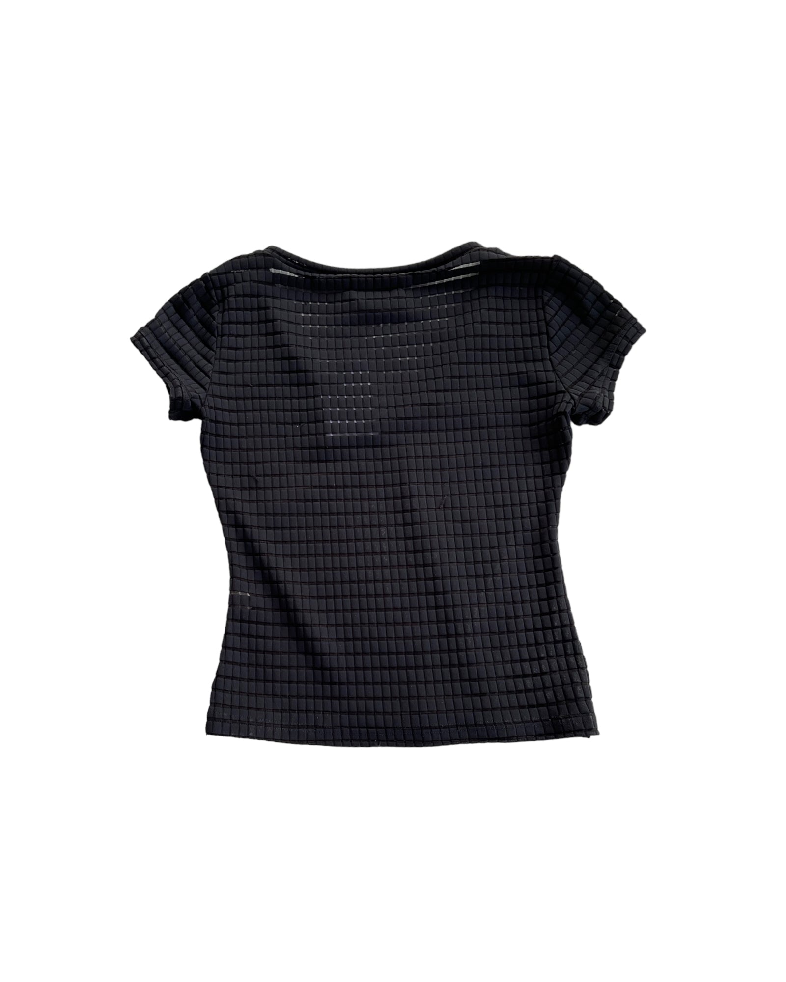 TOP CORTE BABY-TEE DE COLOR NEGRO 91% NAILON 9% LYCRA, CON TRANSPARENCIAS. SIN DETALLES DE USO.