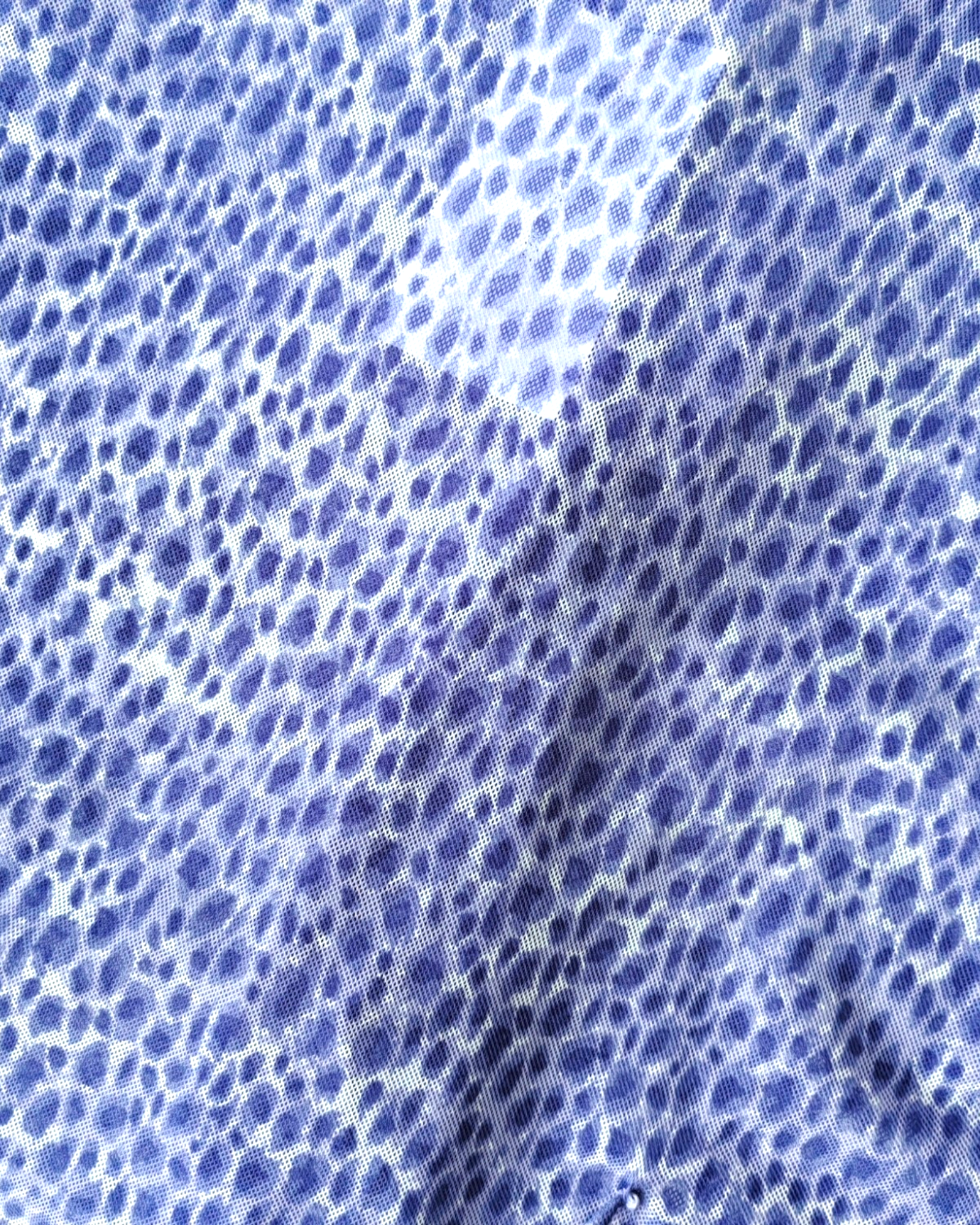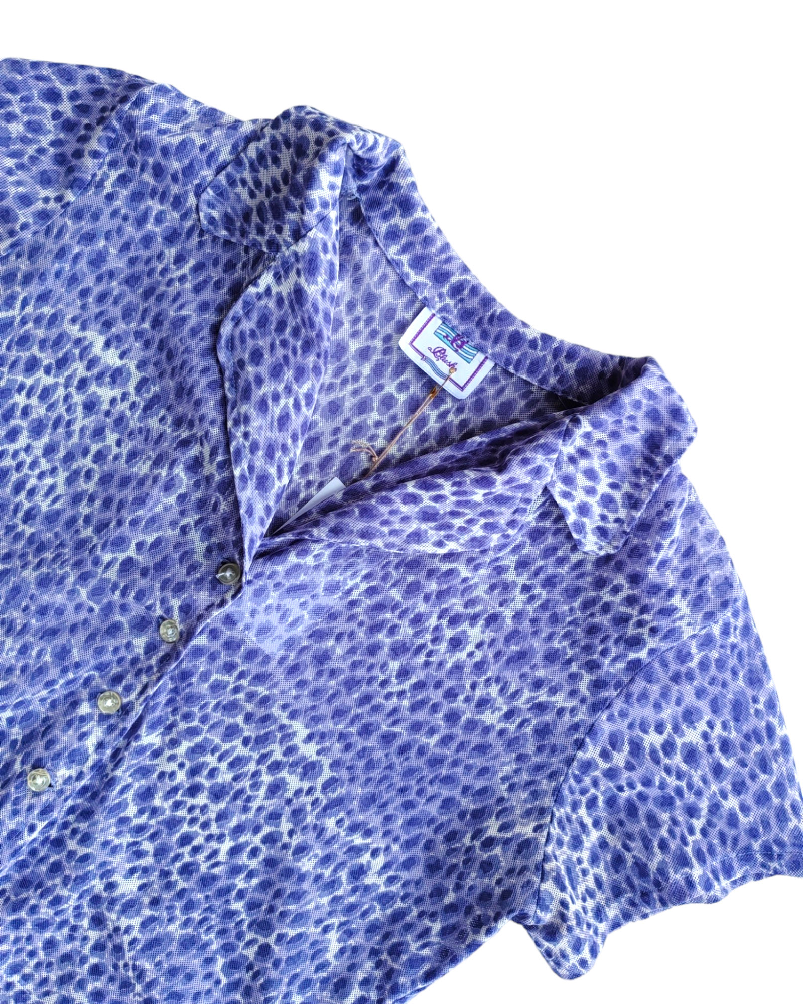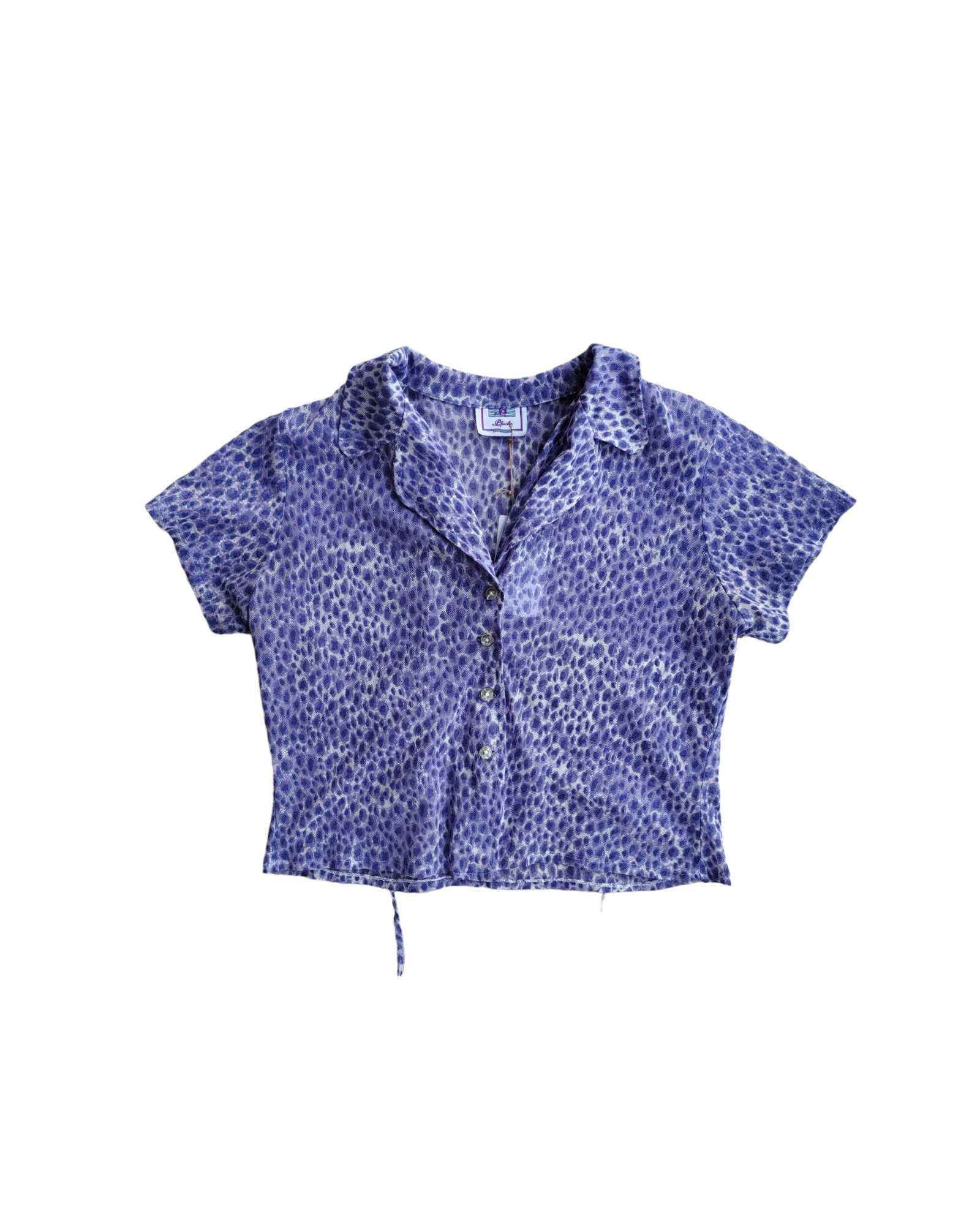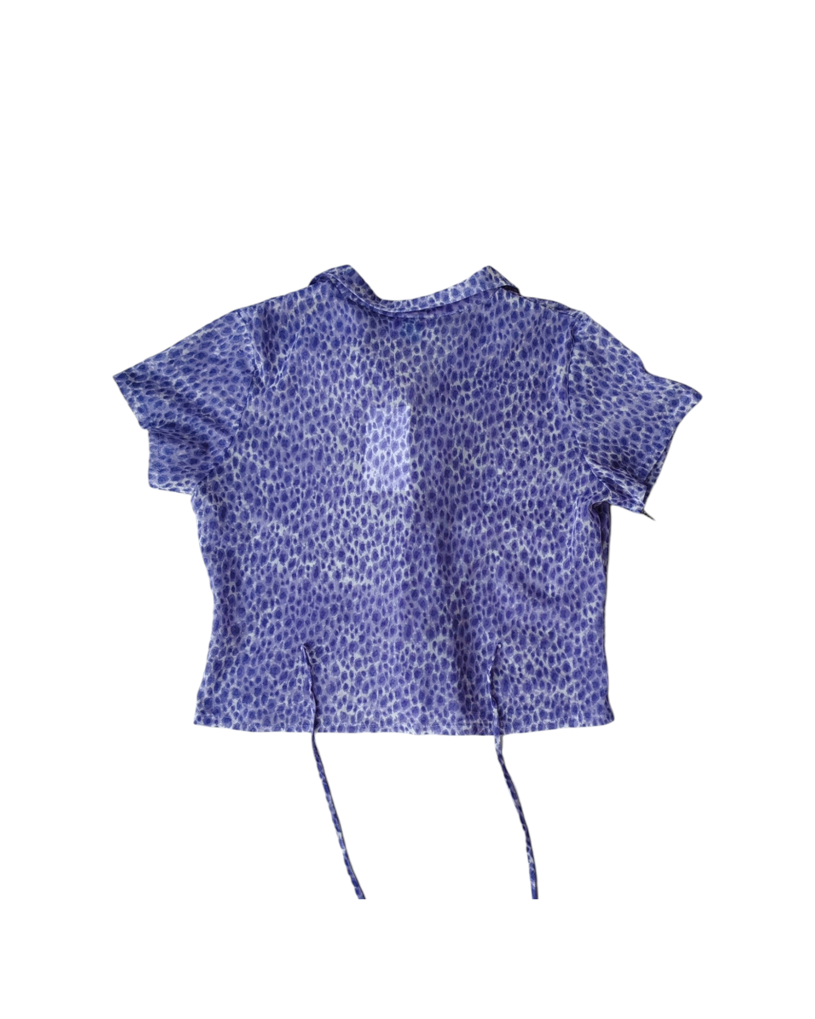 MINI BLUSA DE BOTONES DE MATERIAL TIPO MESH CON ESTAMPADO DE CHEETA EN COLOR MORADO. CUELLO Y MANGAS CORTAS. CORDÓN TRASERO PAR AJUSTAR LA ESPALDA. SIN DETALLES DE USO.