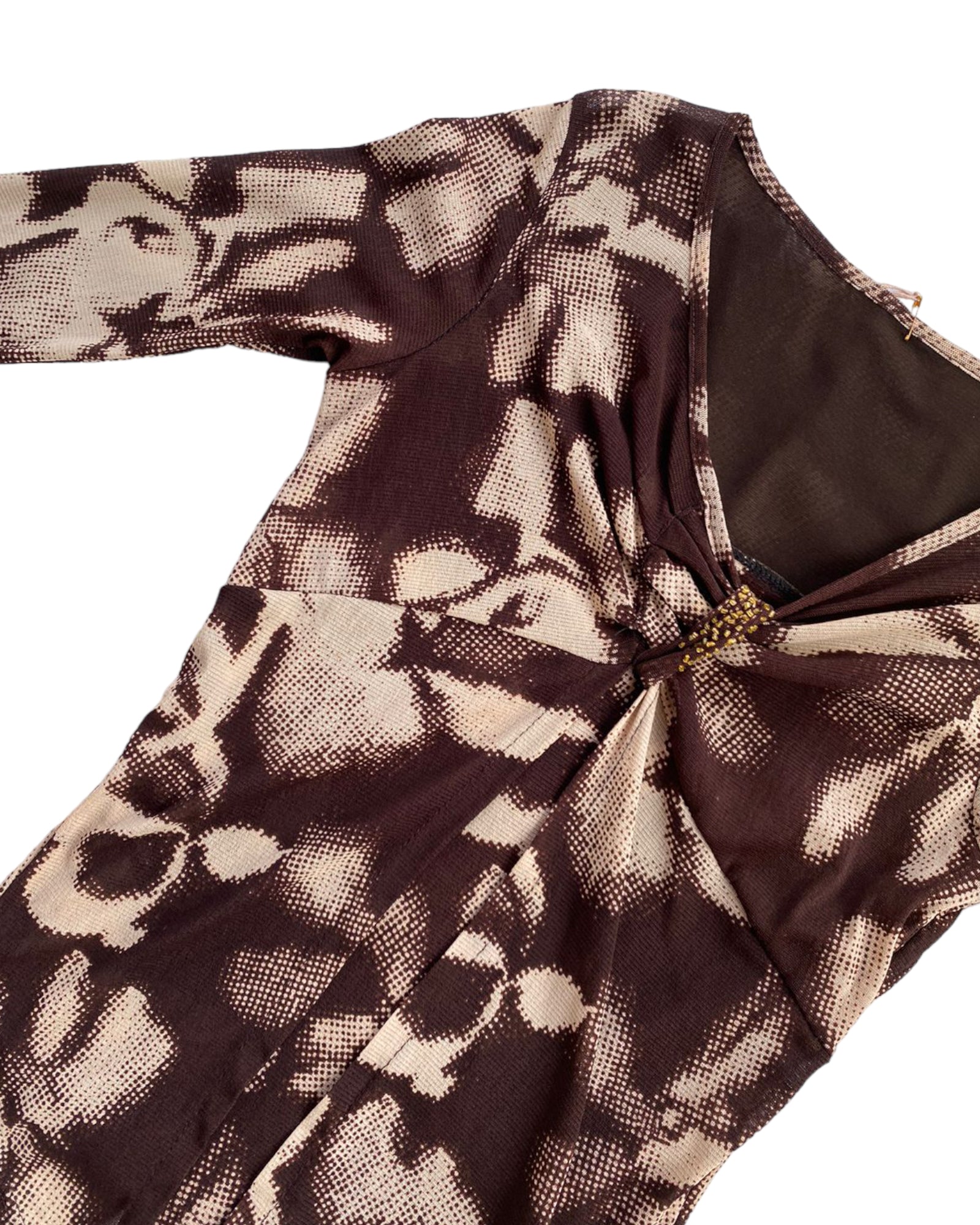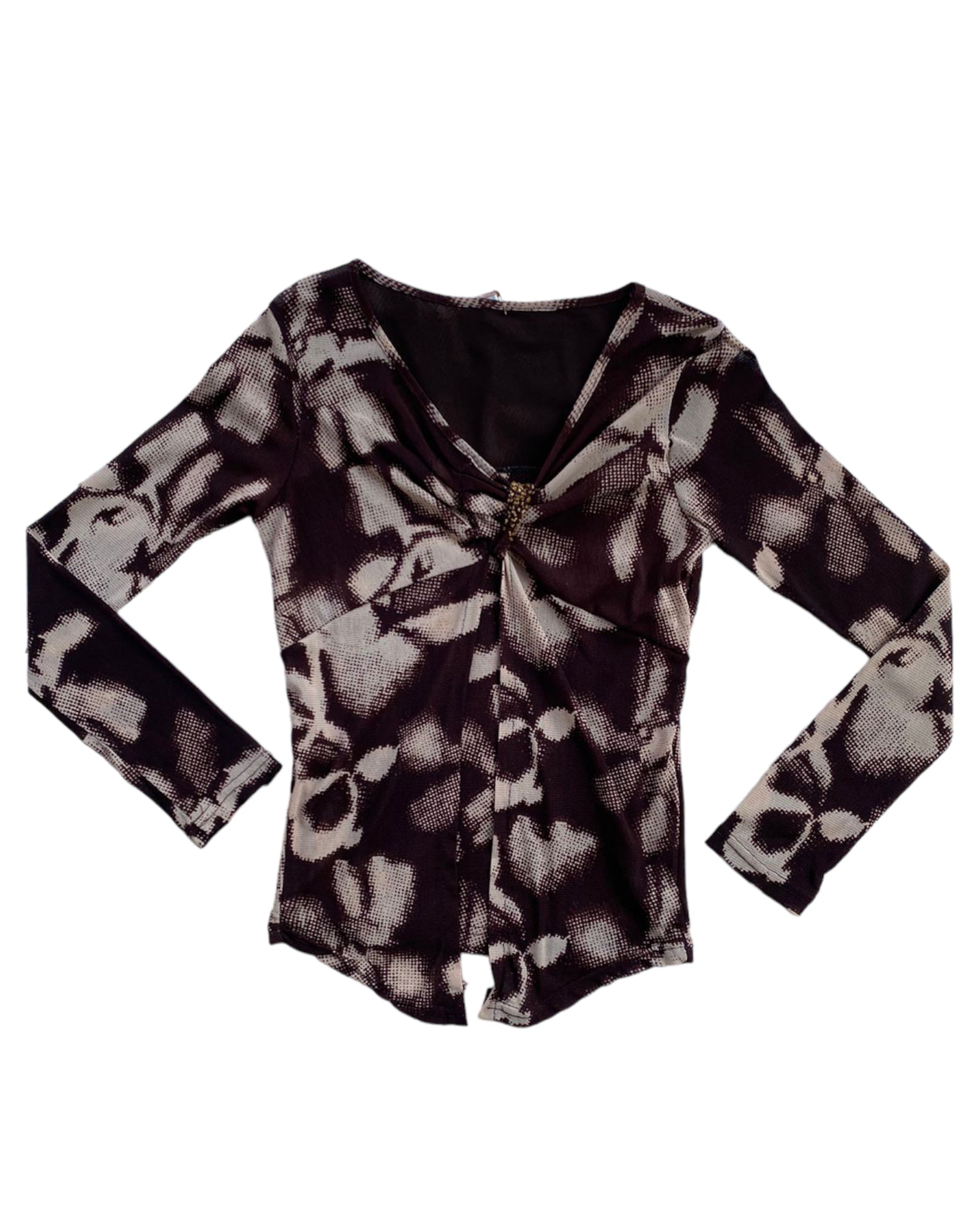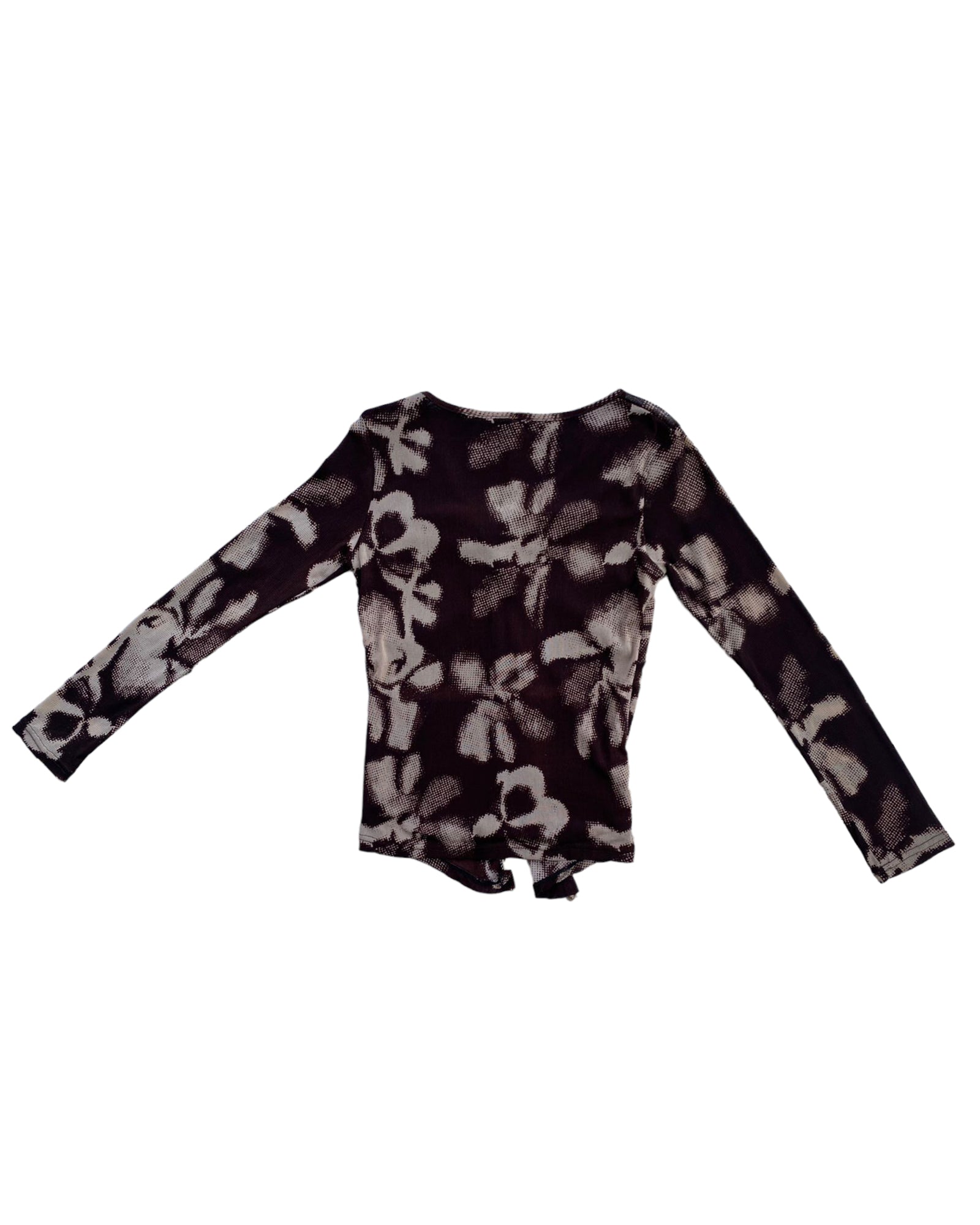 TOP CAFE CON BEIGE DE MANGA LARGA MESH CON FORRO QUE CUBRE EL BUSTO. DETALLE EN MEDIO DEL BUSTO CON PEDRERIA DORADA. MANGAS TRANSPARENTES. SIN DETALLES DE USO.