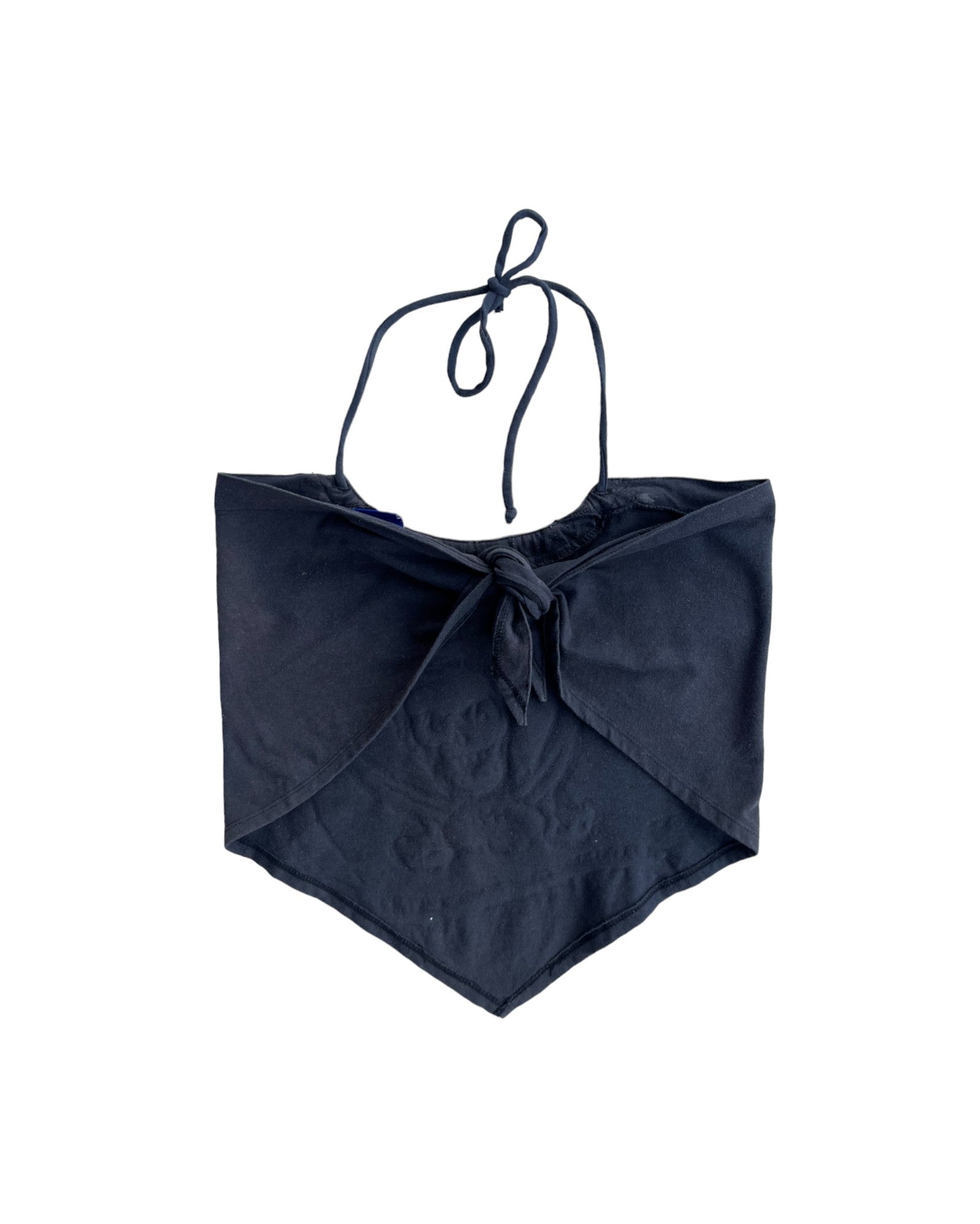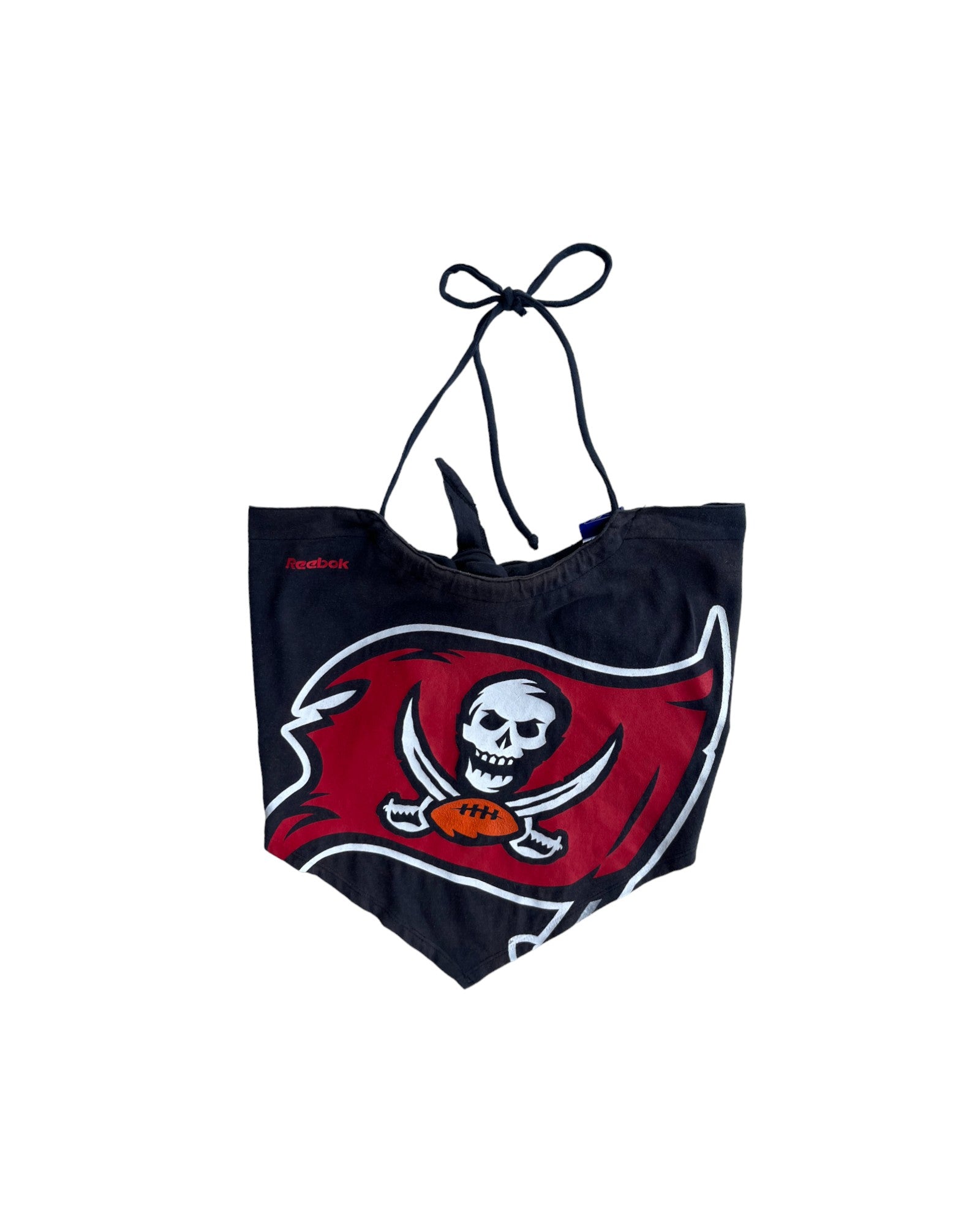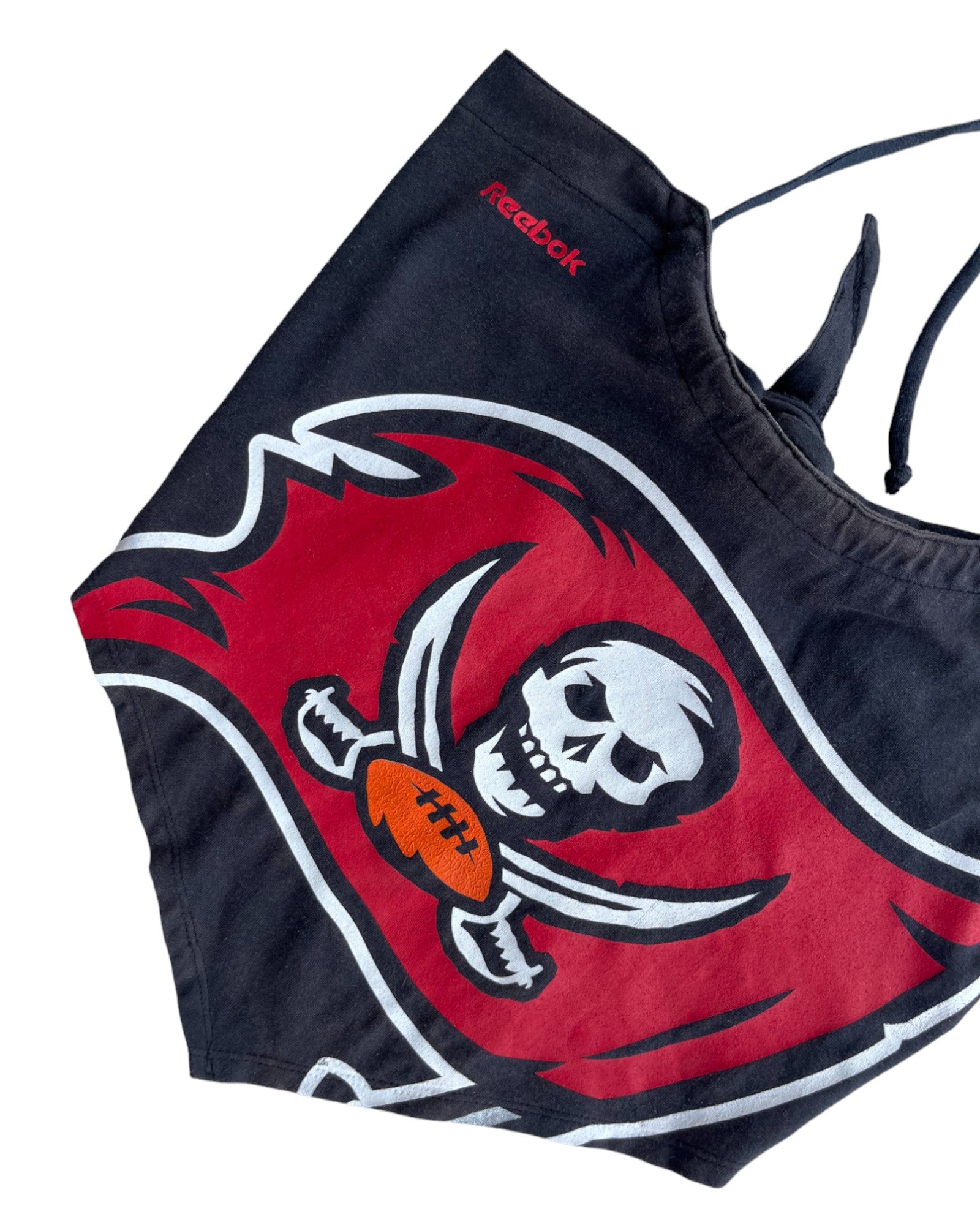 TOP GRIS DE LOS BUCCANEERS DE TAMPA BAY DE LA NFL. LOGO DE REEBOOK Y LOGO DEL EQUIPO. HALTER CON TIRANTES AJUSTABLES AL CUELLO Y NUDO AJUSTABLE EN LA ESPALDA.