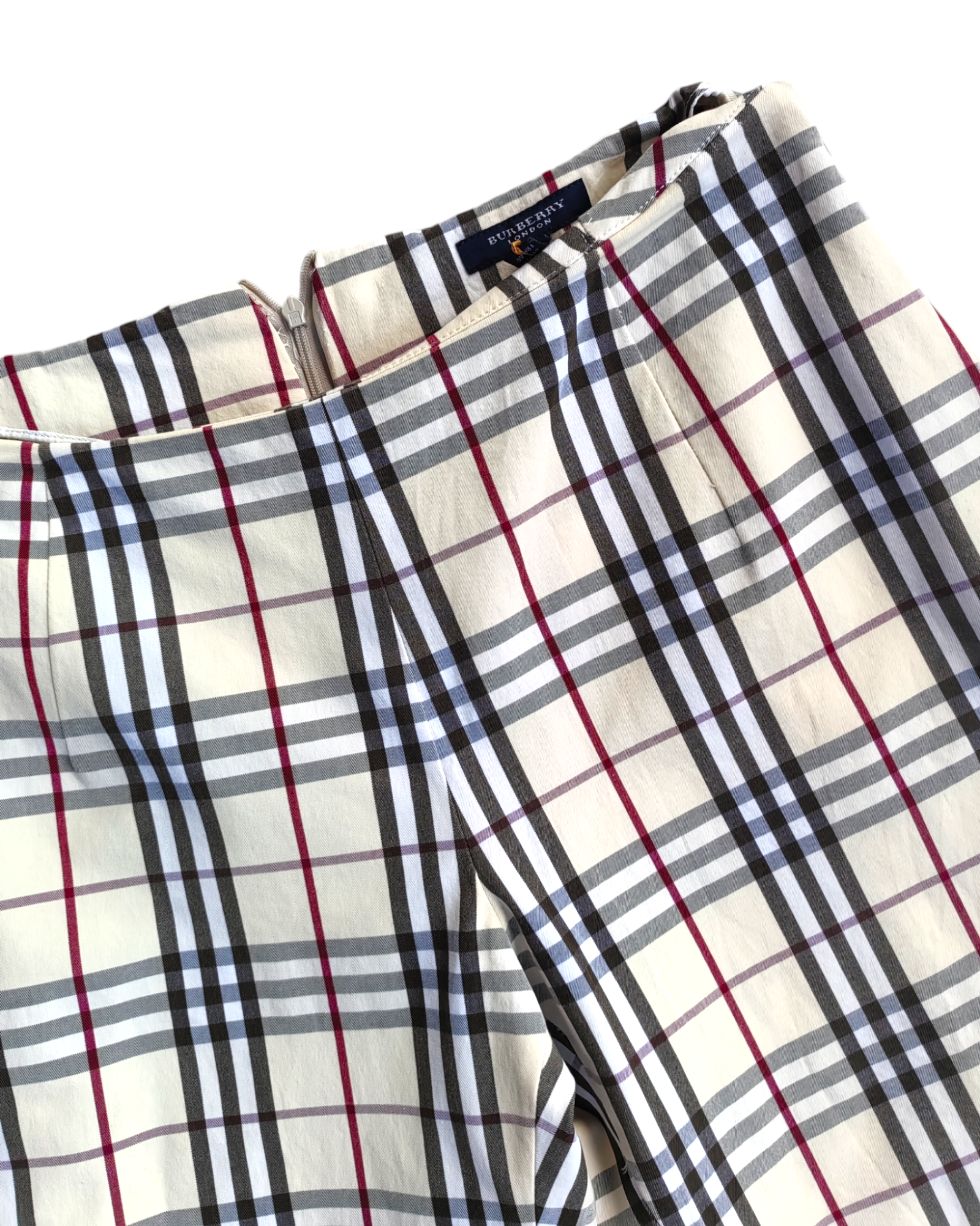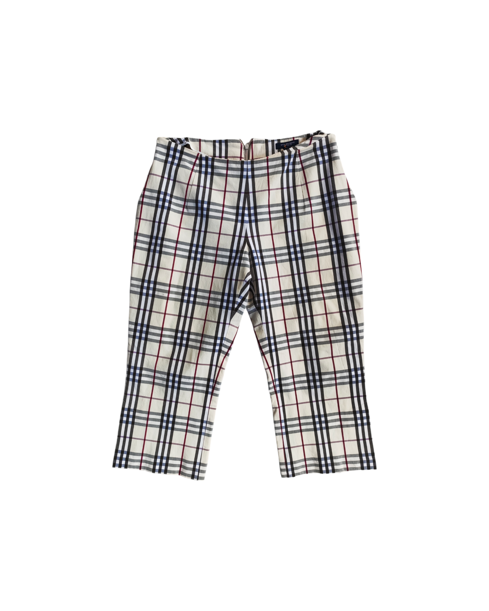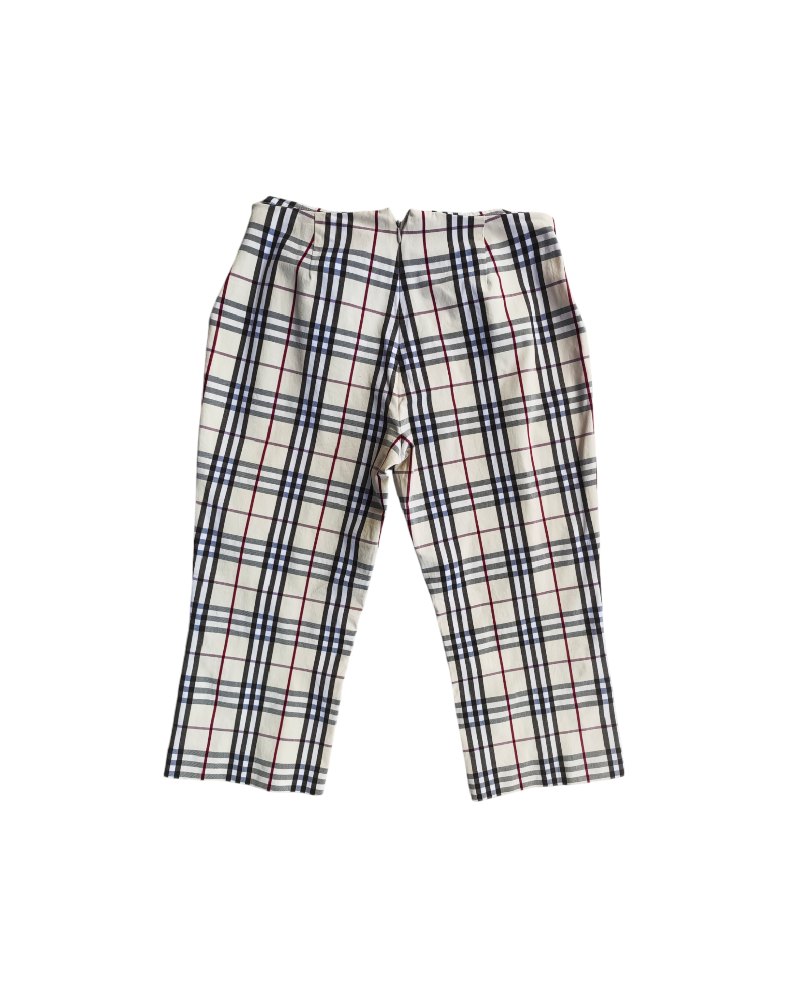 PANTALONES CAPRI CON PATRON ICONICO DE CUADROS DE BURBERRY. ZIPPER EN LA PARTE TRASERA Y NO TIENE BOLSILLOS EN NINGUN LADO. SIN DETALLES DE USO.