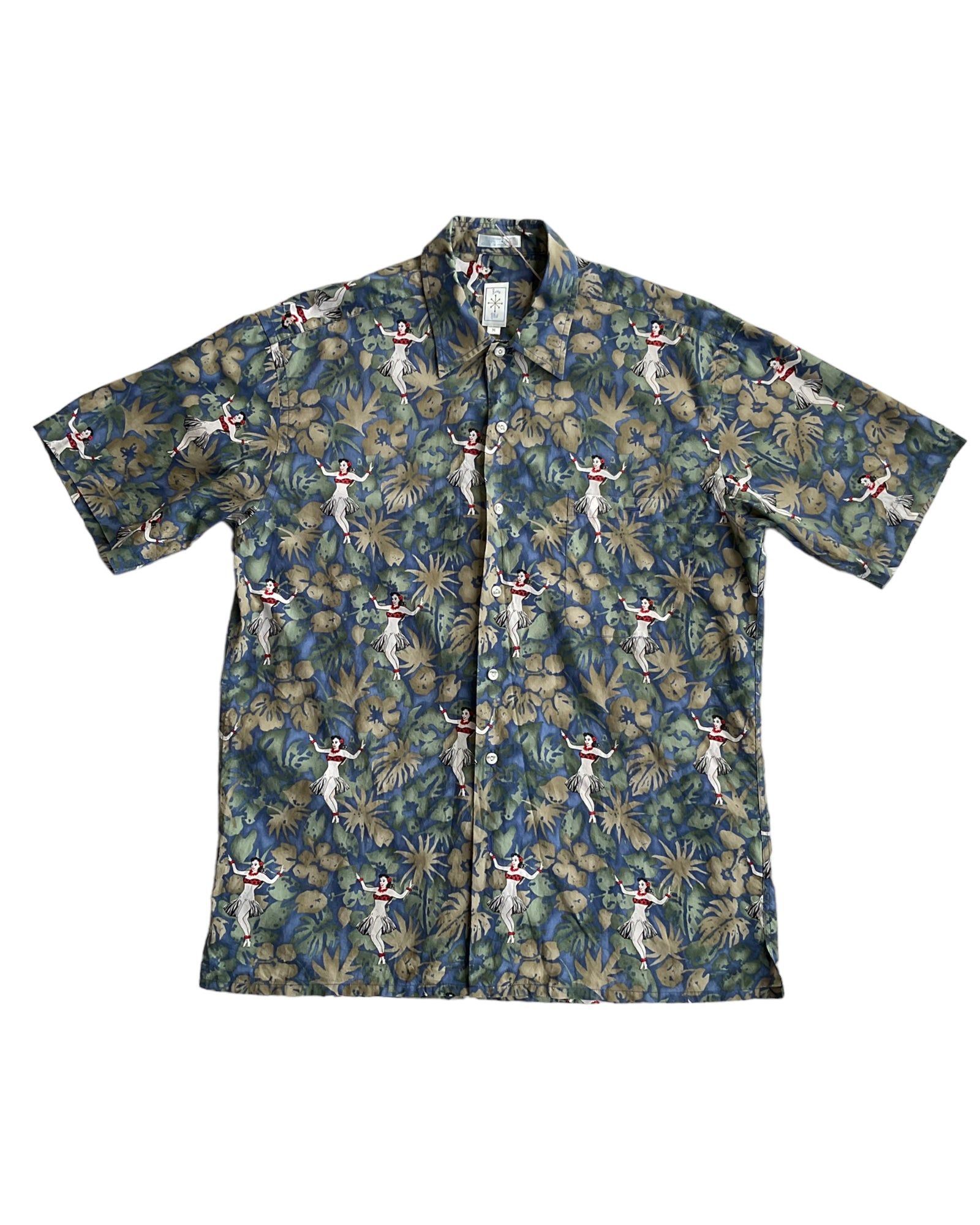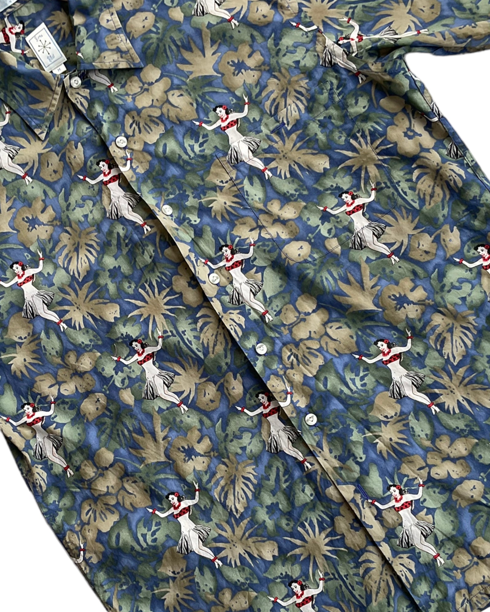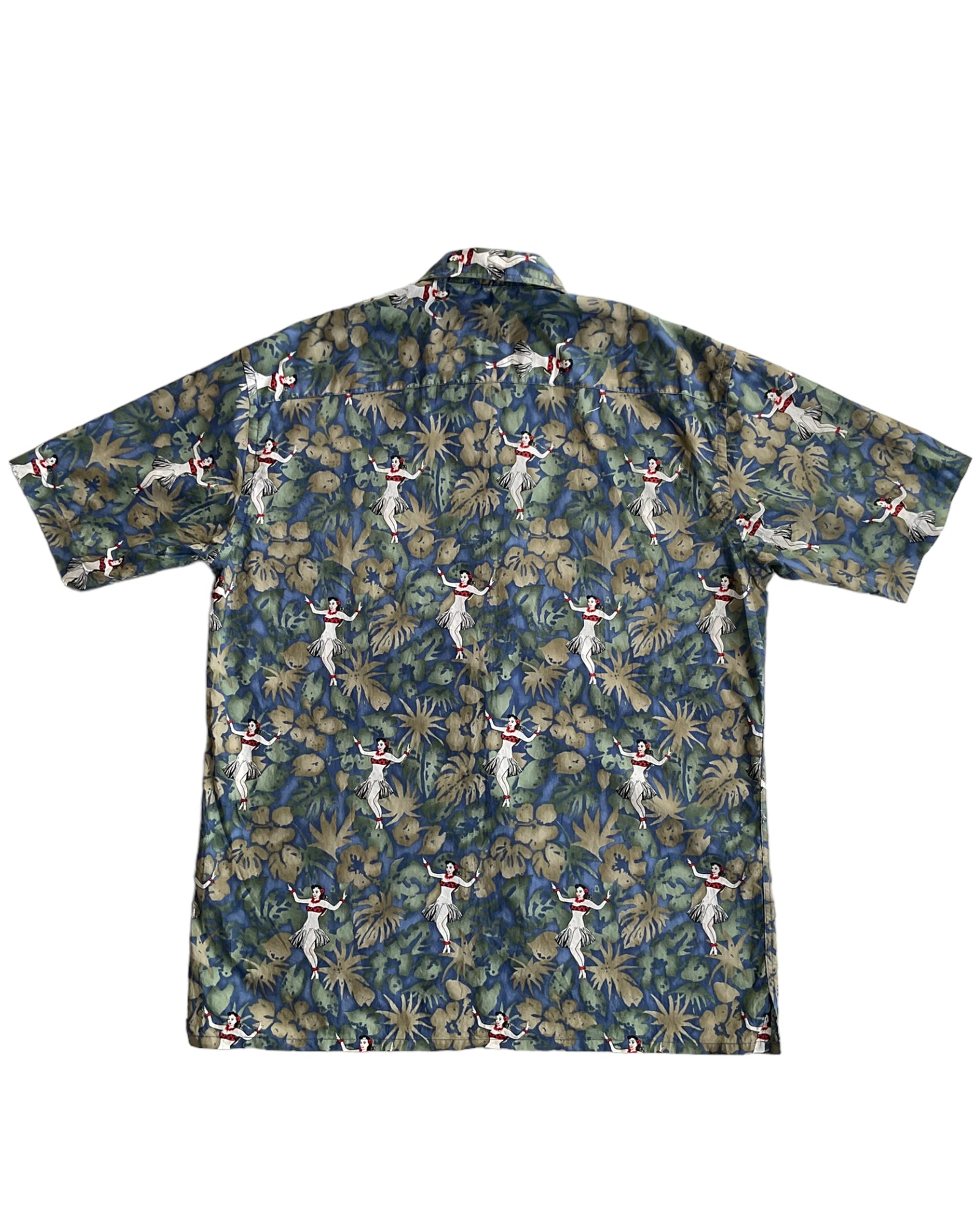 CAMISA DE BOTONES 100% ALGODÓN DE COLOR VERDE CON ESTAMPADO DE HOJAS, FLORES Y MUJERES HAWAIIANAS EN COLORES AMARILLO, Y VERDE CLARO. BOLSILLO FRONTAL. SIN DETALLES DE USO