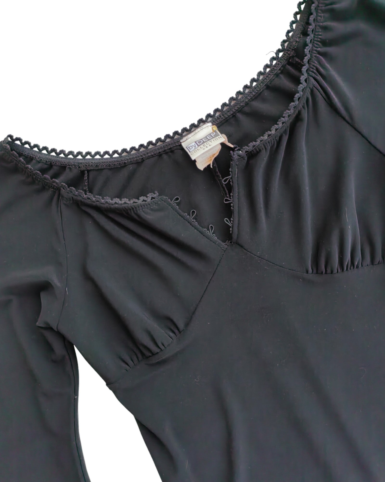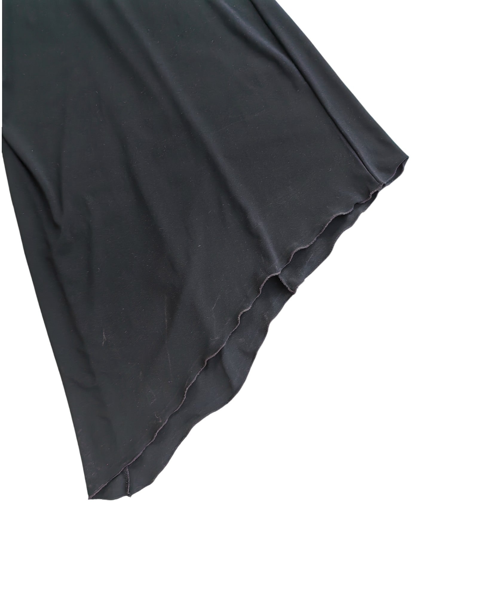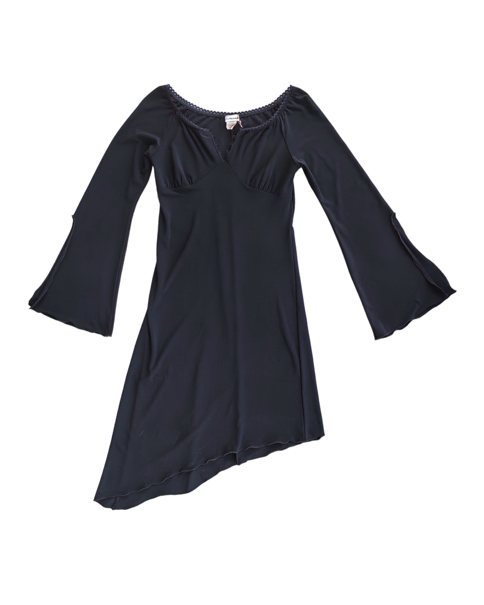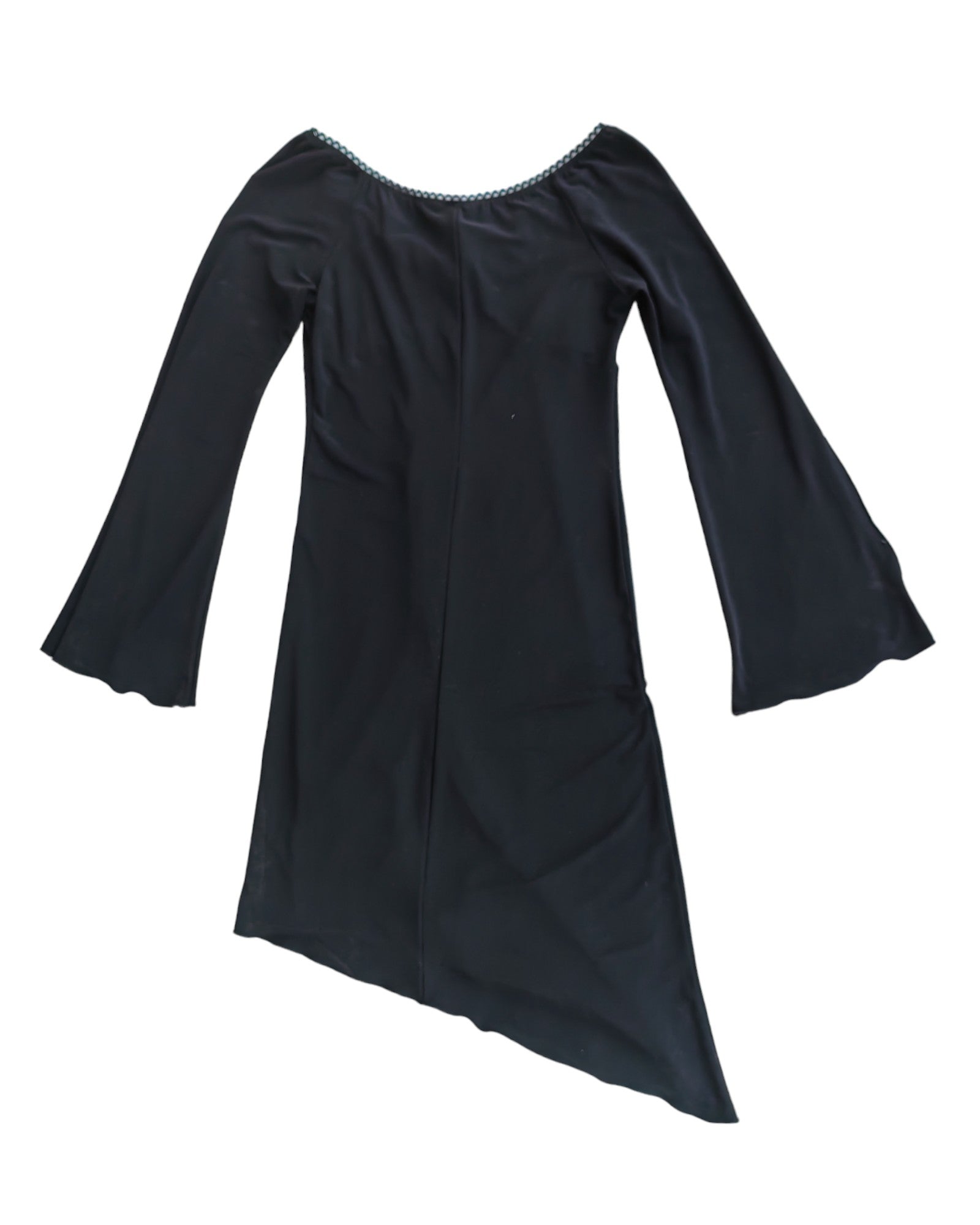 VESTIDO SLIP ON MANGA LARGA 90% POLIÉSTER 10% ELASTANO, CON APERTUNAS EN LAS MANGAS, ESCOTE EN V. ELÁSTICO EN LOS HOMBROS. CORTE ASIMÉTRCO EN LA FALDA. SIN DETALLES DE USO.