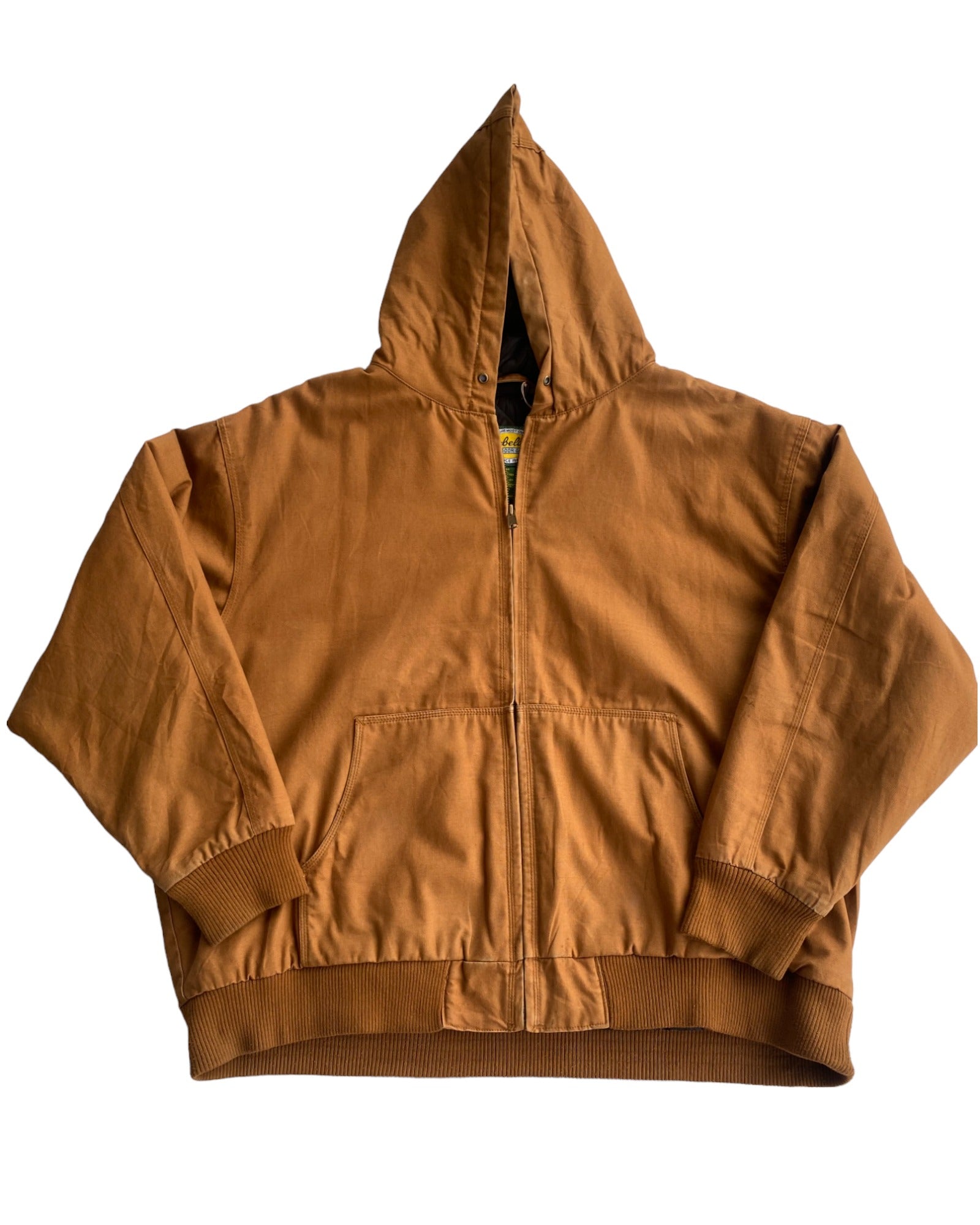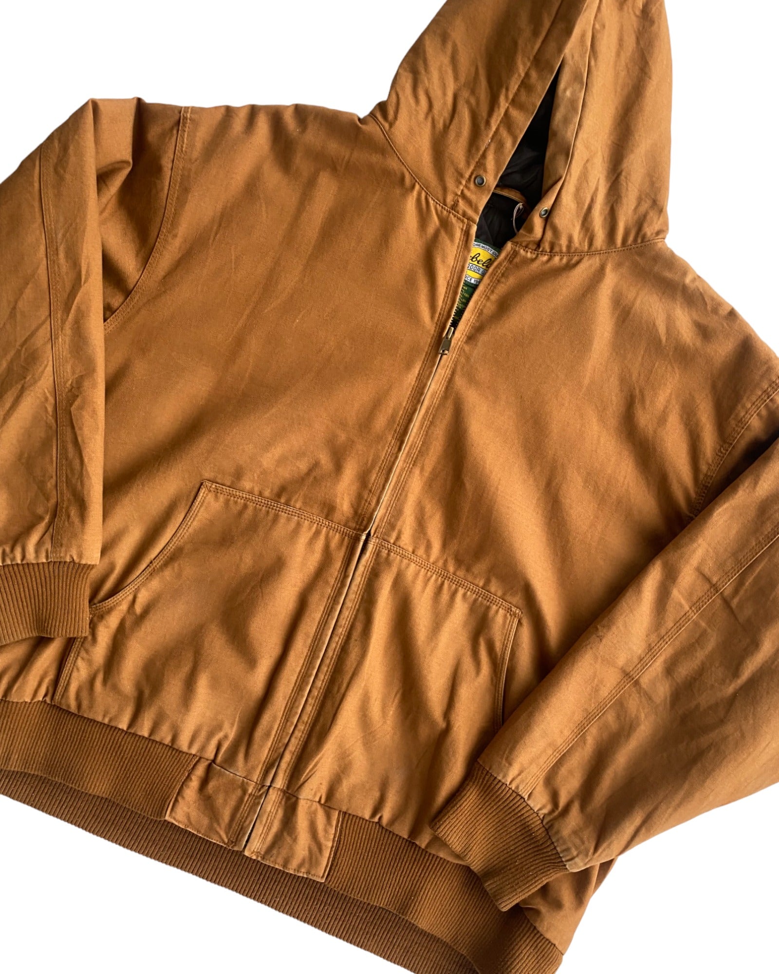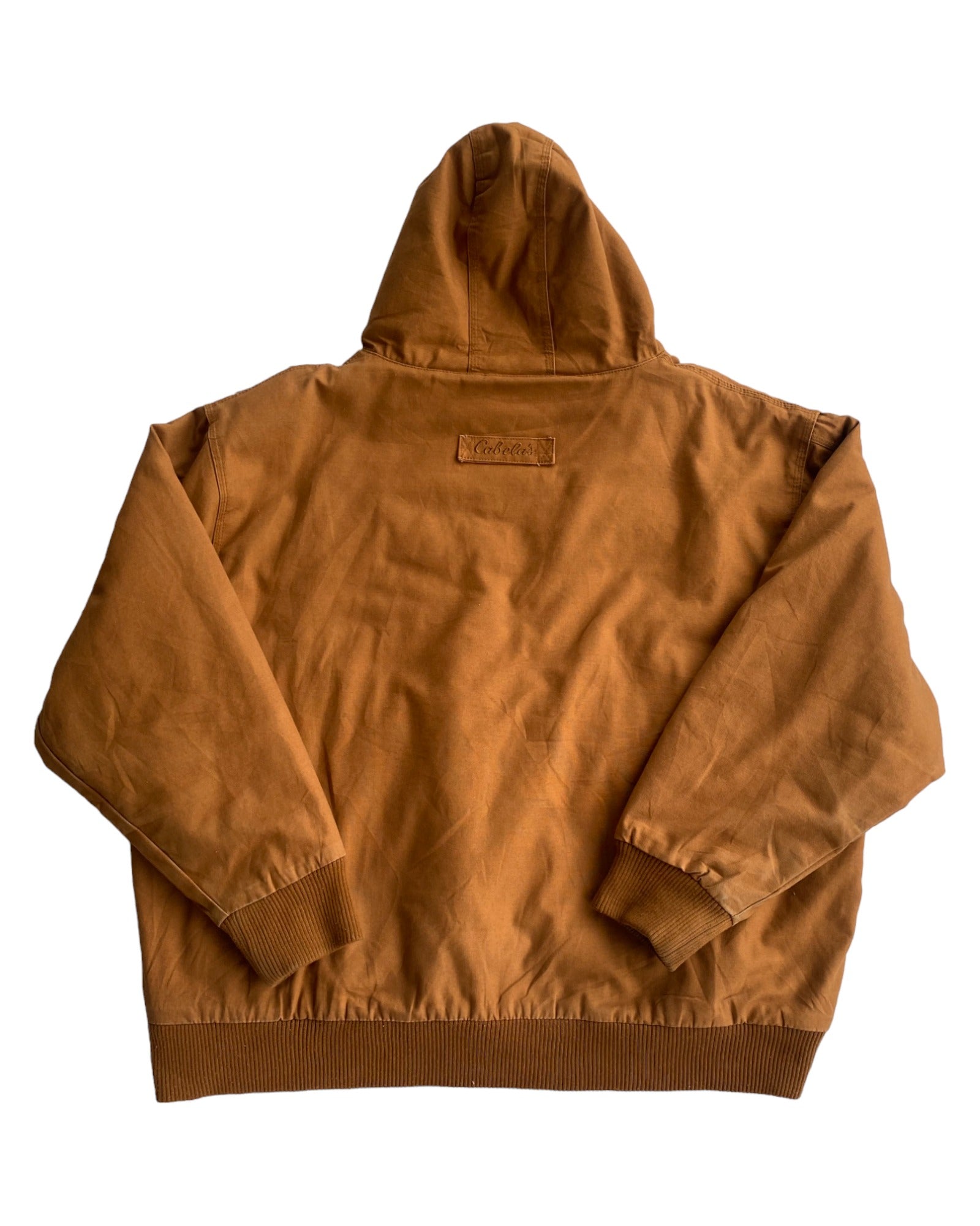 CHAQUETA CABELA CAFÉ CLARO CON CAPUCHA, EXTERIOR 100% ALGODÓN, FORRO 100% NAYLON Y RELLENO 100% POLIÉSTER. BOLITAS DE DESGASTE EN LOS PUÑOS Y ELÁSTICO DE LA CINTURA POR EL USO.